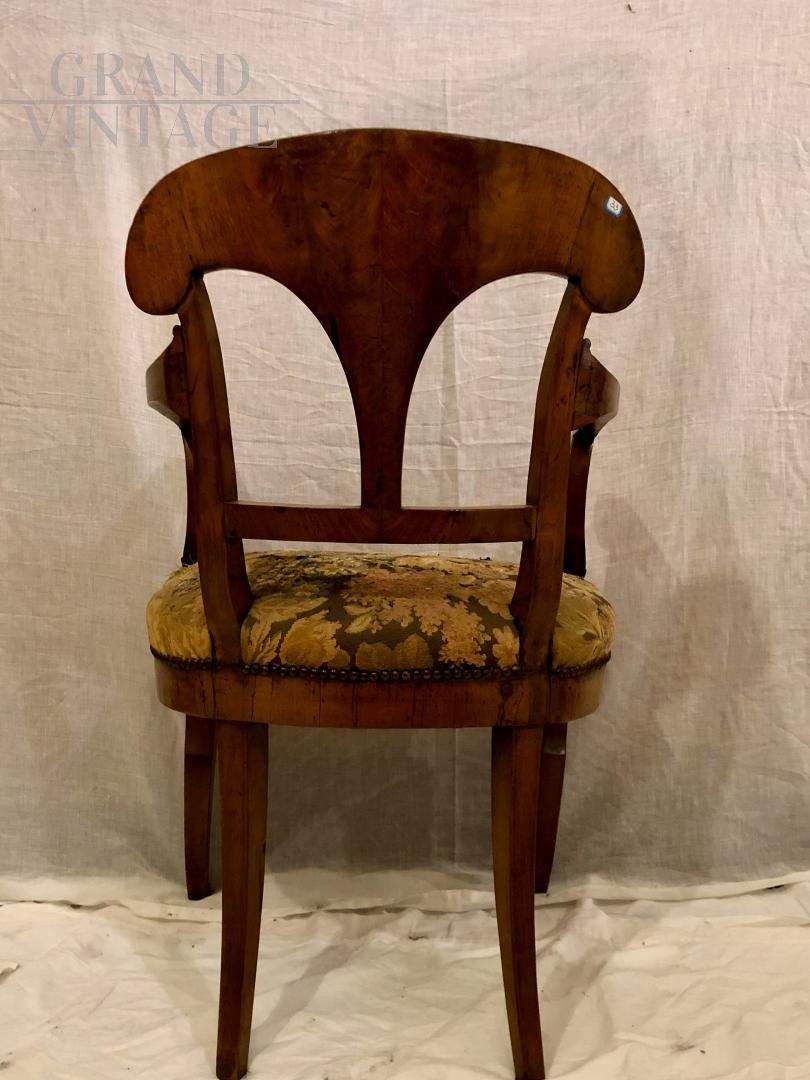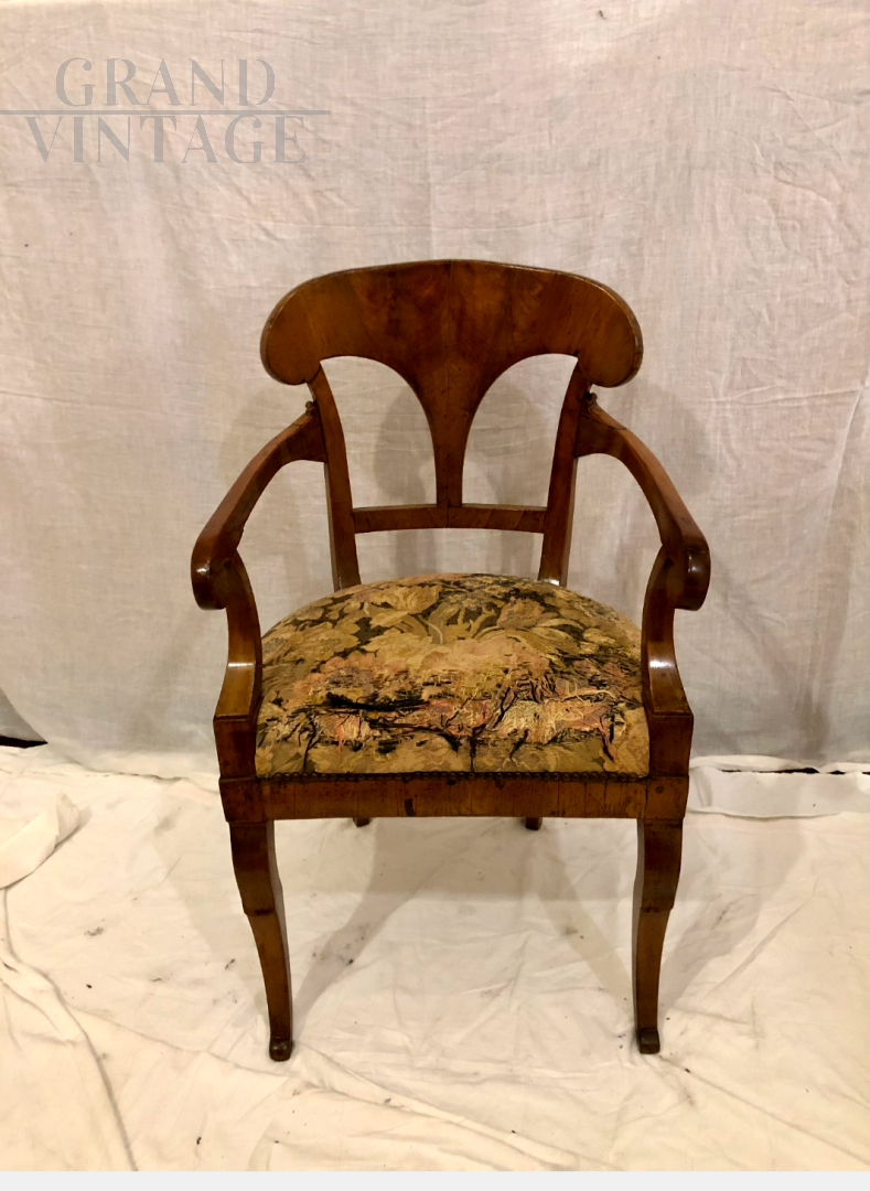 Poltrona antica del periodo Biedermeier lastronata in legno di noce originale del 1815 - 1820.