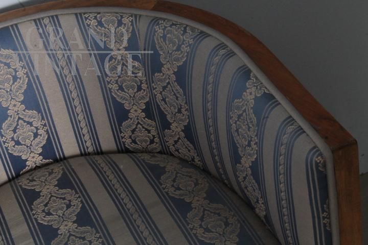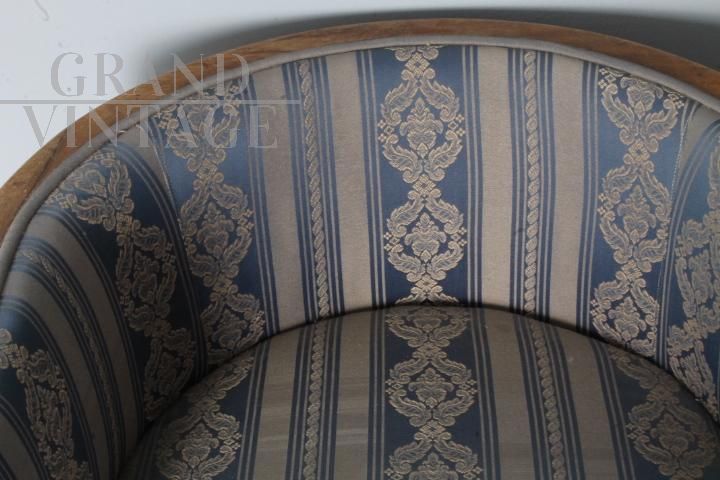 Antica poltrona art déco curva dalla forma a pozzetto in legno di noce, con una ricca imbottitura e tappezzeria rifatta a nuovo, Italia anni '30, perfetta da centro.