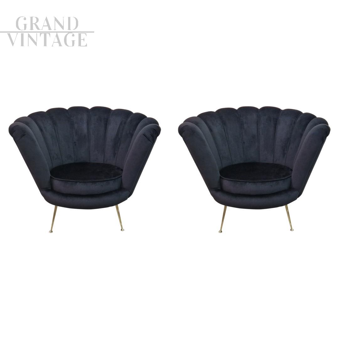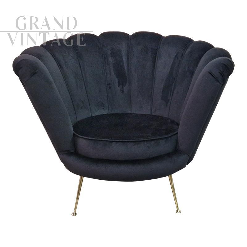 Poltrona design a ventaglio in tessuto nero e ottone