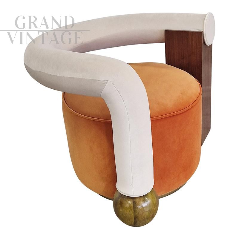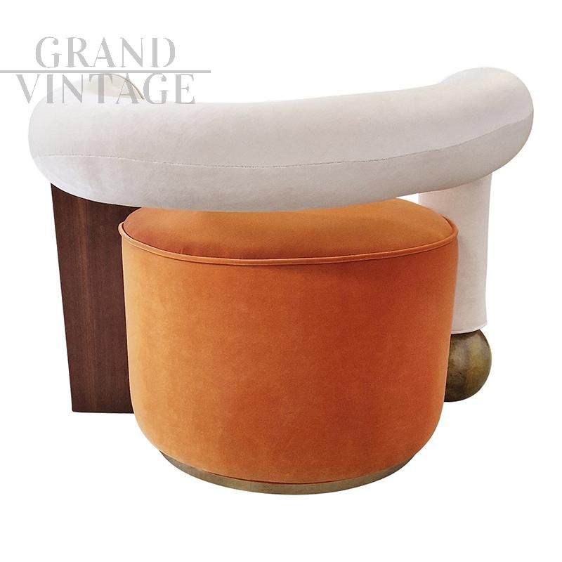 Poltrona design geometrica composta da una seduta a pouf in velluto arancio e uno schienale curvo bianco con sostegno a colonna in legno scuro. Da notare la sfera in legno laccato, dettaglio geometrico. La basa della seduta è arricchita da un profilo tondo in ottone.