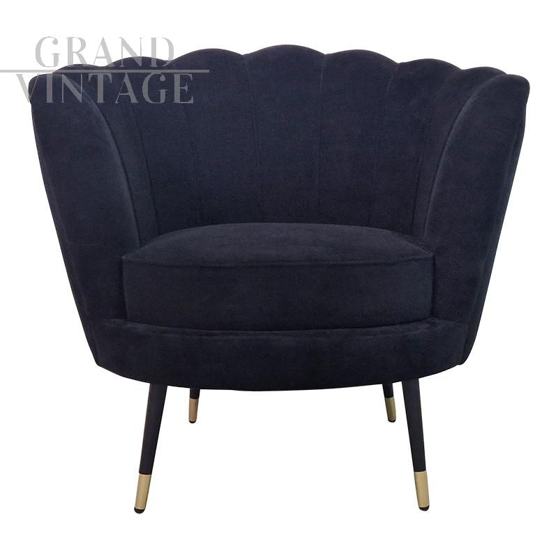 Elegante e comoda poltrona imbottita dalla forma accogliente e dallo stile glamour, con struttura in legno a semicerchio che include schienale e braccioli, rivestimento in tessuto di cotone nero e gambe a spillo nere con finiture in ottone dorato. Disponibili diversi pezzi.