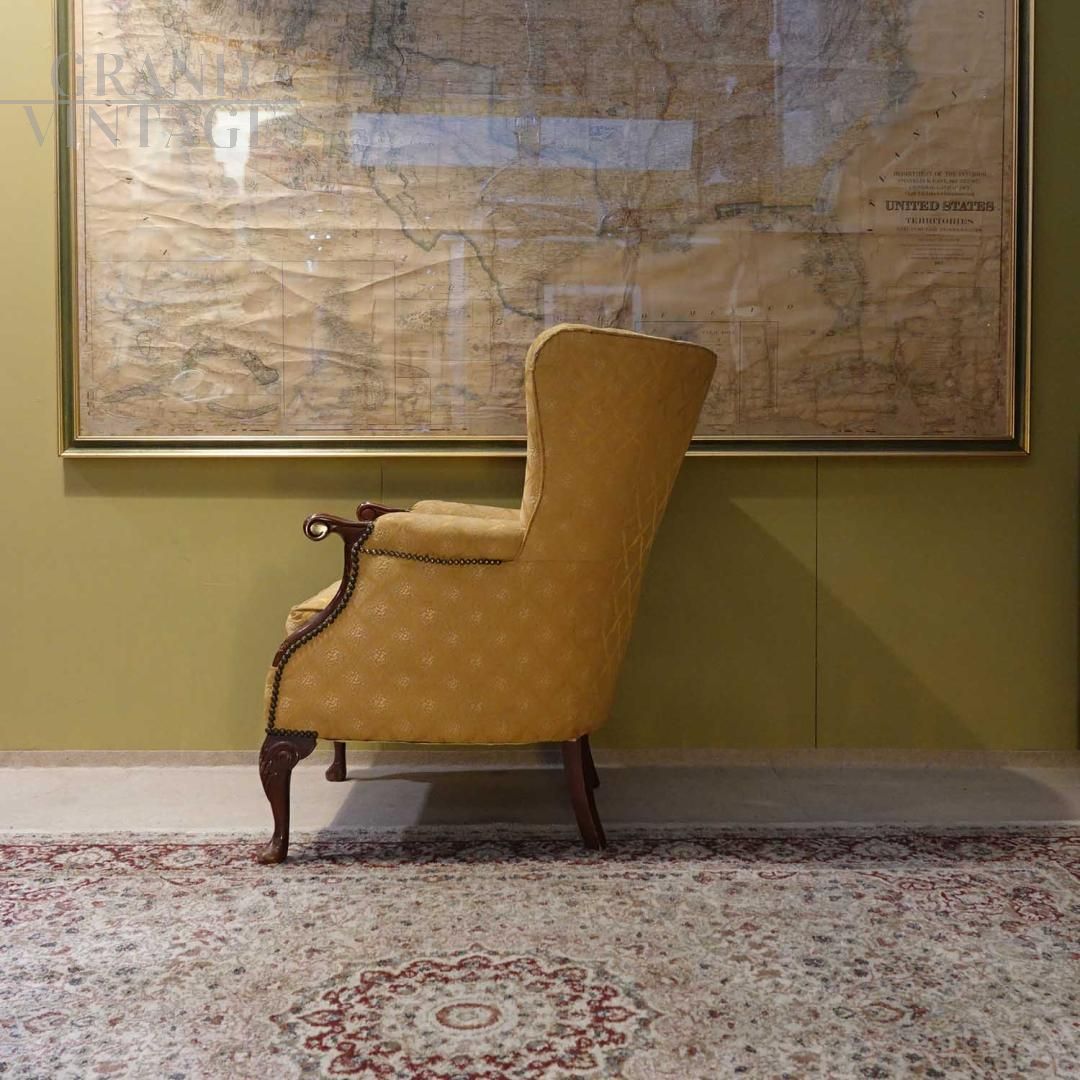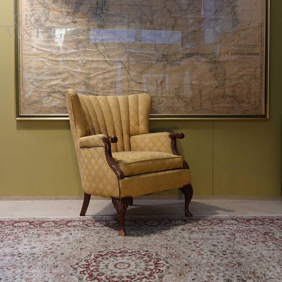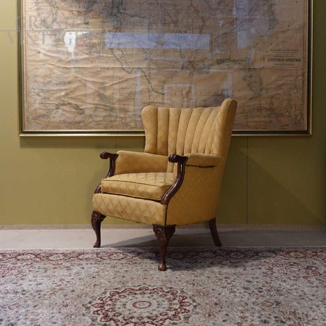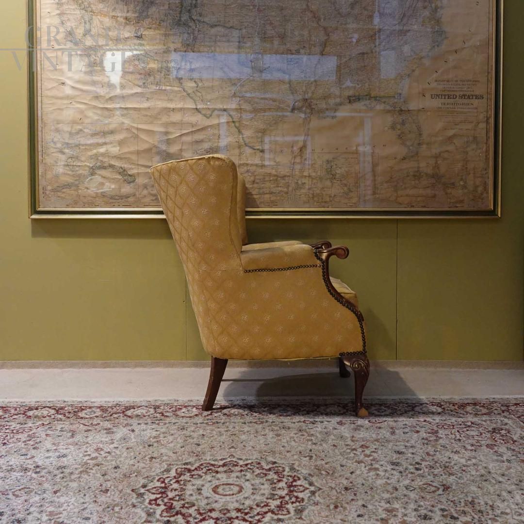Poltrona danese anni ’50, emblema del design scandinavo del dopoguerra, rivestita in tessuto giallo con fantasie floreali, è caratterizzata da linee pulite, forme organiche e un’estetica minimalista, unisce eleganza sobria e comfort funzionale. Perfetta per arredamenti Mid-Century Modern, interni nordici o ambienti dal gusto essenziale e ricercato.