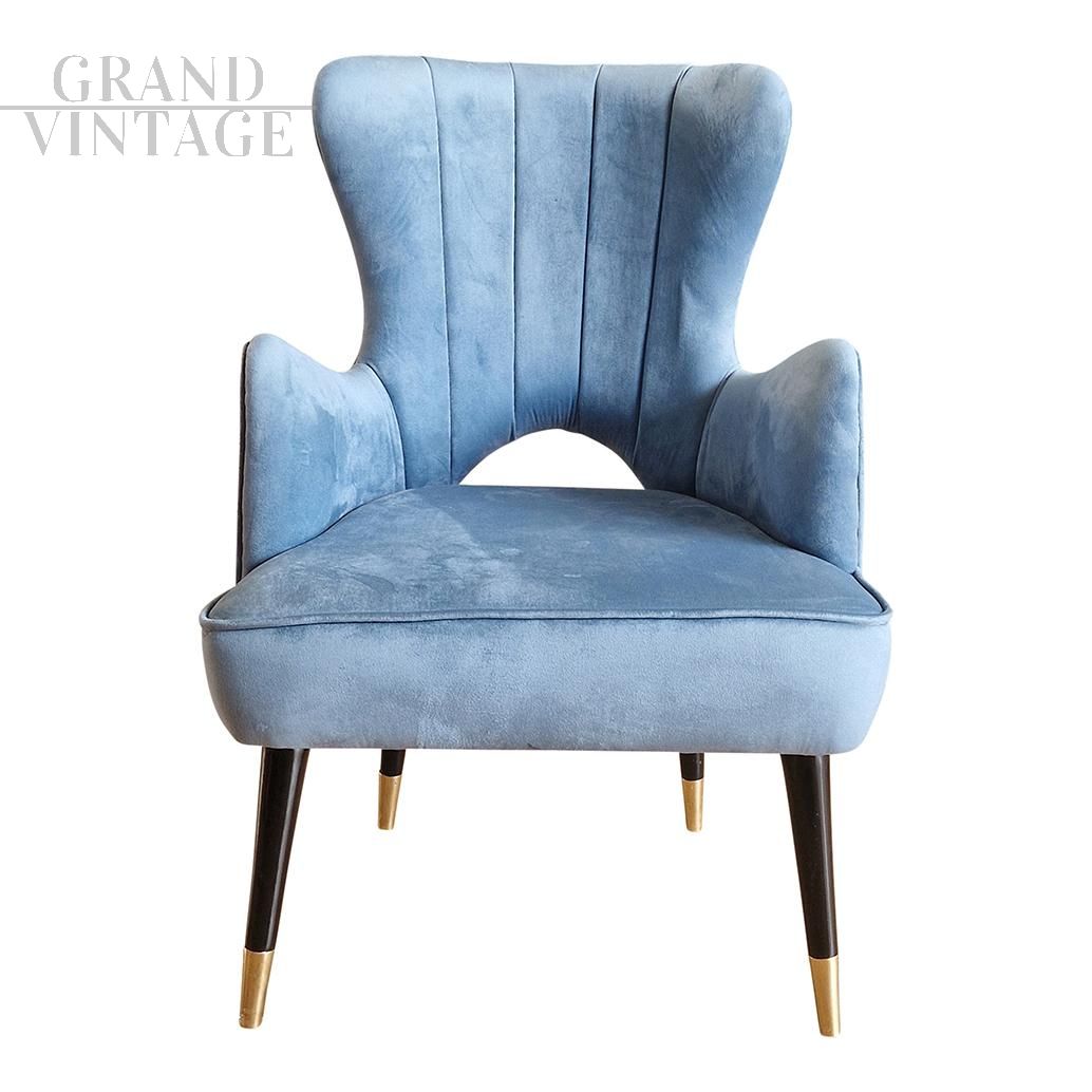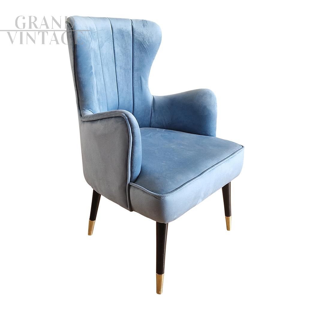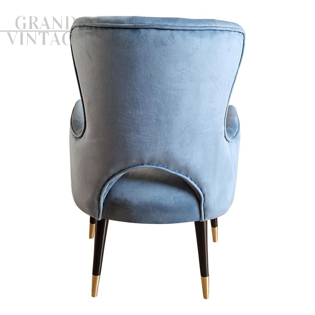 Poltrona design in stile art déco in velluto azzurro con piedi in legno laccato nero e finale in ottone.