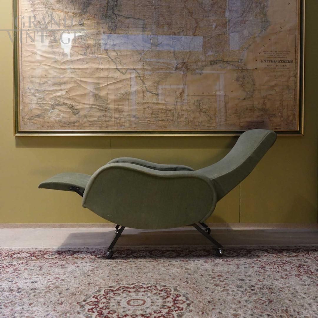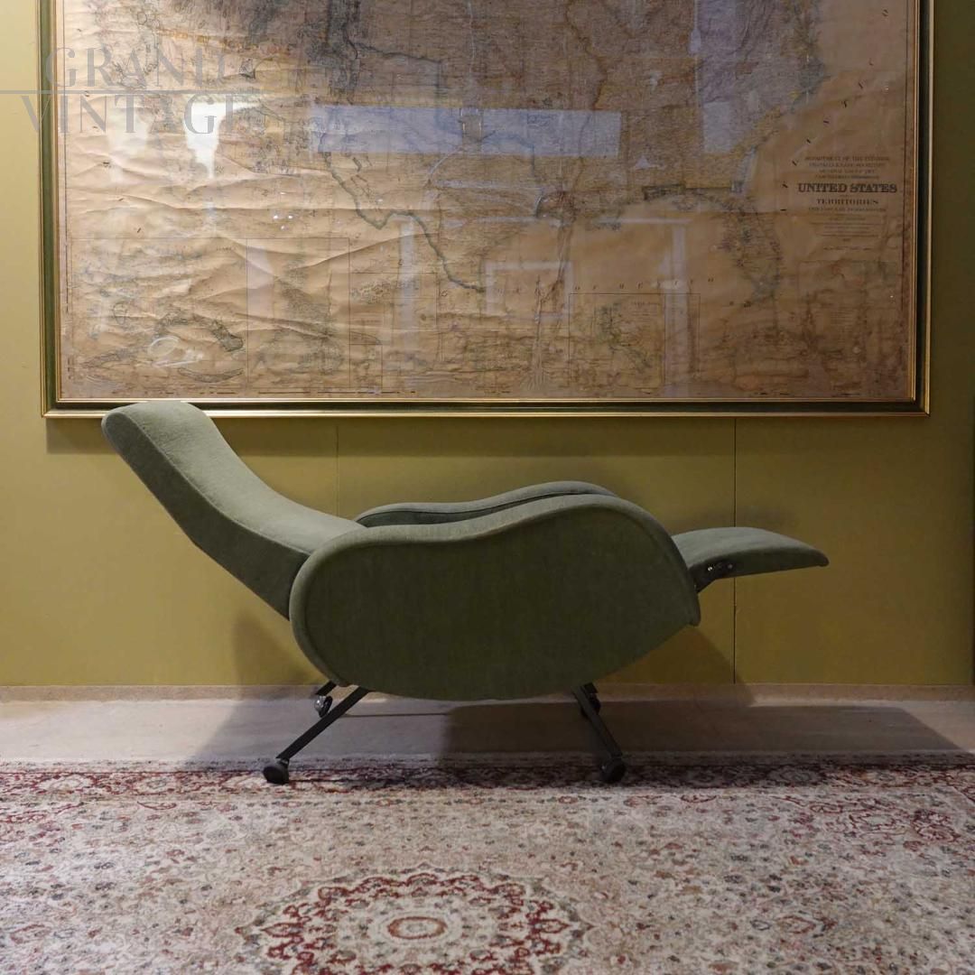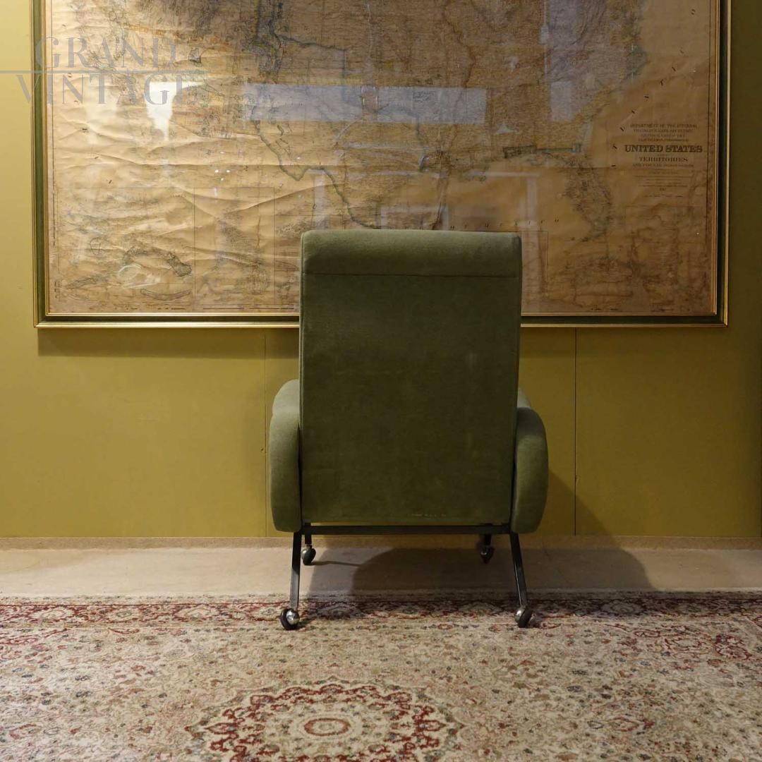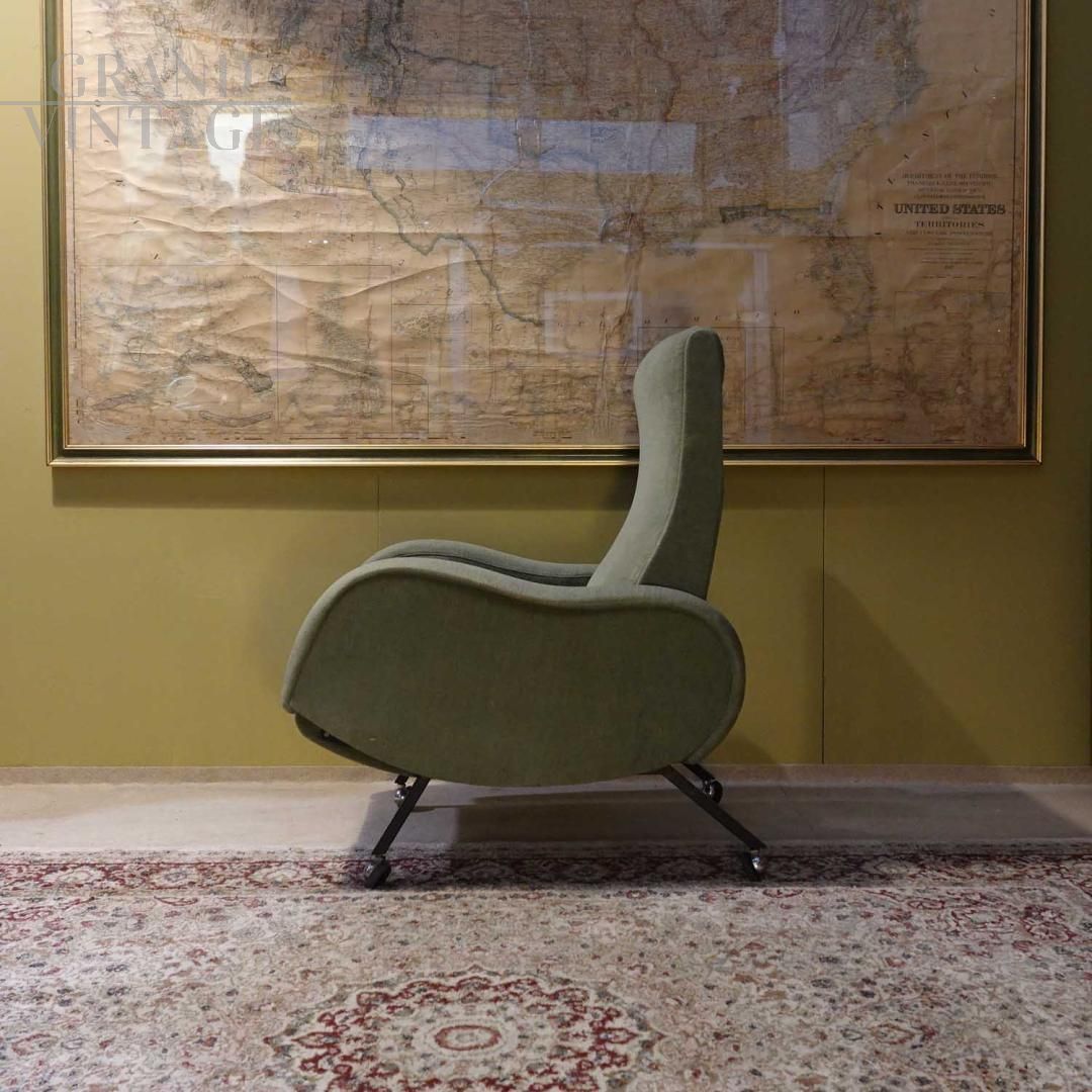 Poltrona in stile Lady reclinabile rivestita in velluto verde salvia, dotata di rotelle, dal design femminile, raffinato e avvolgente. Le sue forme morbide e il rivestimento elegante la rendono ideale per camere da letto, salotti sofisticati o angoli boudoir dallo charme vintage.