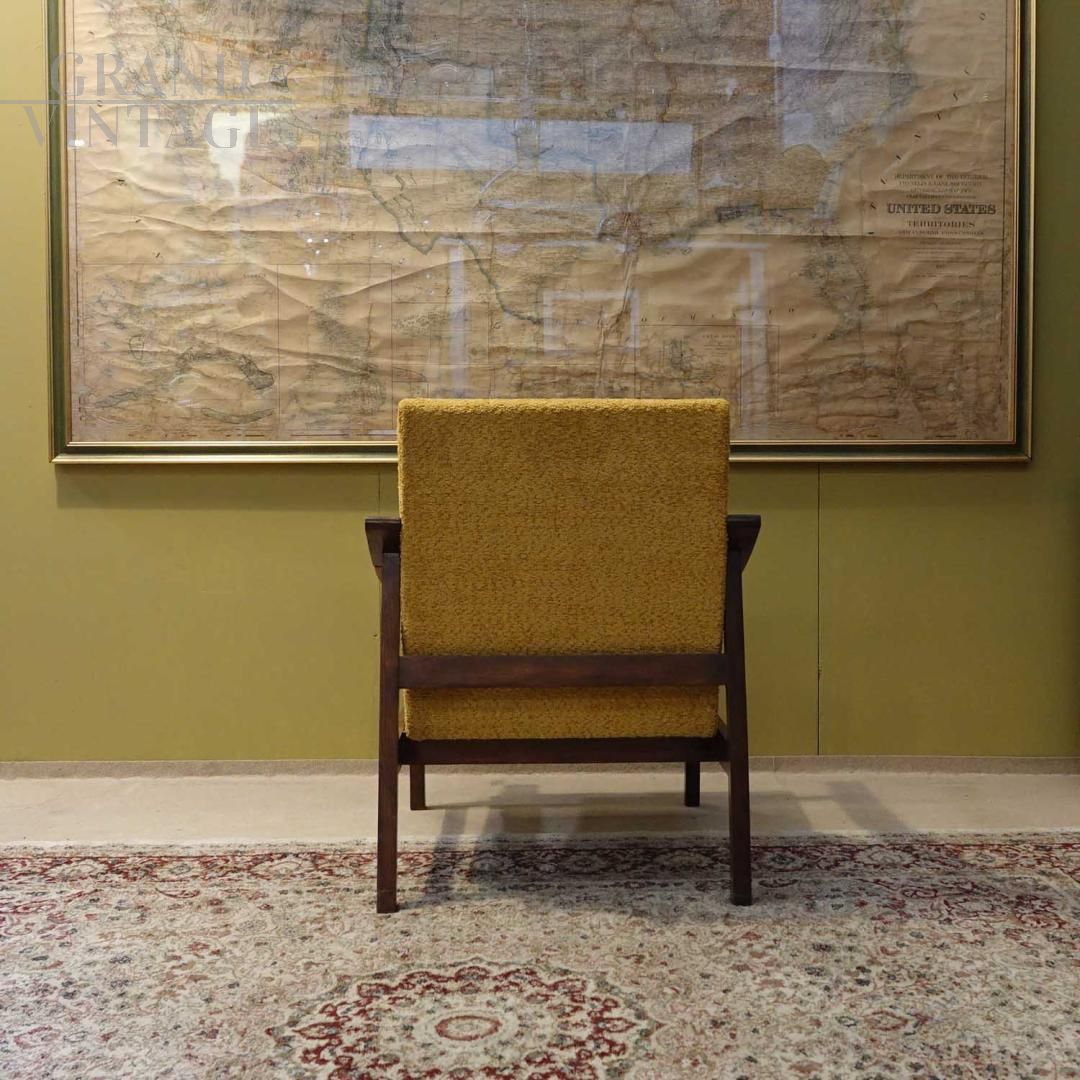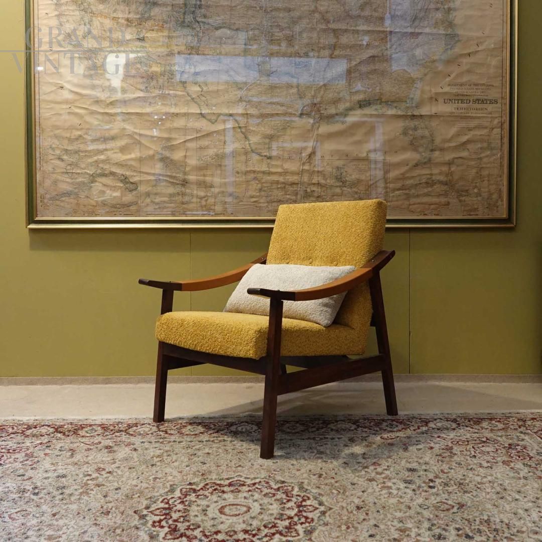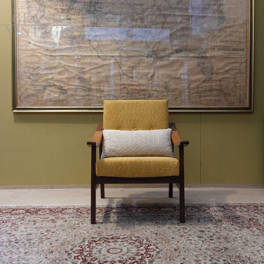 Poltrona Mid-Century in stile scandinavo rivestita in bouclé di colore giallo, un tessuto morbido, riccio e avvolgente che dona comfort e stile. Le linee pulite e il design essenziale la rendono perfetta per ambienti moderni, caldi e raffinati, con un tocco rétro di grande tendenza.