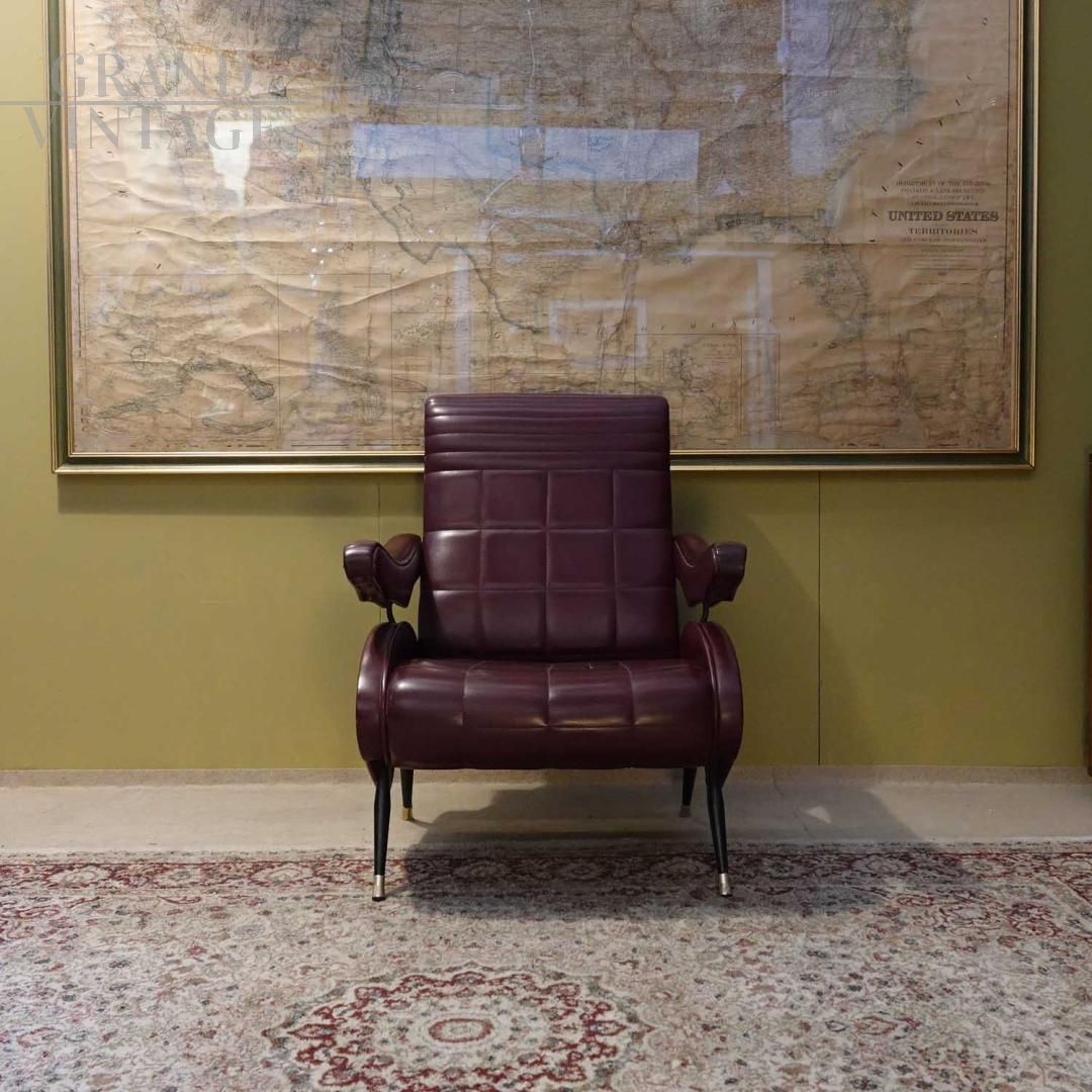 Poltrona reclinabile anni ’60 firmata Nello Pini, con rivestimento in skai bordeaux che dona un tocco di colore vintage e raffinato. Variante originale del celebre modello, unisce comfort, personalità e design funzionale, perfetta per arredamenti retrò, creativi o ambienti dallo stile eclettico.