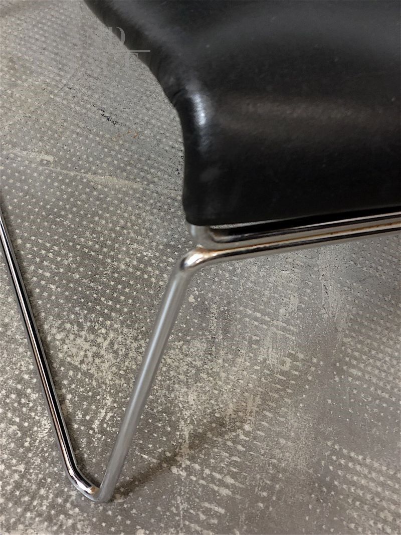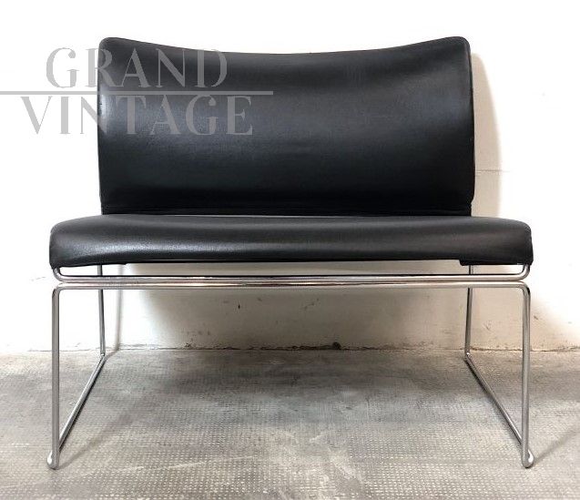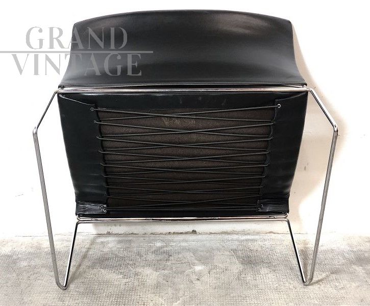 Bellissima poltrona Saghi di Kazuhide Takahama per Simon Gavina, Made in Italy, con struttura impilabile in tondino metallico piegato ed elettro saldato a induzione, con finitura cromata in perfette condizioni, e seduta e schienale imbottiti con materiale espanso e rivestiti in pelle di colore nero. In condizioni perfette.