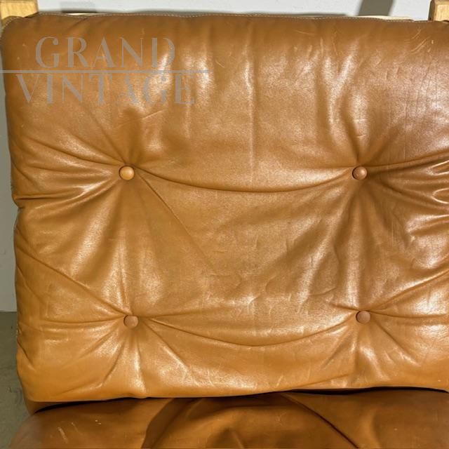 Poltrona modello Siesta di Ingmar Relling per Westnofa realizzata in legno di faggio curvato, con cuscini in pelle marrone originali, design scandinavo anni '60.