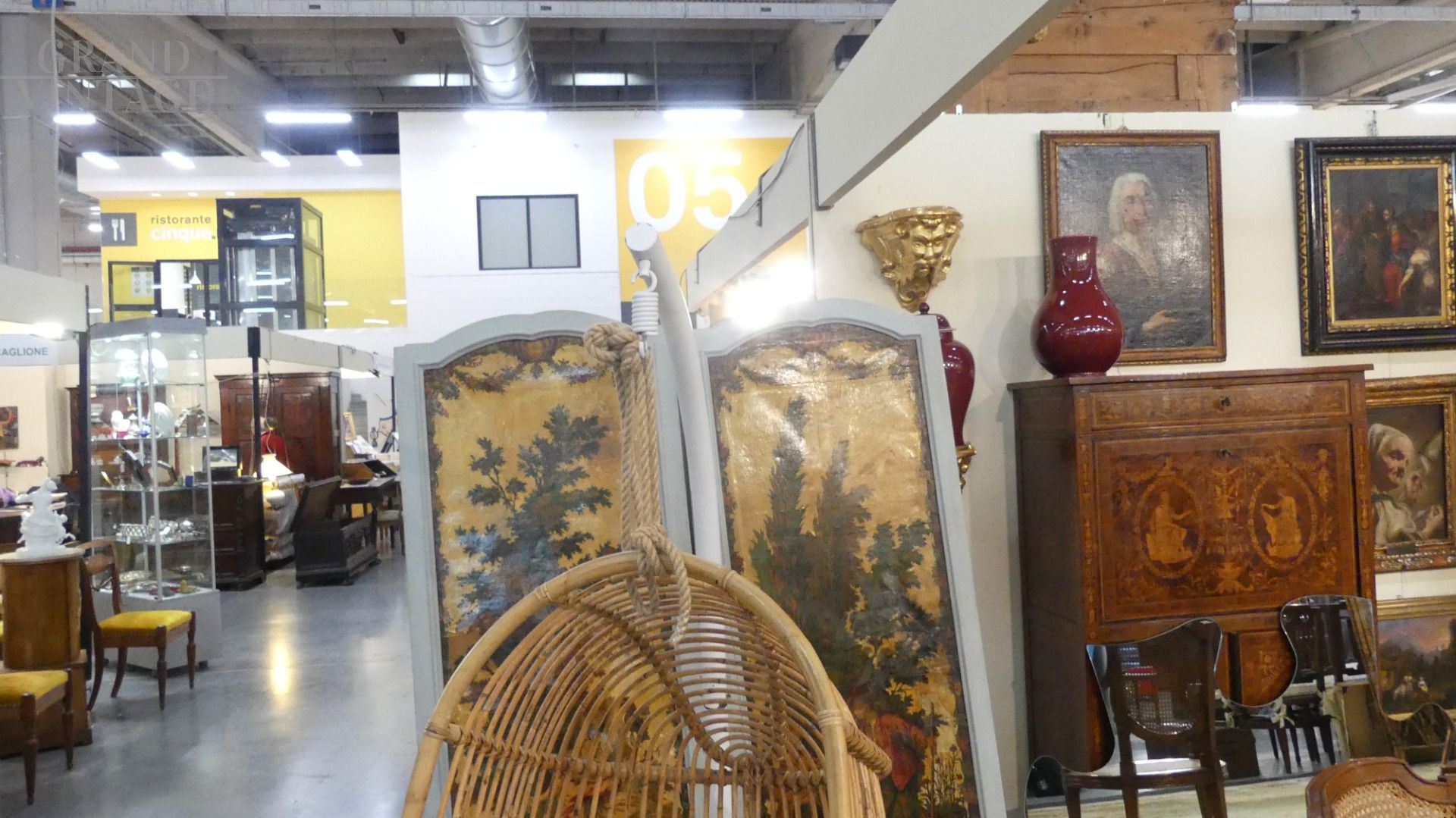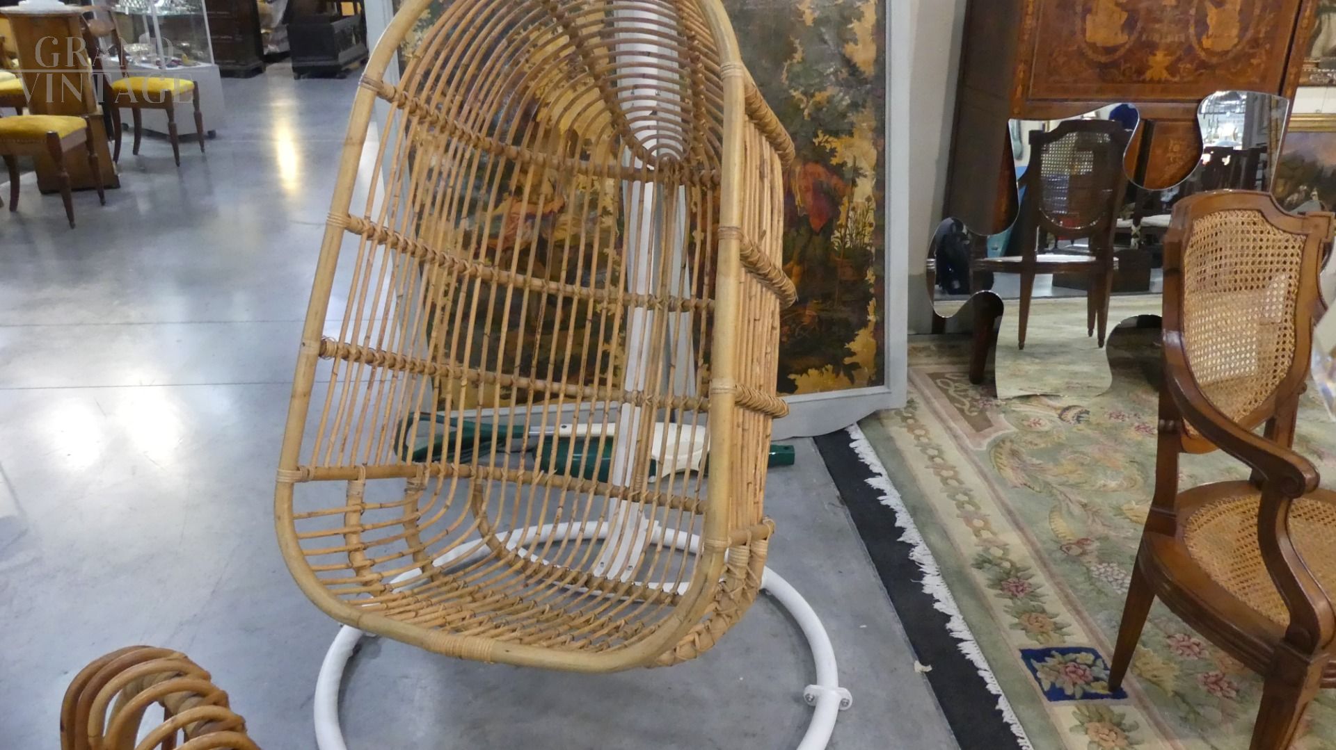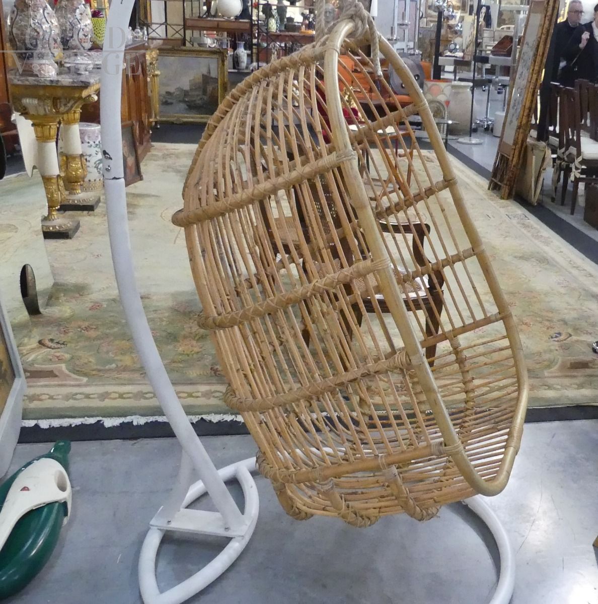 Poltrona sospesa in bamboo vintage originale in stile Bonacina, in midollino con telaio in metallo laccato bianco, robusta e in buon condizioni.
