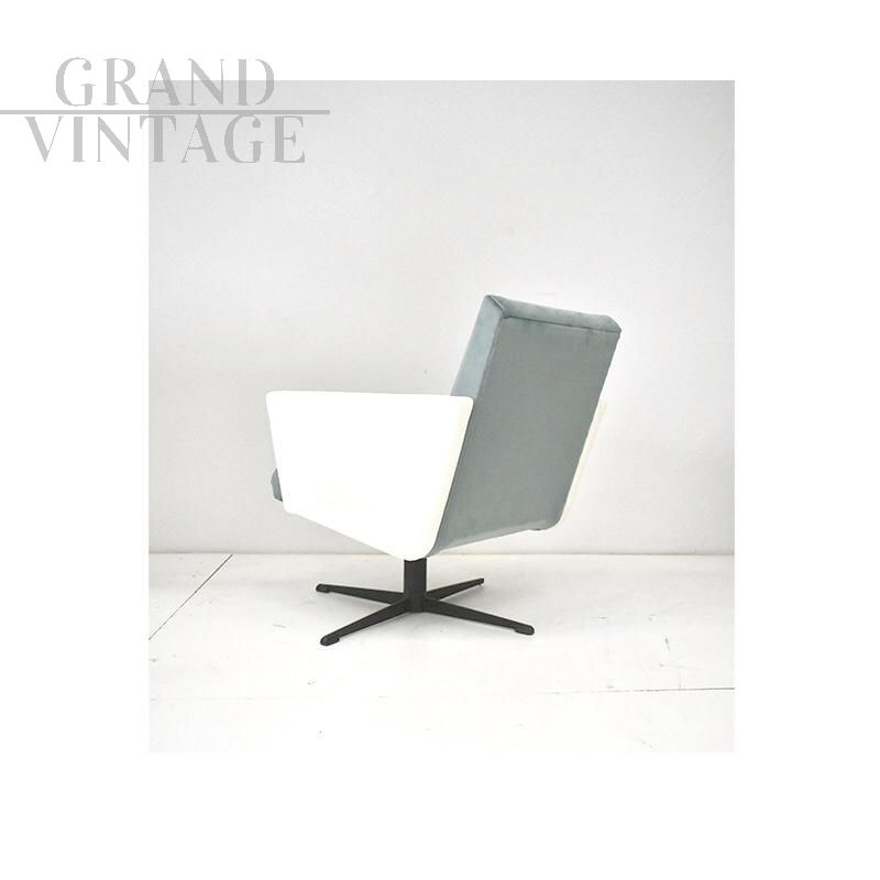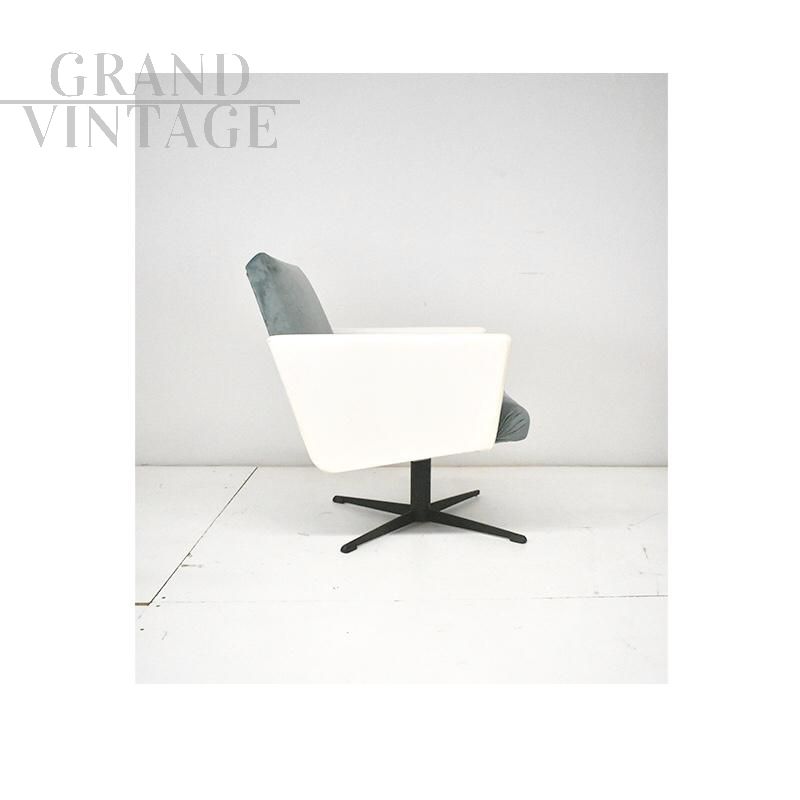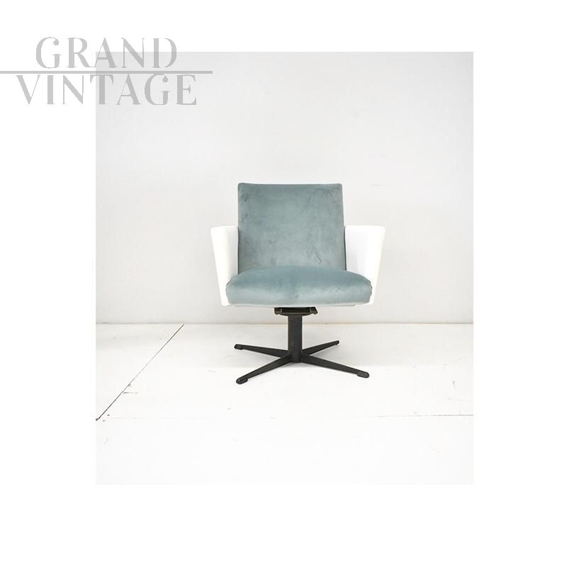 Poltrona girevole vintage anni Sessanta, manifattura Italiana. La poltrona presenta una struttura in ferro nero, con braccioli in similpelle bianca e seduta e schienale in velluto acquamarina.