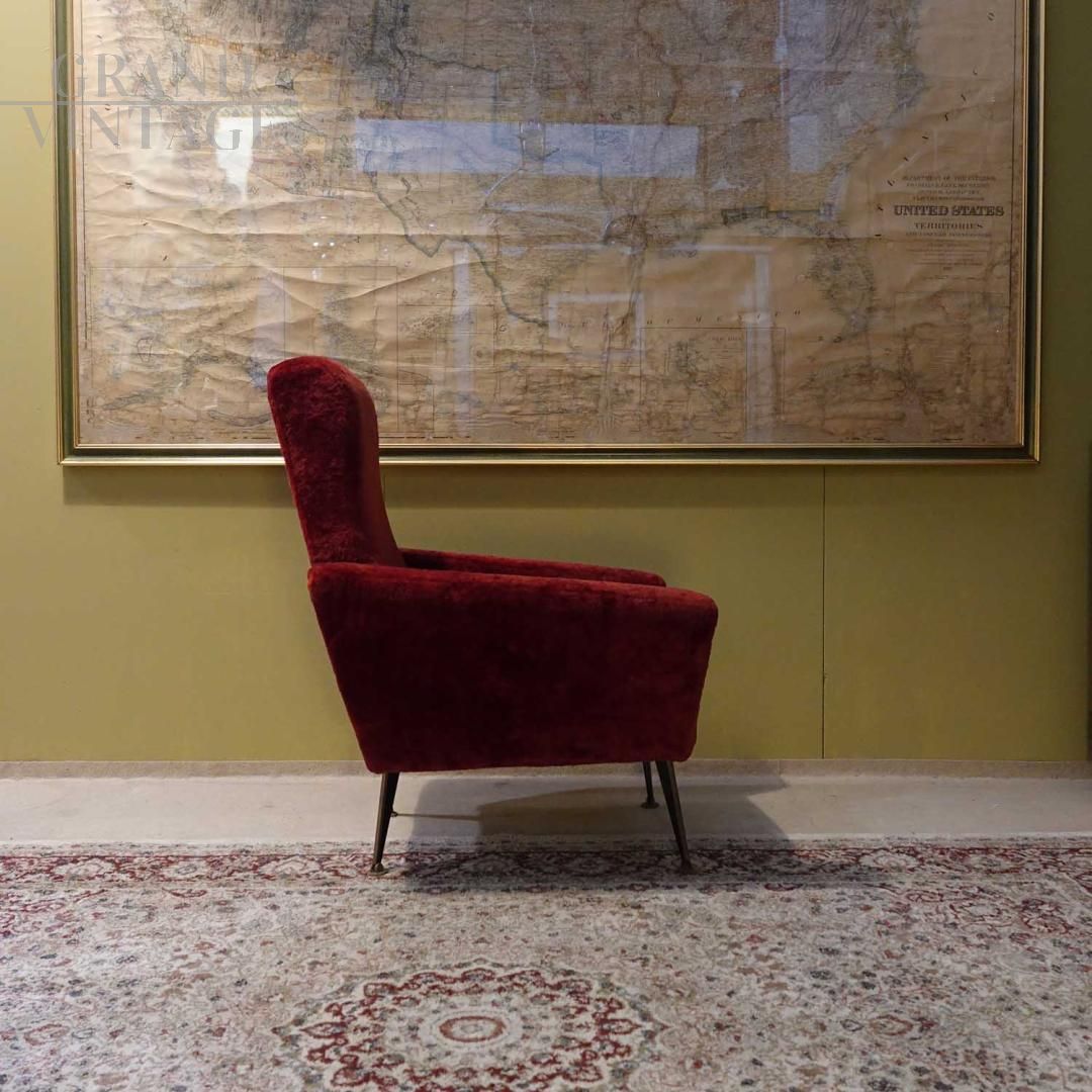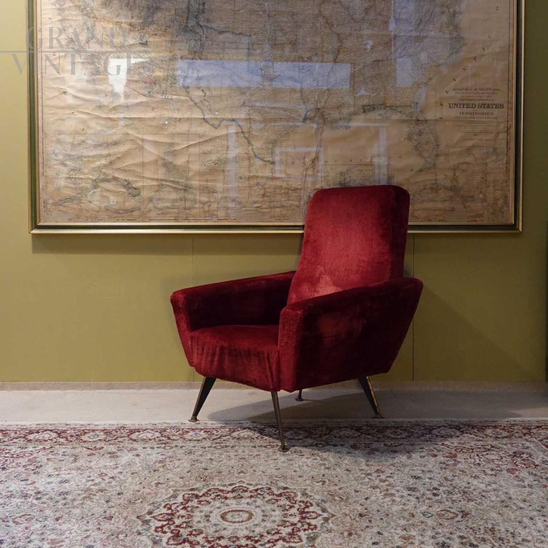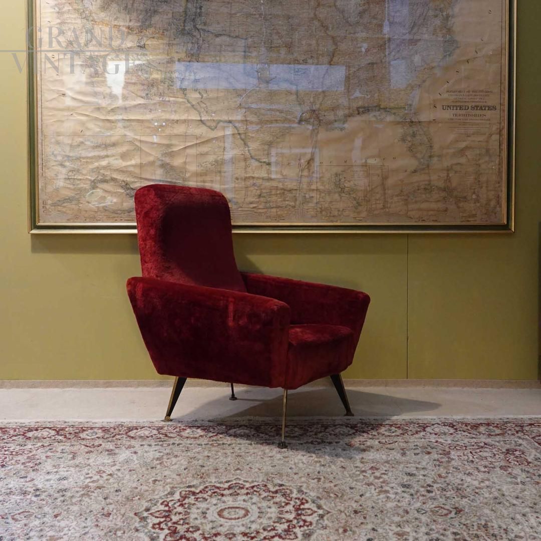 Poltrona di modernariato italiana in velluto rosso, dallo stile elegante e scenografico. Il rivestimento morbido e la tonalità intensa la rendono un elemento d’arredo di forte impatto visivo, perfetta per ambienti raffinati, salotti teatrali o set dal gusto vintage e seducente.