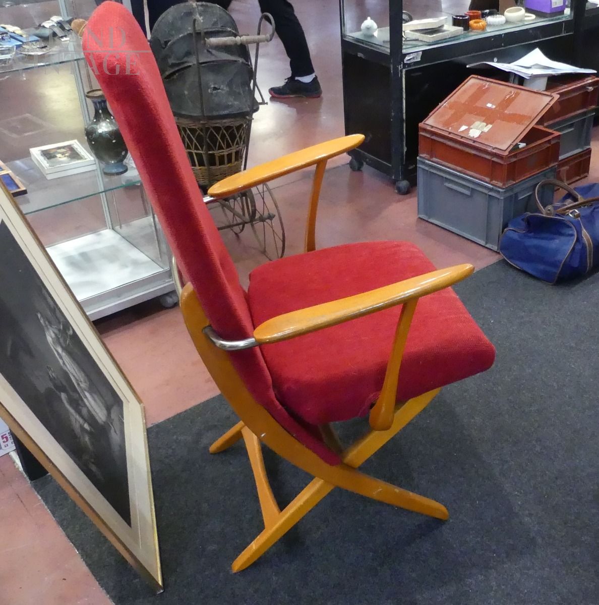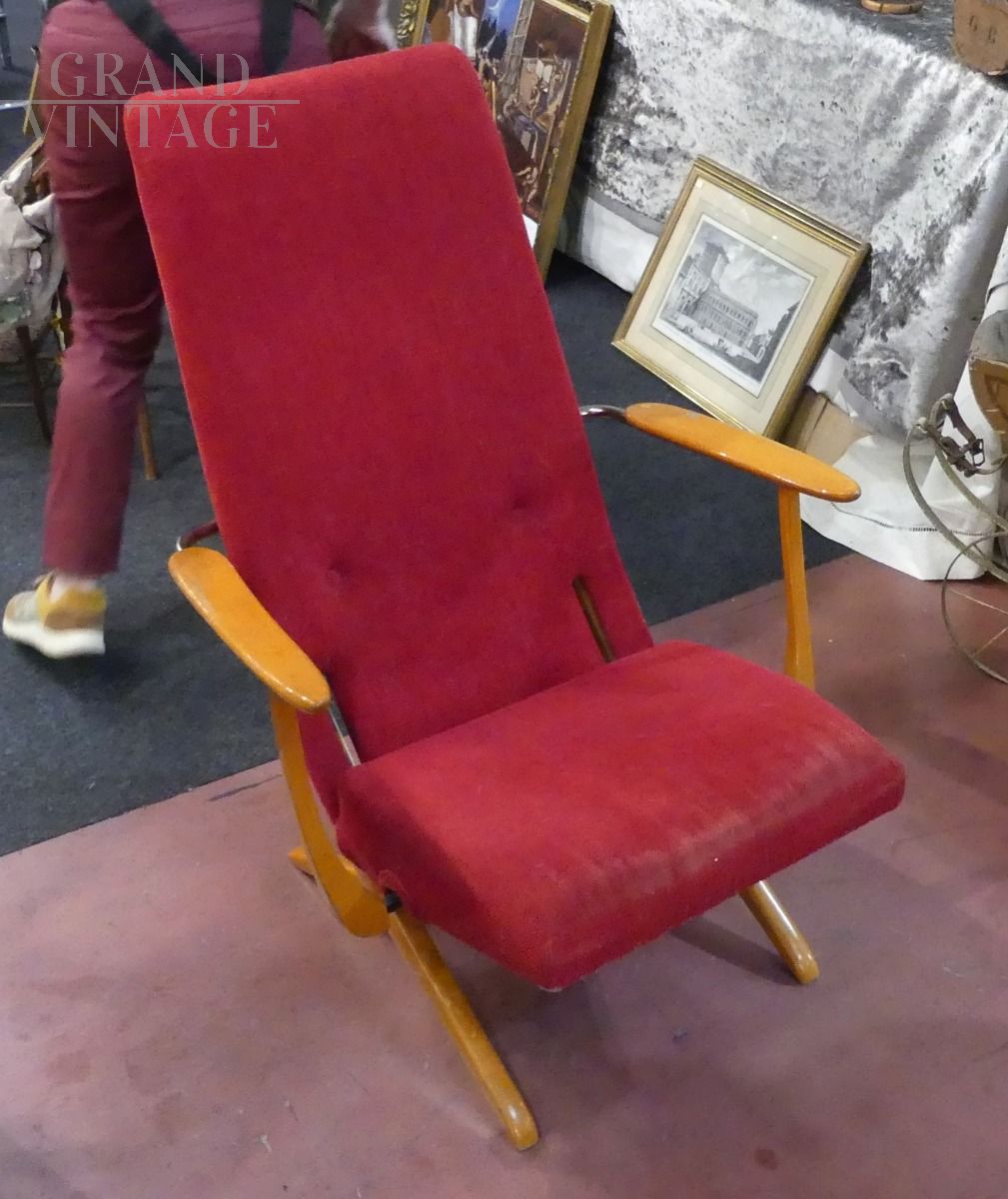Rara poltrona vintage reclinabile con struttura in metallo e legno chiaro, seduta e schienale imbottiti e rivestiti con tessuto originale rosso, con i segni del tempo.