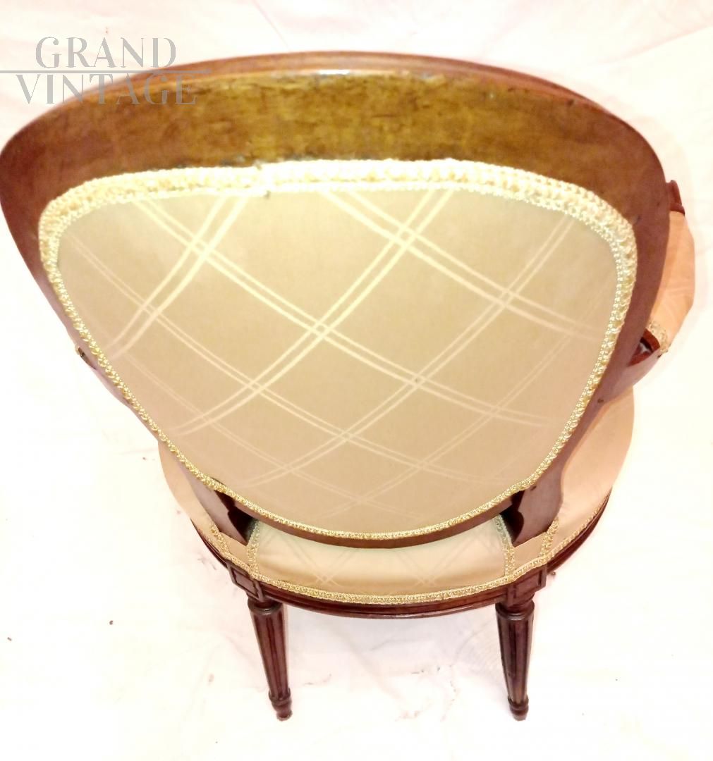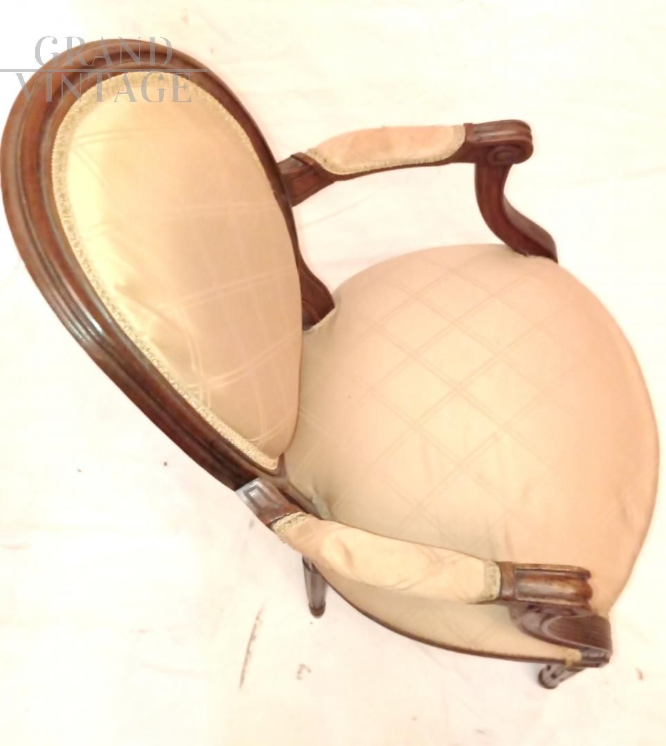 Poltroncina antica in noce ben imbottita e rivestita con elegante tessuto di seta beige, seduta comoda ideale da relax o conversazione. Il prezzo si riferisce alla singola poltroncina, disponibile la coppia.
