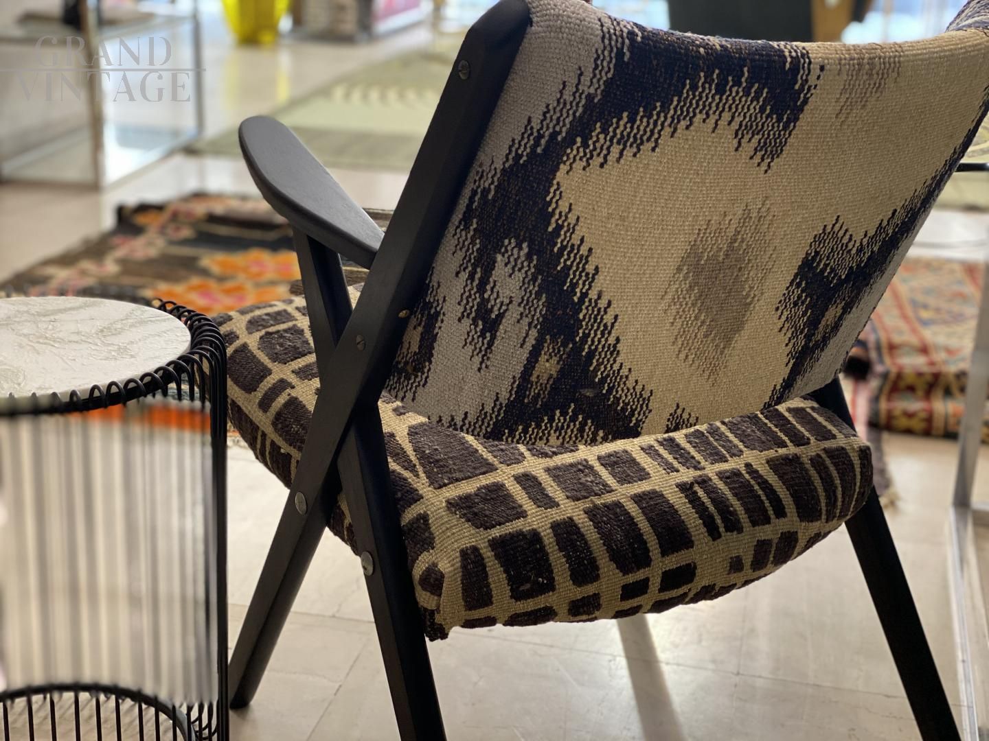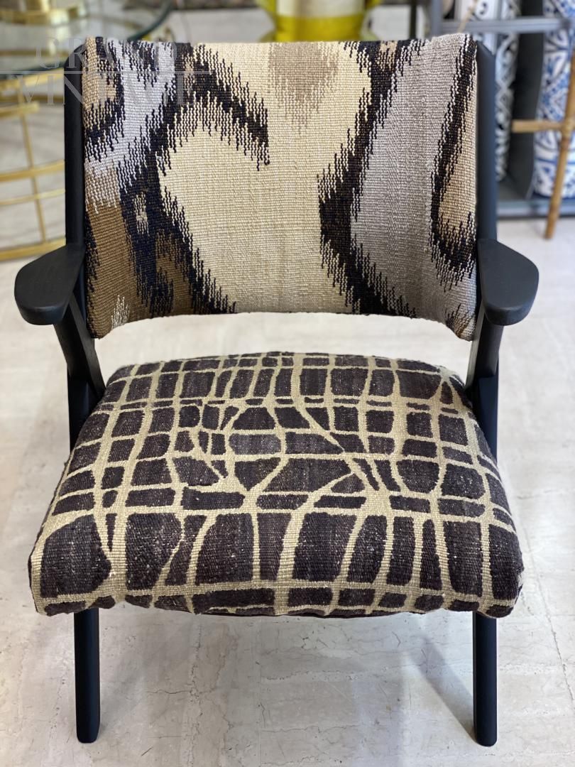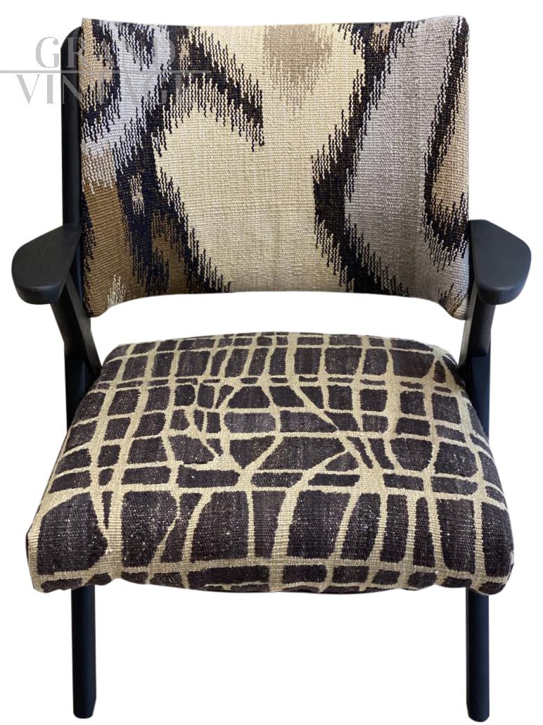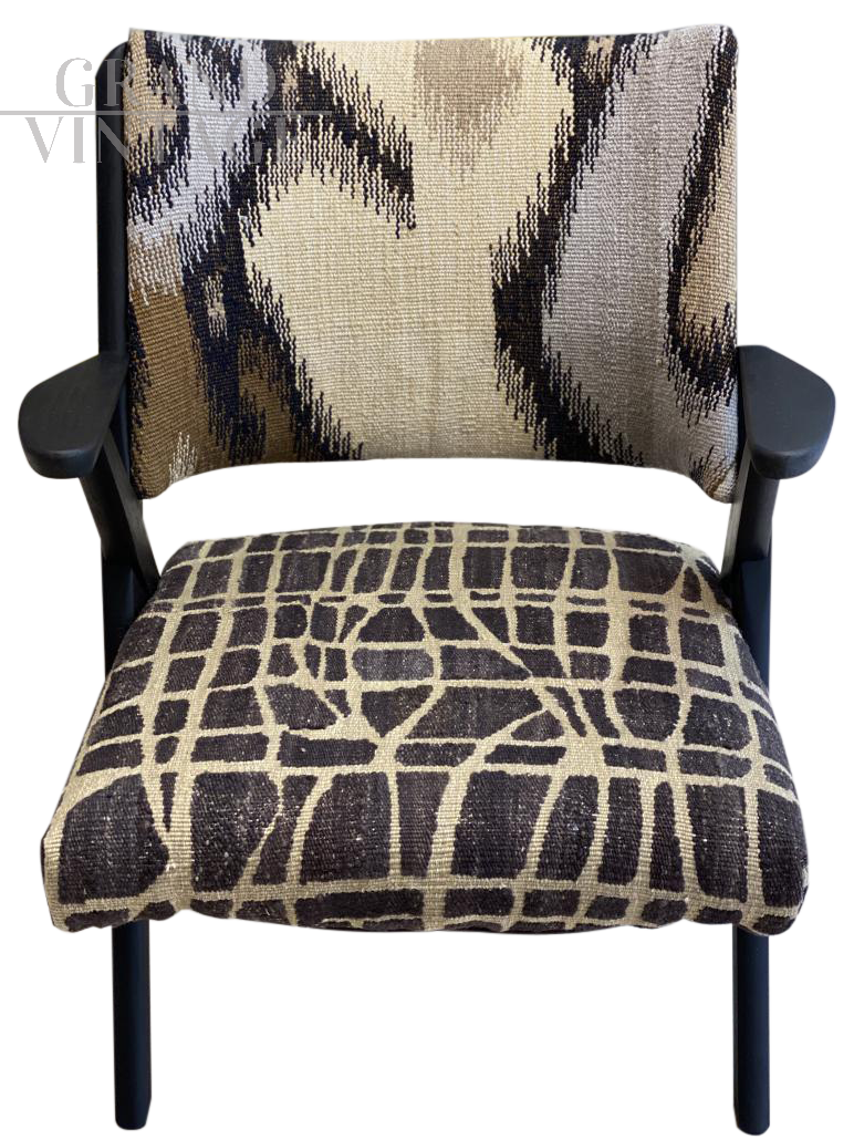 Poltroncina by Industrie arredamenti Dal Vera, Italia 1950-1959, rifoderata con Kilim Afghan lavorato a mano con lane colorate con tinte vegetali, pezzo unico.