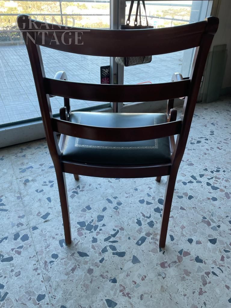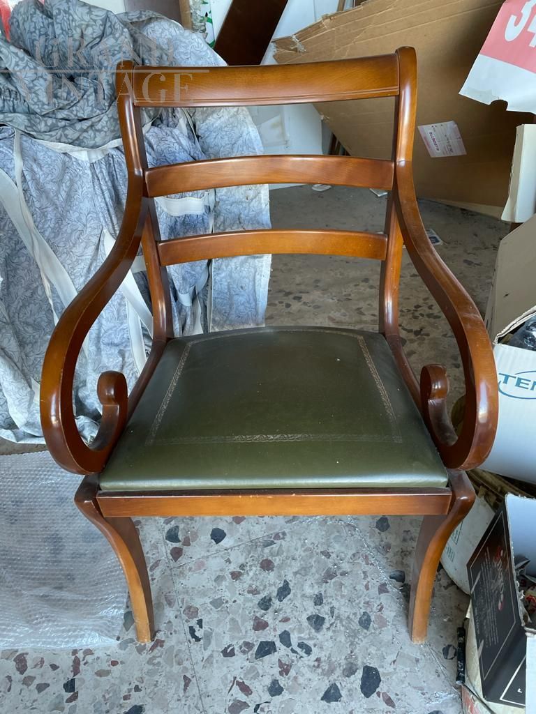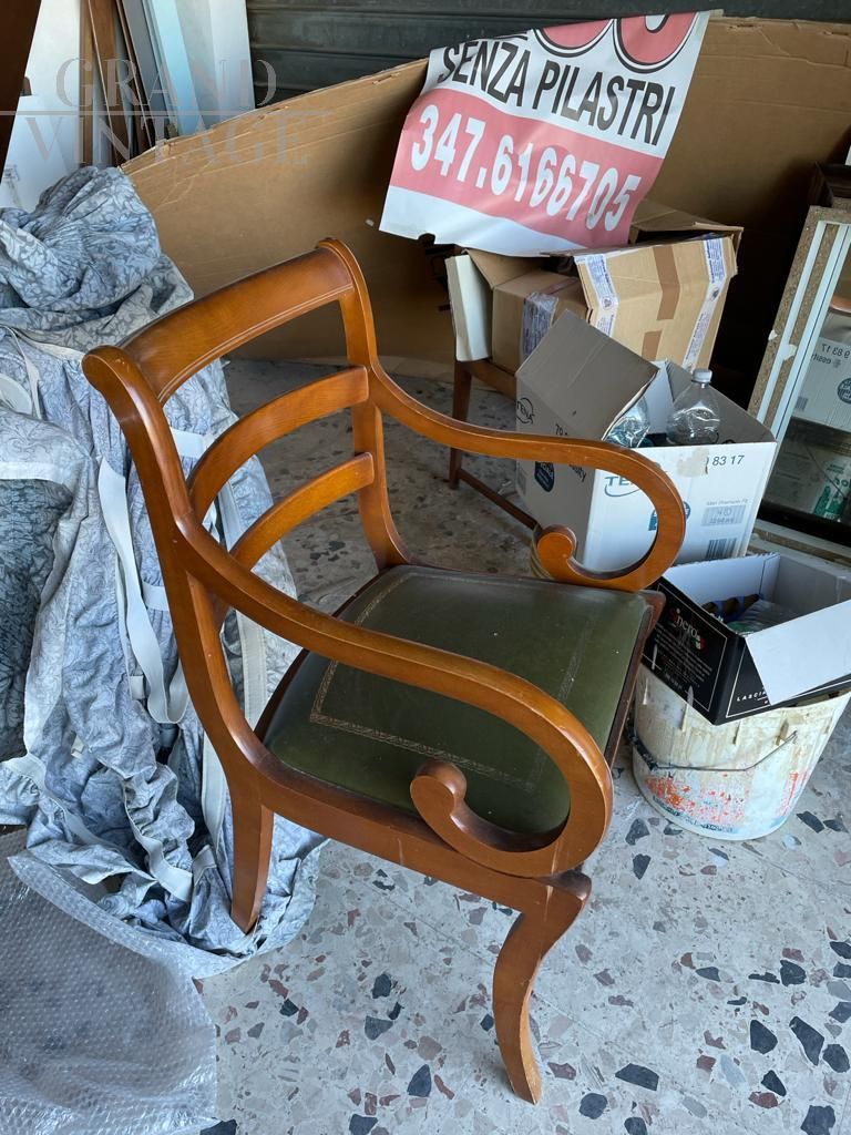 Poltroncina in stile antico in legno chiaro con seduta rivestita in vera pelle verde, molto elegante, perfetta anche come seduta per ufficio professionale.