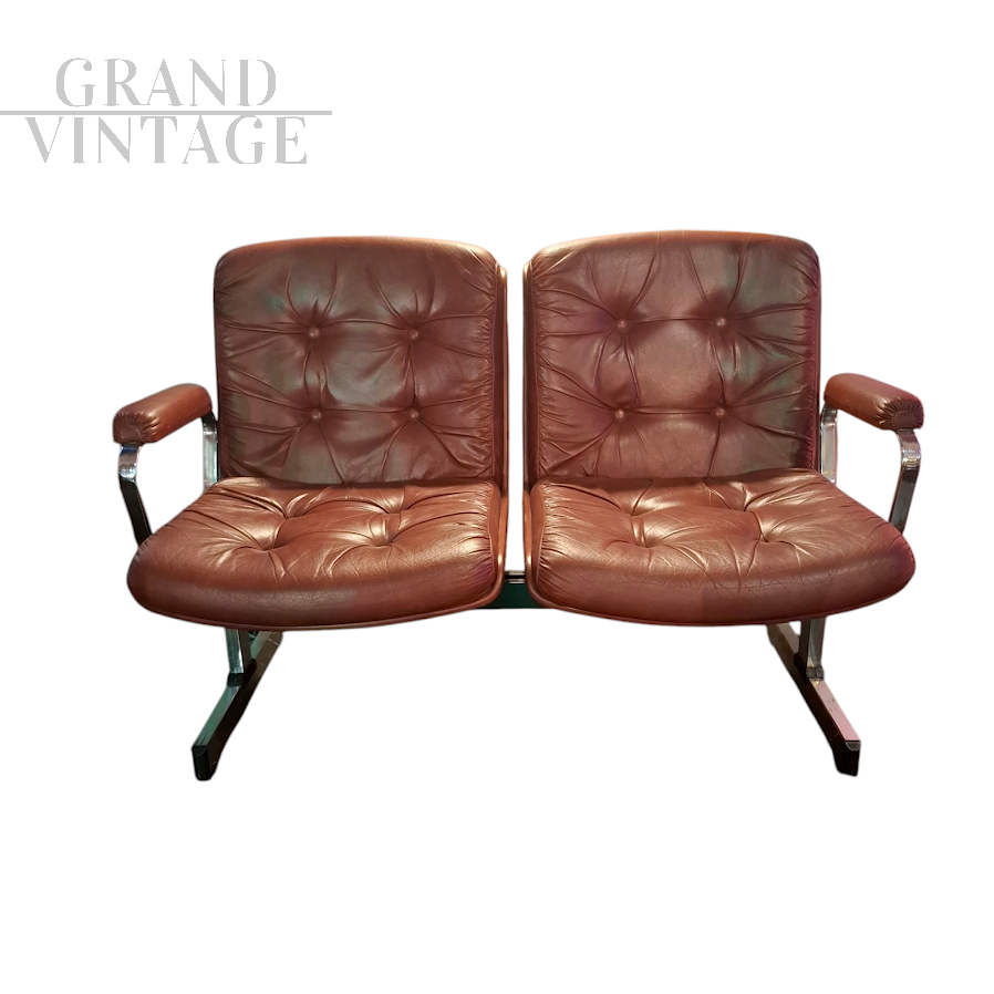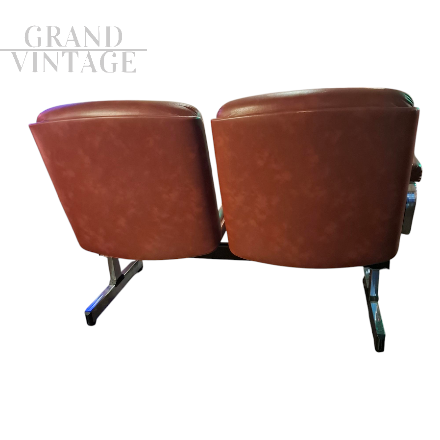 Poltroncine vintage per sala d'attesa in acciaio e similpelle marrone, anni '70