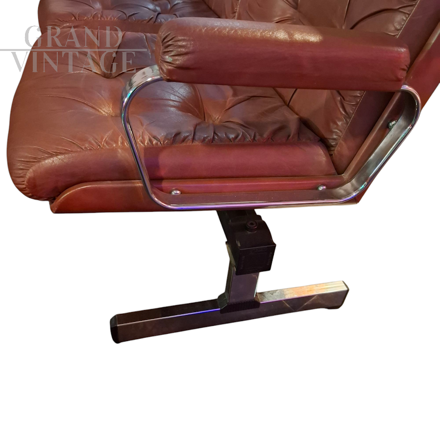 Portate un tocco di eleganza vintage nella vostra casa o nel vostro studio con questa coppia di poltrone in acciaio e pelle degli anni '70. La struttura in acciaio le rende robuste e durevoli, mentre il rivestimento in similpelle skai marrone e lo stile capitonné le conferiscono un'aria sofisticata. Perfette per l'ufficio o per creare un angolo di rappresentanza in casa, le poltrone sono anche estremamente comode grazie alla loro ampia seduta e ai braccioli. Che siano utilizzate per rilassarsi davanti alla TV o per accogliere i vostri ospiti con stile, queste poltrone aggiungeranno un tocco di classe e originalità al vostro spazio.