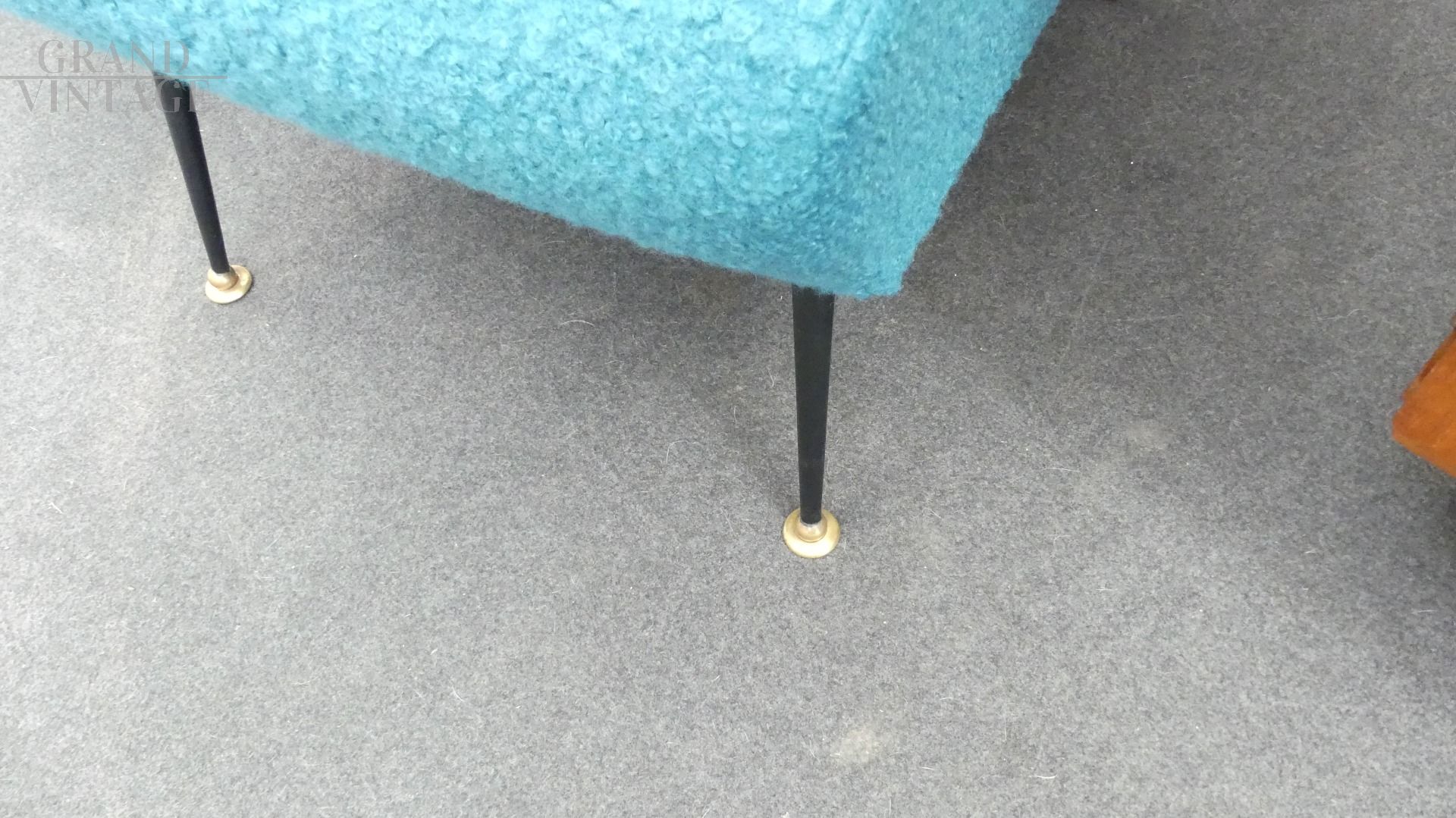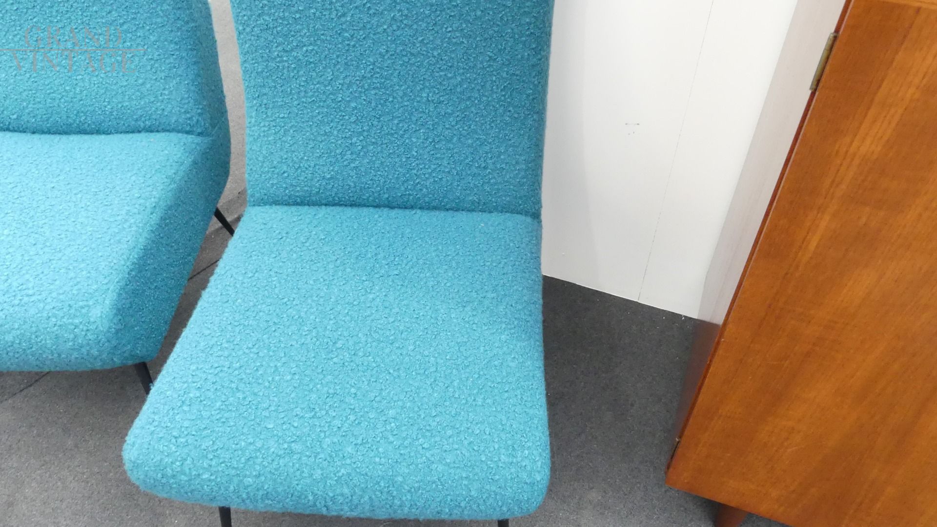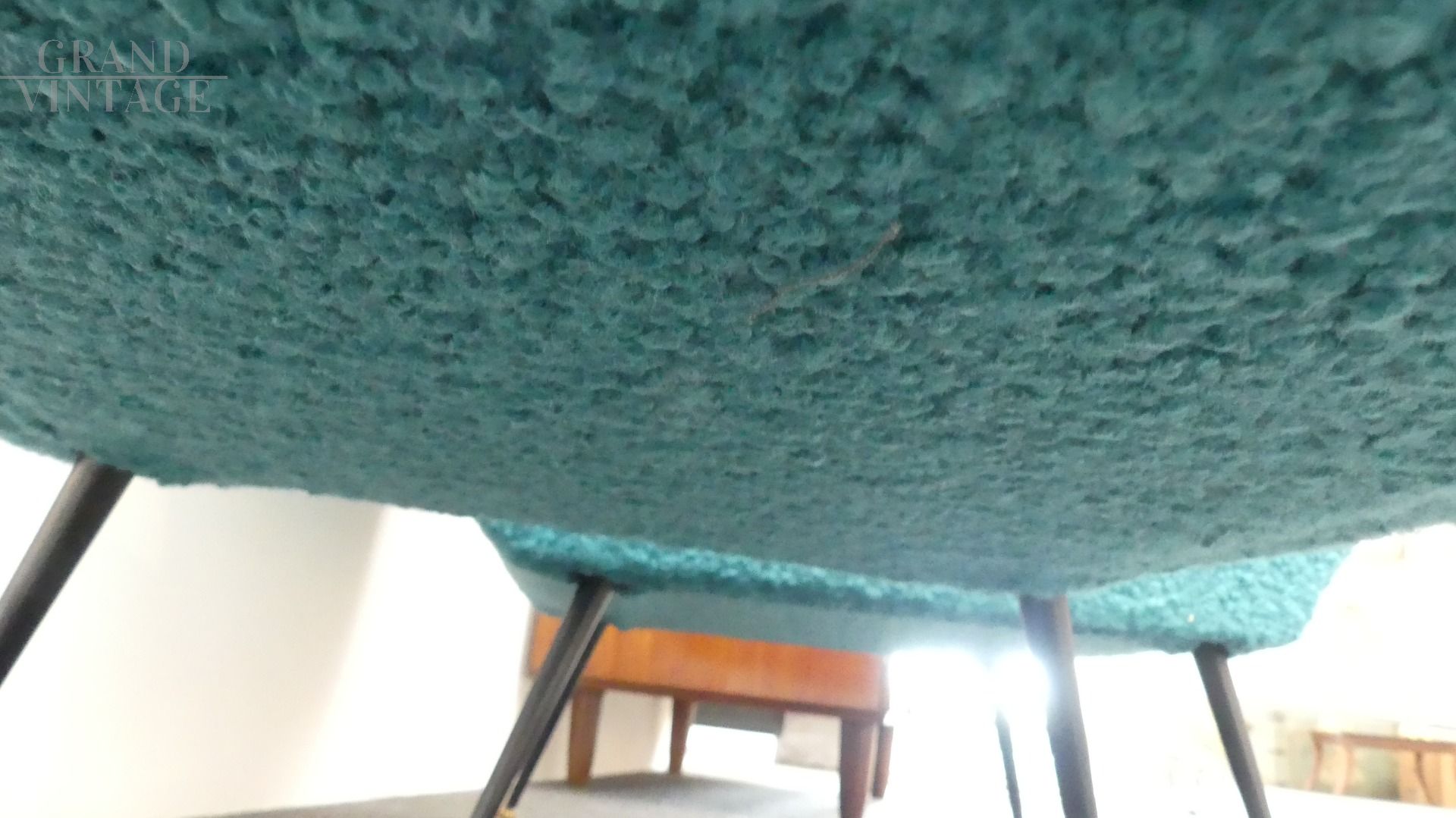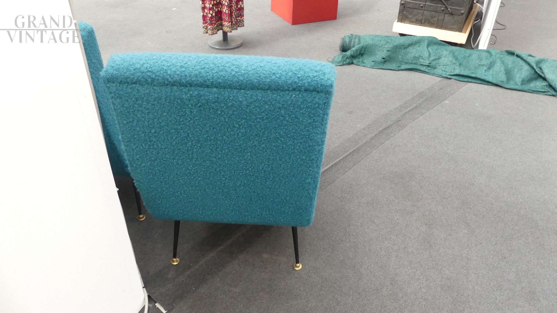 Coppia di poltrone degli anni '50 senza braccioli. Le poltrone sono in tessuto di lana bouclè color ottanio.