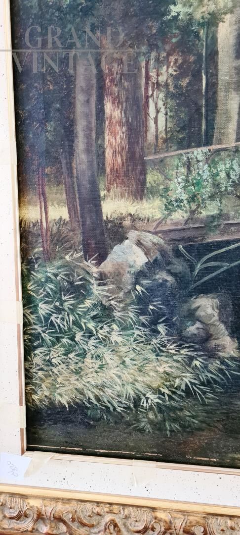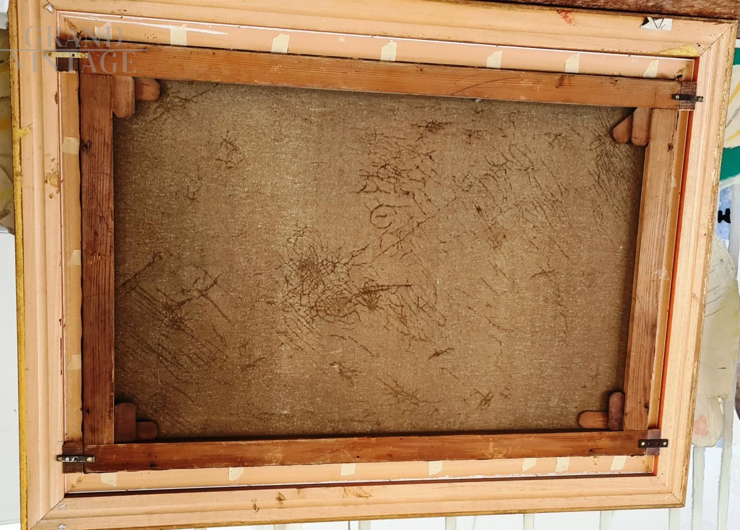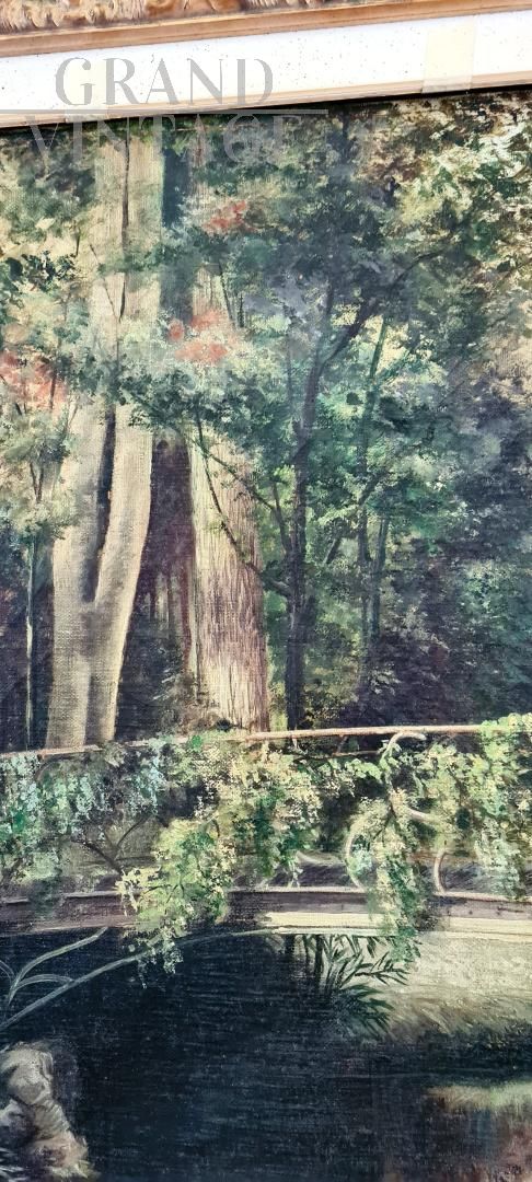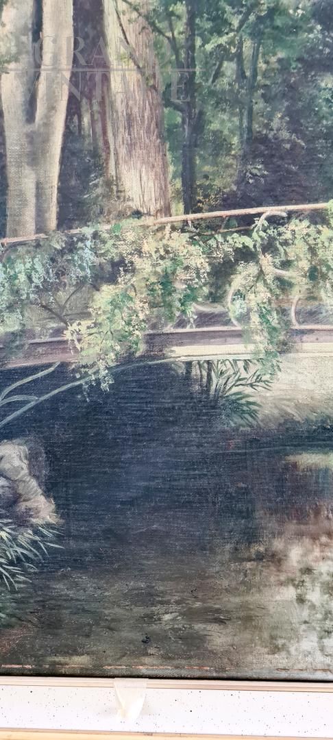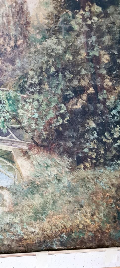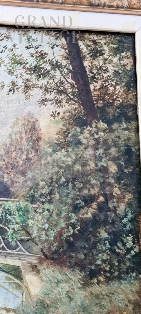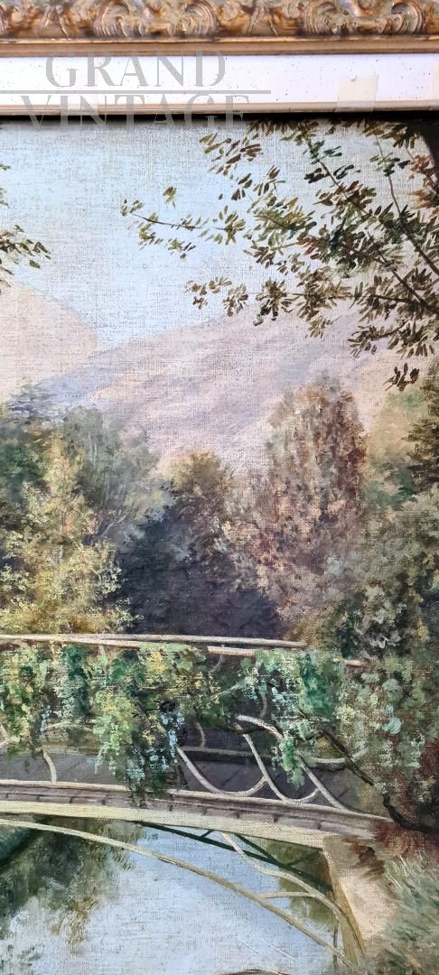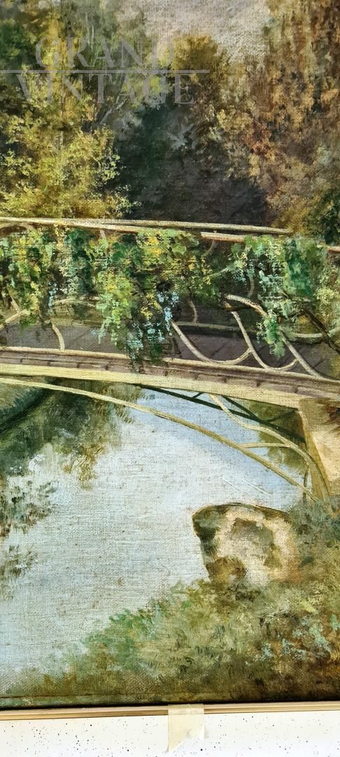 Dipinto con paesaggio francese periodo Novecento con cornice coeva, raffigurante un ponte sul fiume, di ottima qualità pittorica.