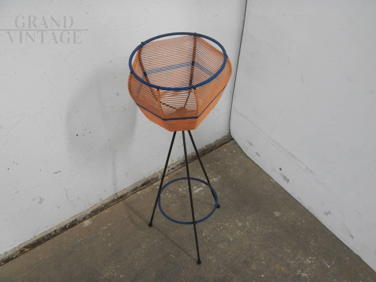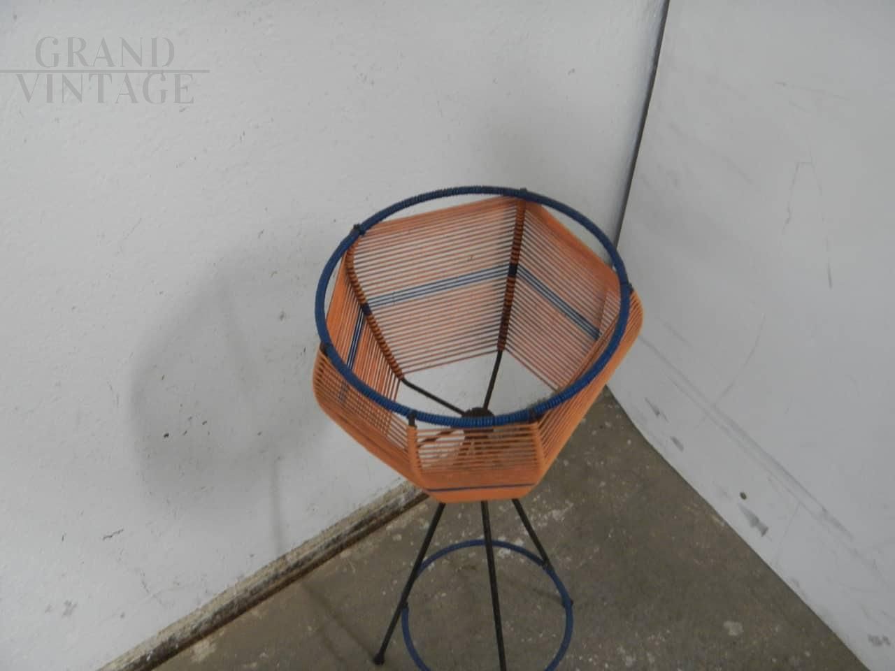 Portavasi vintage in ferro e plastica a fili colorata nei toni dell'arancione e del blu. In buone condizioni, con i naturali segni del tempo, i piedini sono originali. Lo spazio utile per il vaso è di cm 21x21, altezza cm 15.