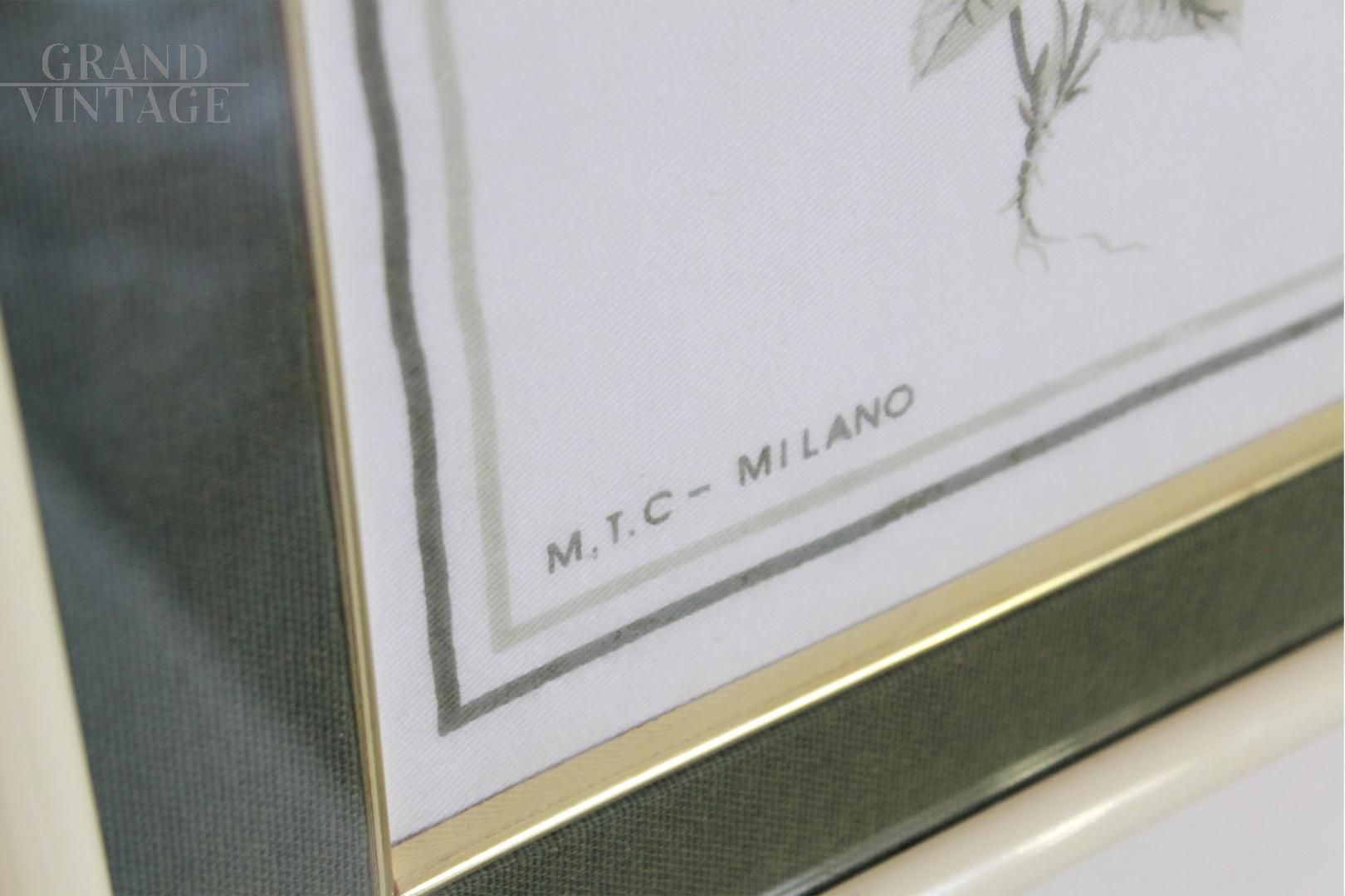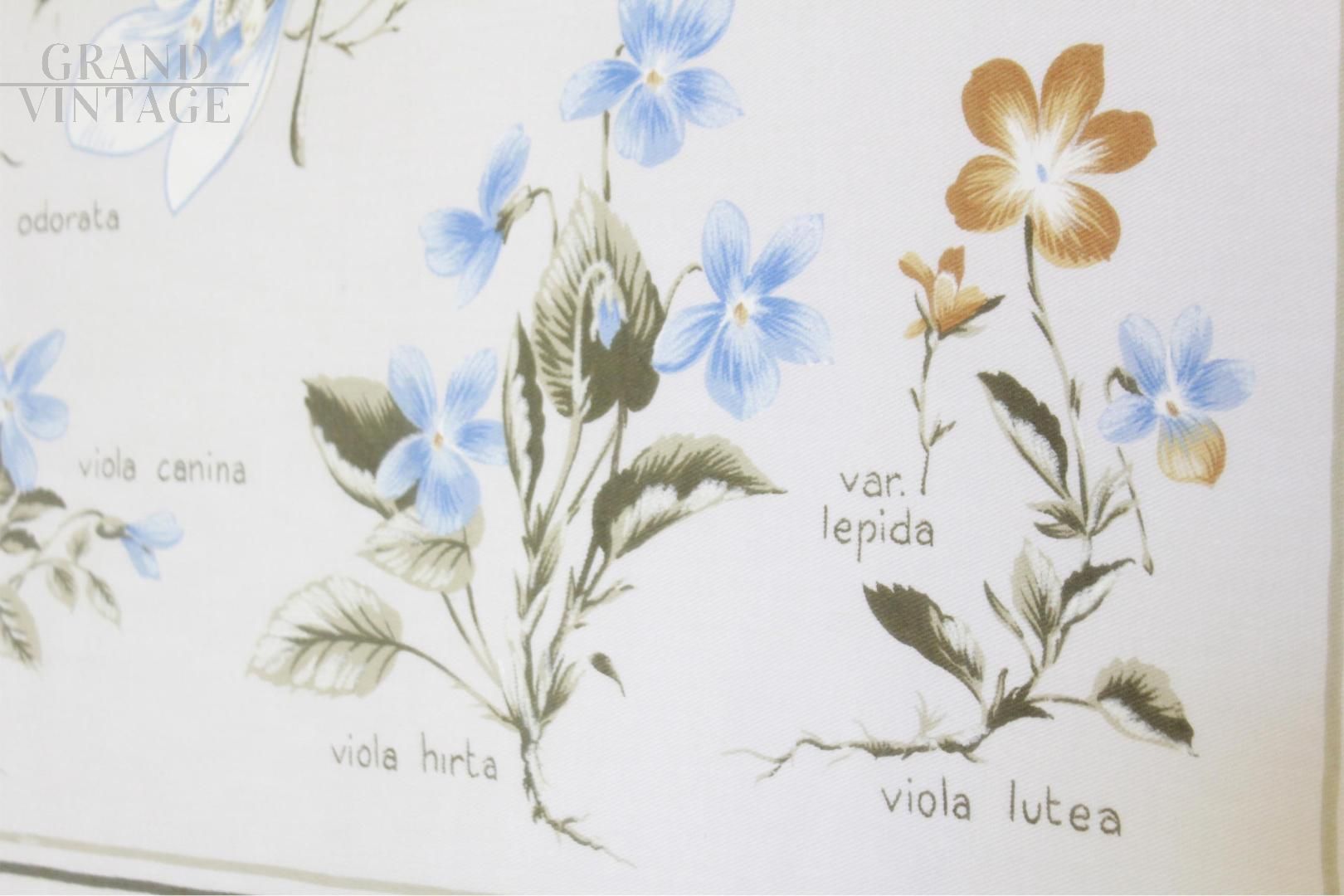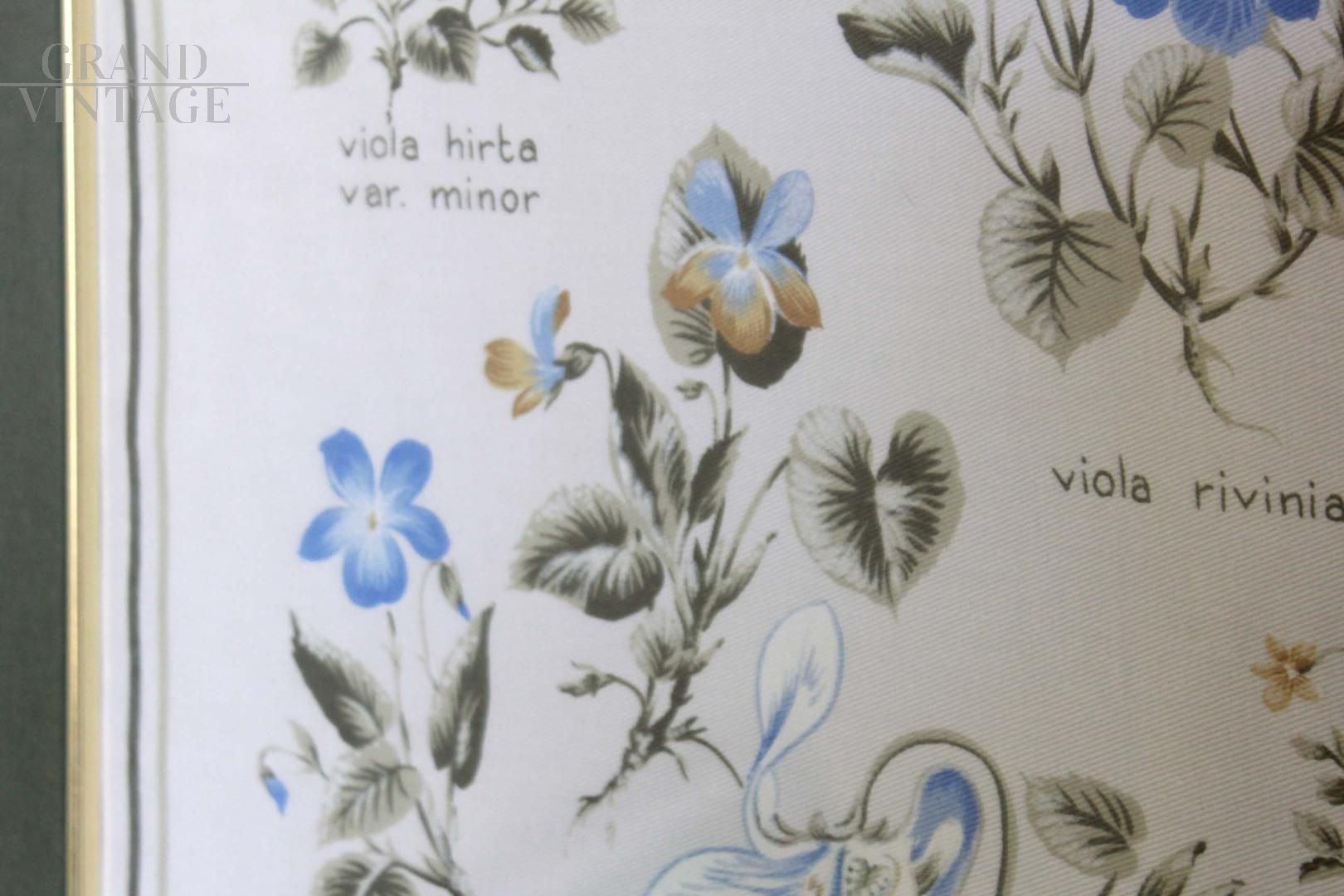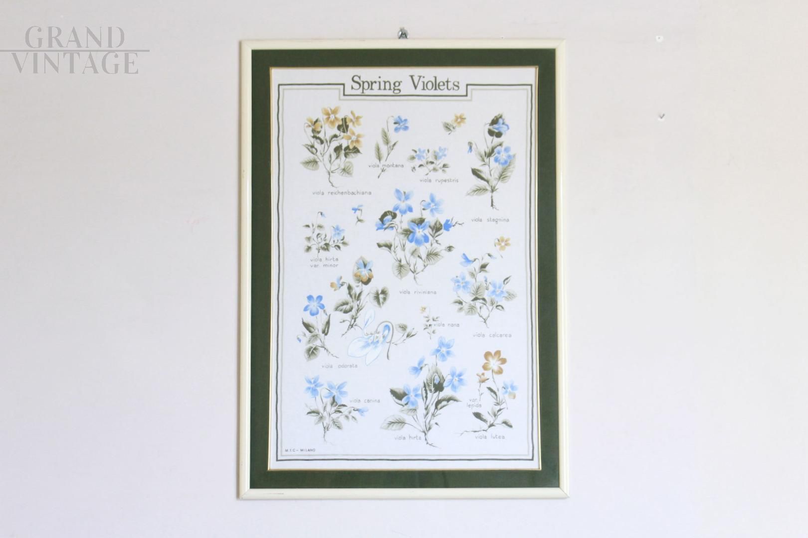 Poster vintage degli anni '60 a tema floreale con protagonista le violette di campo. Cornice in legno bianco e vetro protettivo. Prodotto da M.T.C. - Milano.