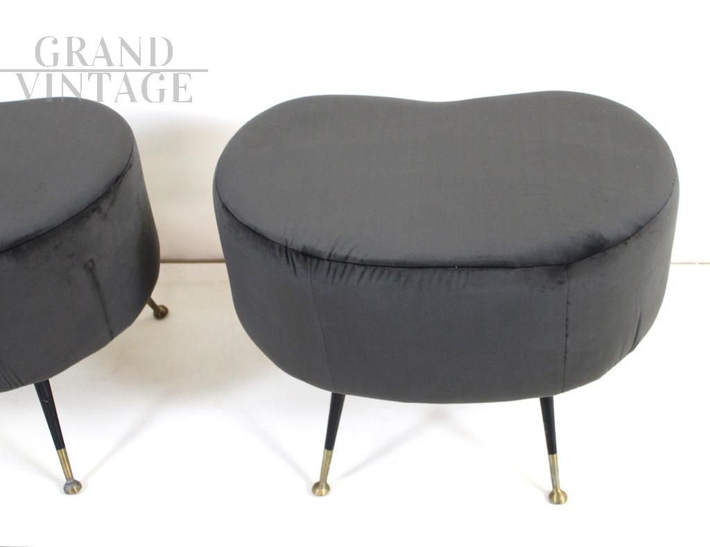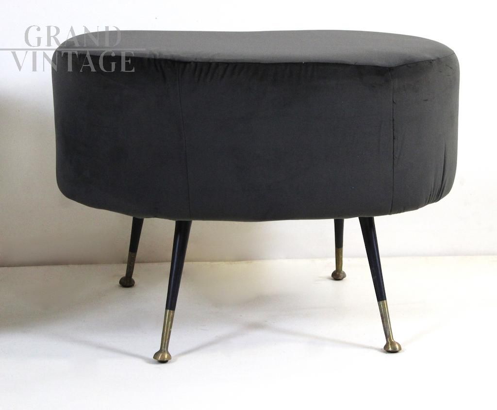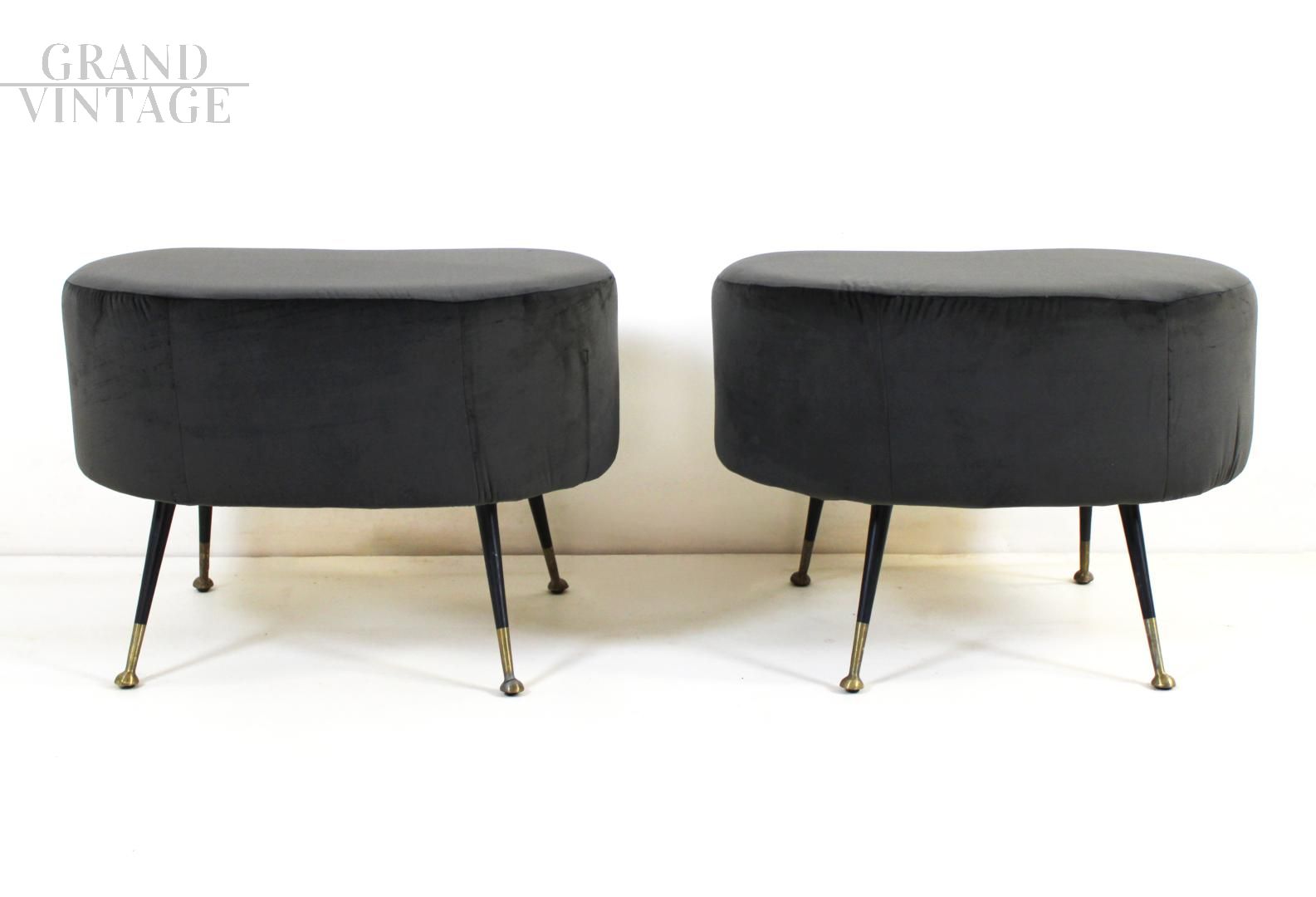 Particolari pouf vintage con gambe in ottone e rivestimento in velluto grigio fumé, Italia anni '70. Disponibili diversi pezzi, il prezzo si riferisce al singolo pouf.