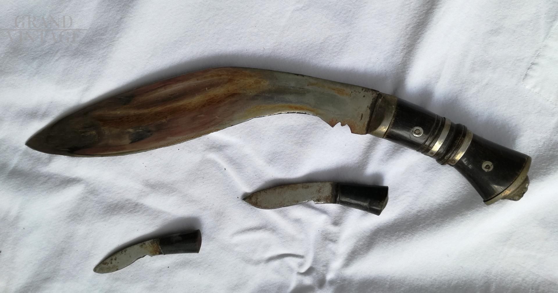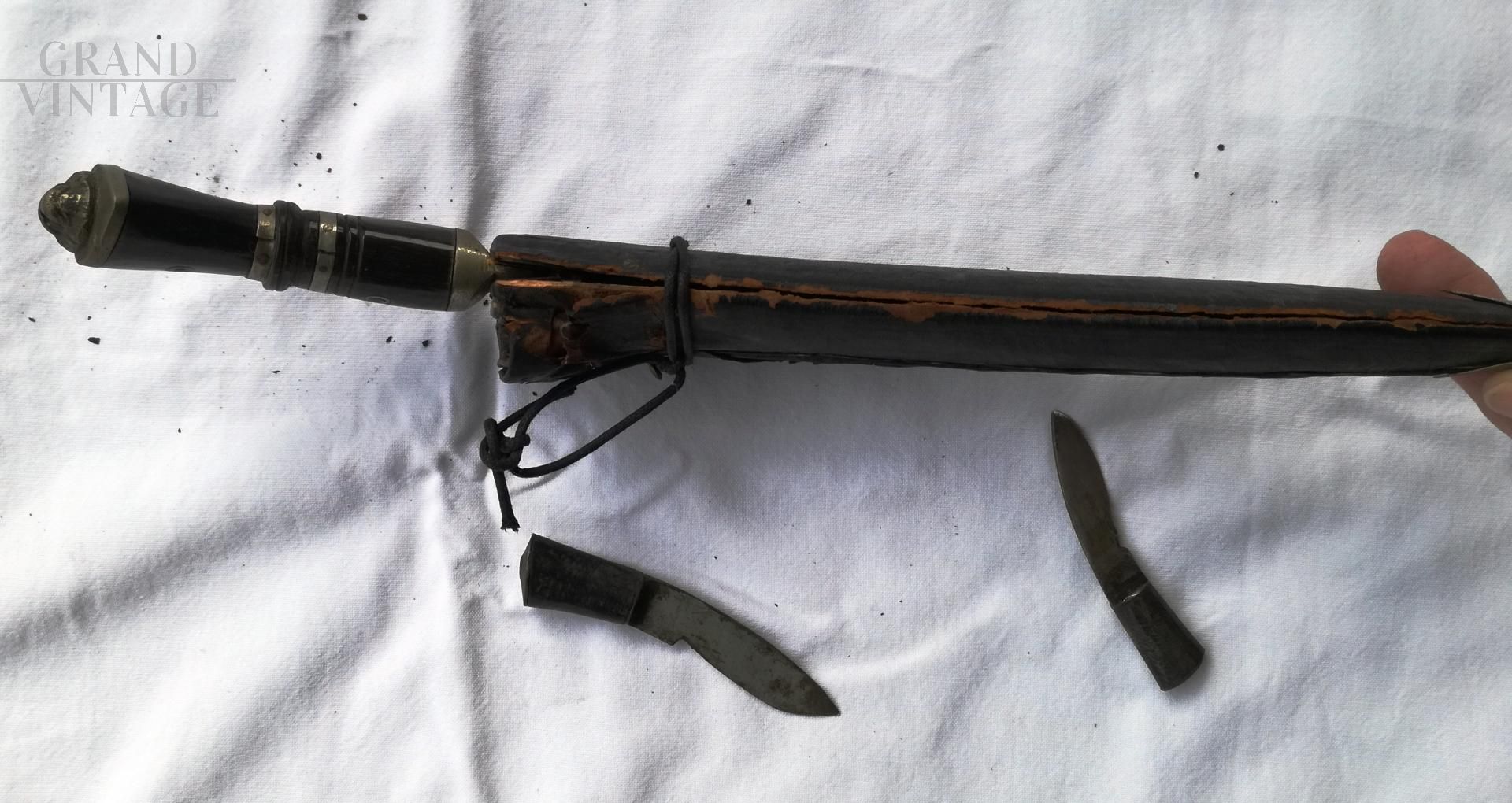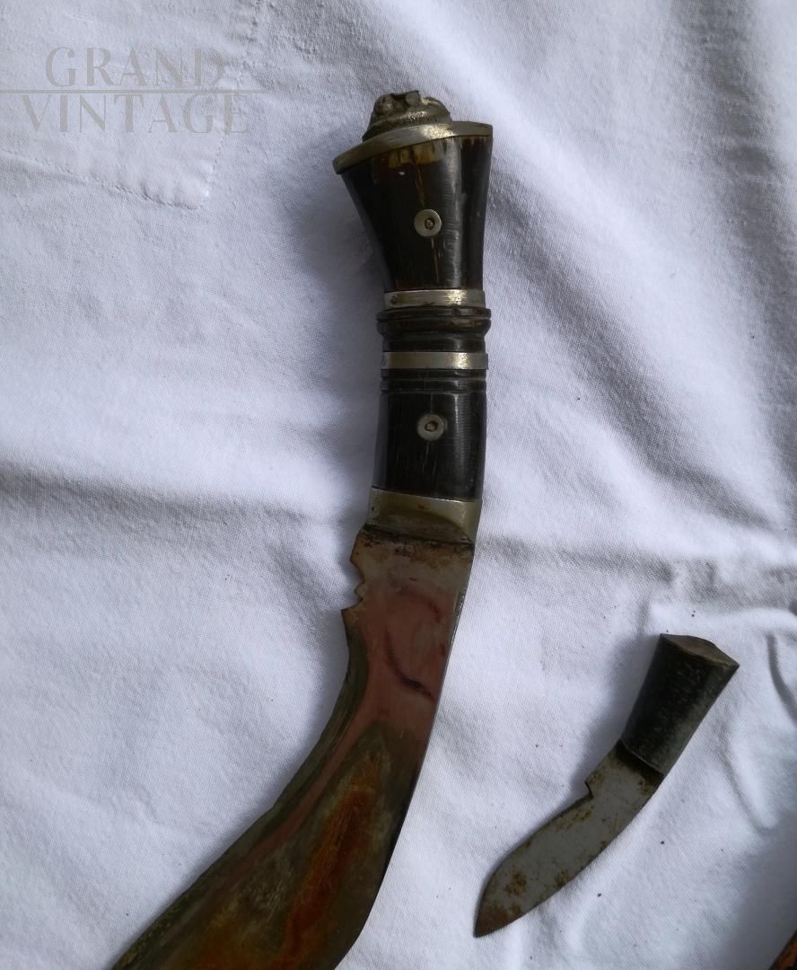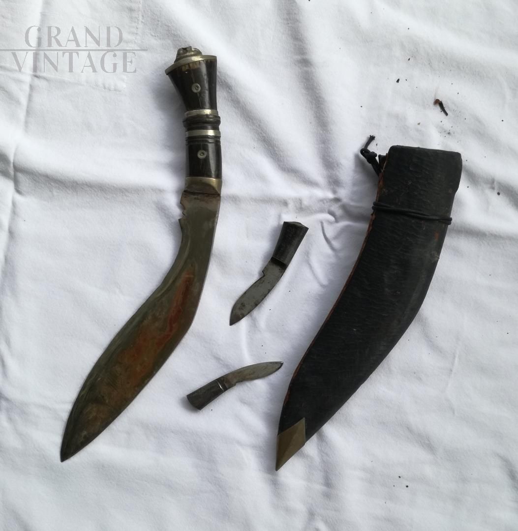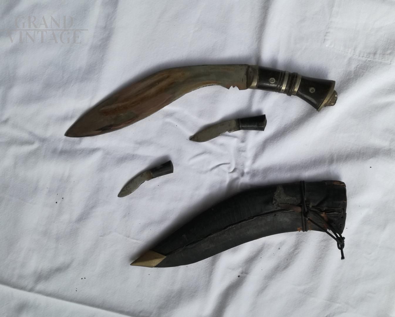 Set di arte africana anni '80 composto da un pugnale ricurvo e die coltellini, con custodia in cuoio con punta metallica. Il pugnale non e' affilato, il colore marrone sopra la lama è trasferito dal cuoio, non è ruggine. I coltelli sono in buono stato, la custodia in cuoio va riparata.