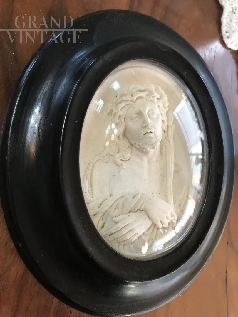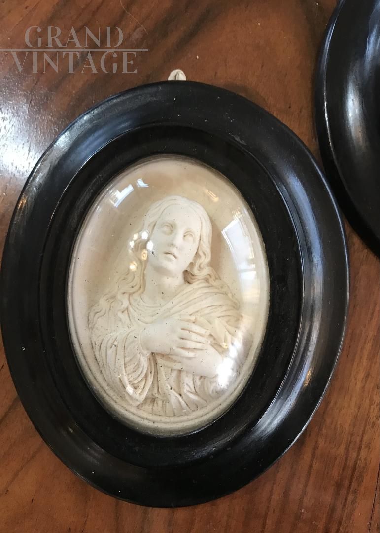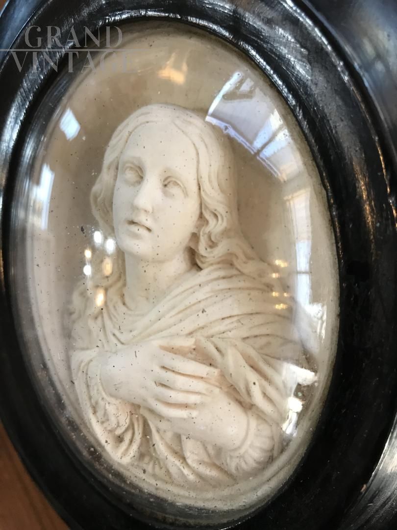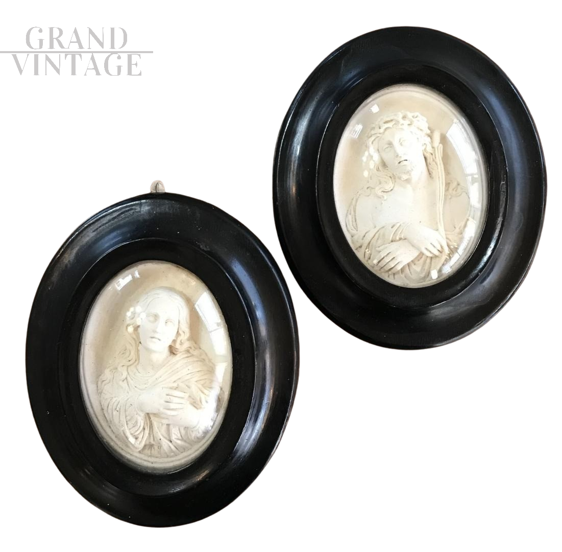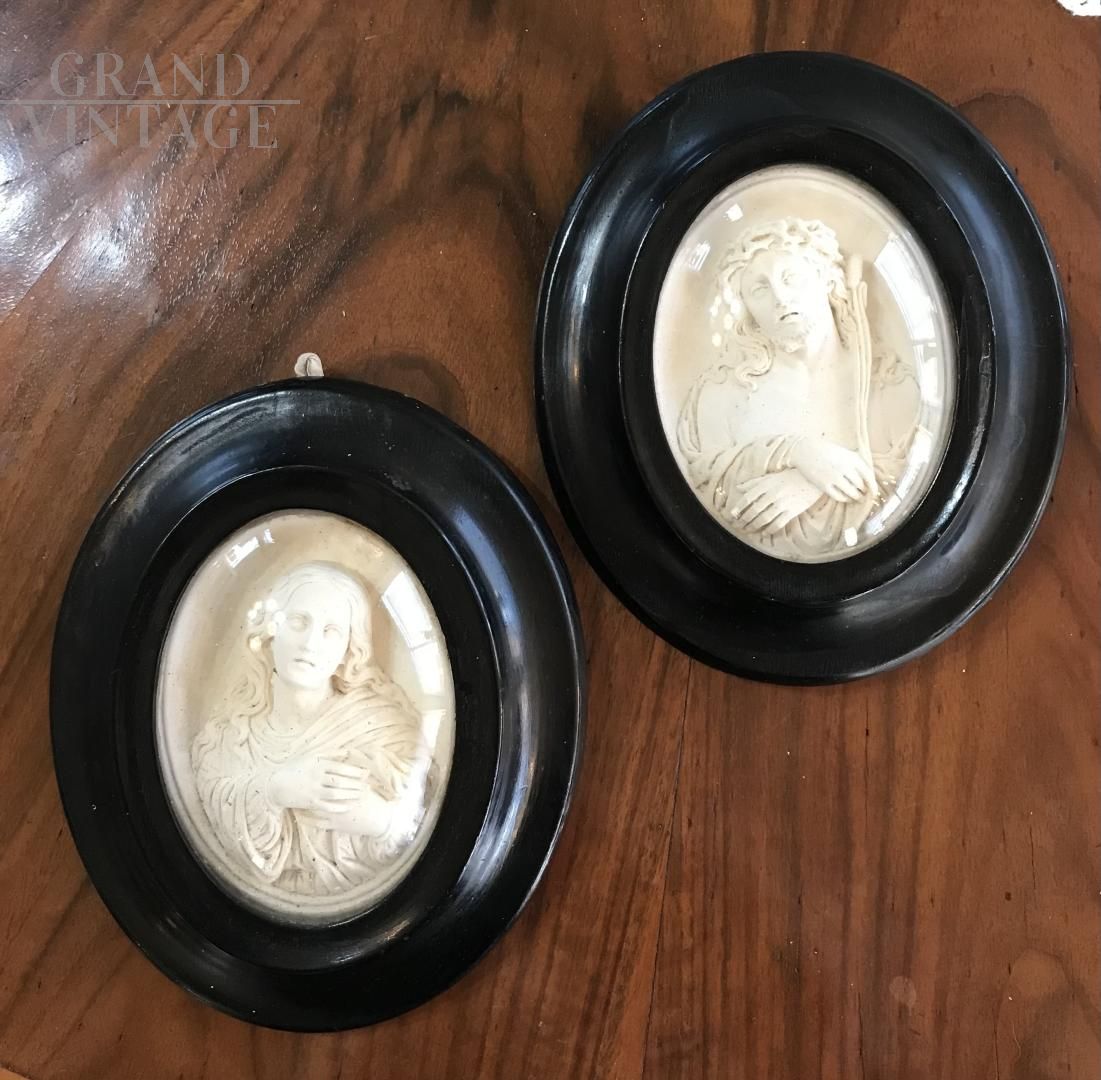 Coppia di quadri antichi Vittoriani in schiuma di mare o sepiolite scolpita a bassorilievo raffiguranti immagini sacre, con Gesù e Maria addolorati. Cornice originale in legno con vetro bombato protettivo.