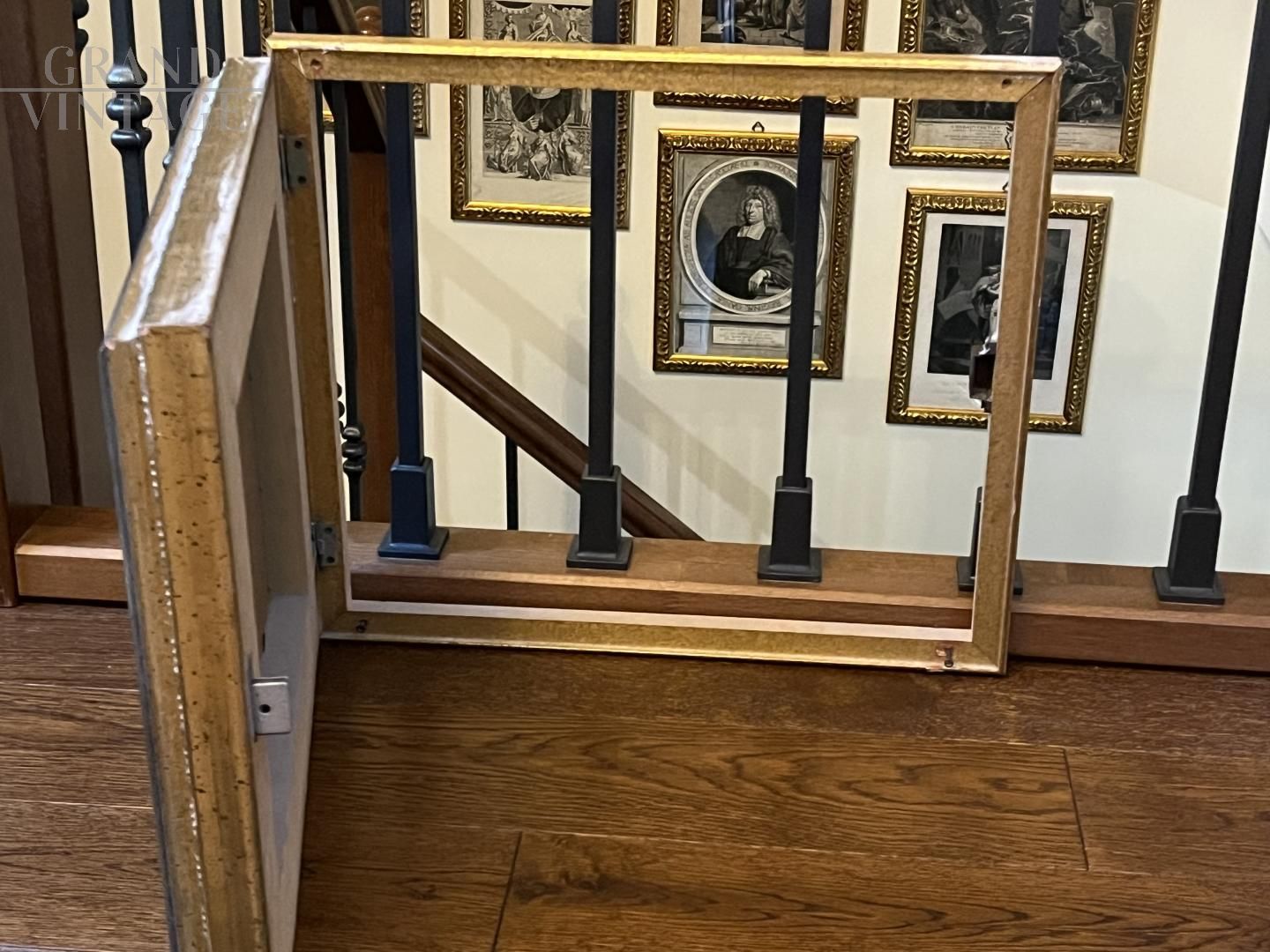 Pregevole dipinto copri cassaforte, ideale per ogni tipo di parete, raffigurante una scena paesaggistica. Opera realizzata ad inizio '900 e firmata in basso a destra. Cornice dorata e in ottimo stato con sistema di apertura per eventuale cassaforte o porta oggetti a muro.