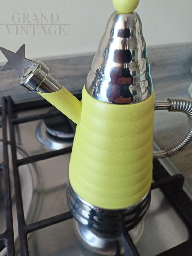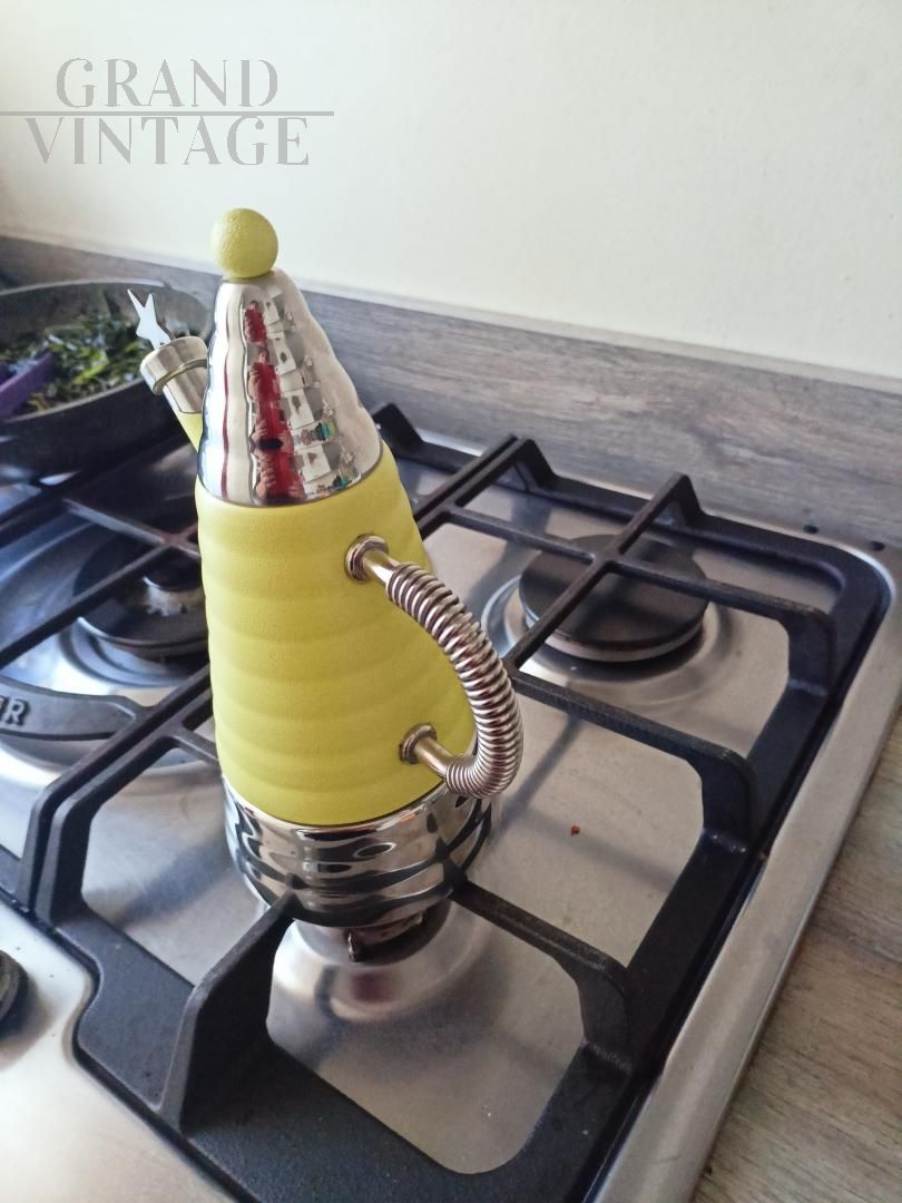 Bellissima caffettiera vintage Archimede di Stella Collection di eccellente manifattura italiana, in acciaio inox con un raro colore giallo e un fischietto avvitatore che segnala l'avvenuta preparazione del caffè. In ottime condizioni poiché mai usata, introvabile in questa versione. Un elegantissimo modo per servire il caffè . È una moka da 4 tazze ma ha un riduttore nell'imbutino che la rende da 2 tazze. Ha un design ancora attualissimo.