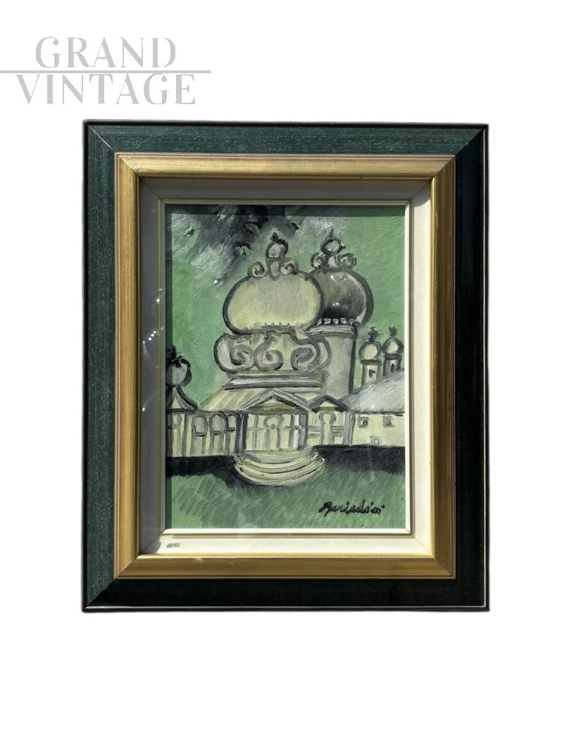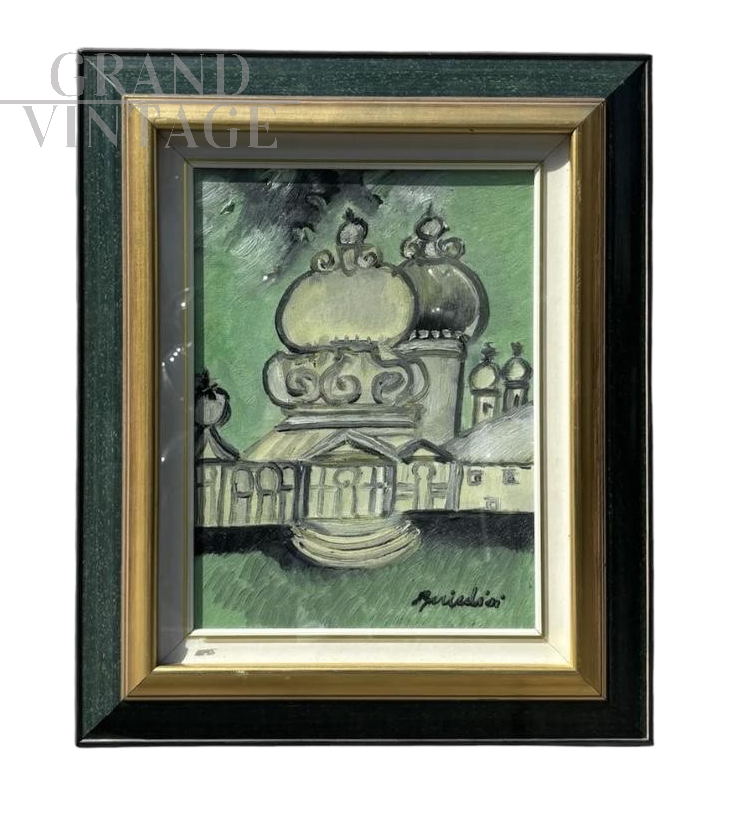 Dipinto olio su tela raffigurante la città di Venezia, realizzato da Remo Brindisi negli anni '70. Larghezza 50 cm, altezza cm 59 compresa cornice. Pittore verista del Novecento, nasce a Roma nel 1918. I suoi studi artistici lo portano a compiere molti viaggi, visitando città come Firenze, Parigi e Venezia fino a trasferirsi a Milano. Durante la seconda guerra mondiale fu chiamato a prestare servizio e fu imprigionato dai tedeschi ma, riuscito a fuggire, si rifugiò a Venezia fino alla Liberazione. Tra gli anni ‘40 e ’50 partecipò alle Biennali veneziane ed anche alle Quadriennali romane, con tendenze vicine allo stile informale. Negli anni ’70 fu anche presidente della Triennale di Milano.