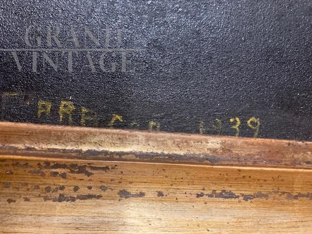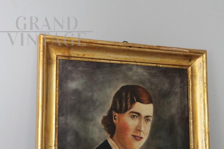 Dipinto olio su tela con ritratto di ragazza datato 1939, periodo art déco, completo di cornice dorata coeva. In ottimo stato.