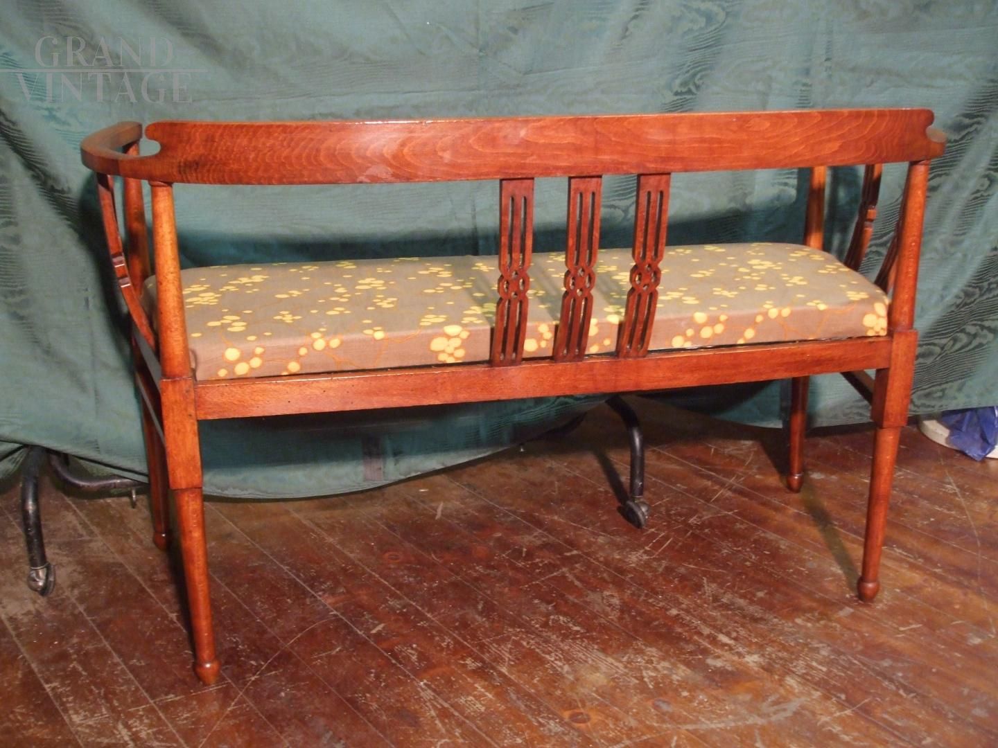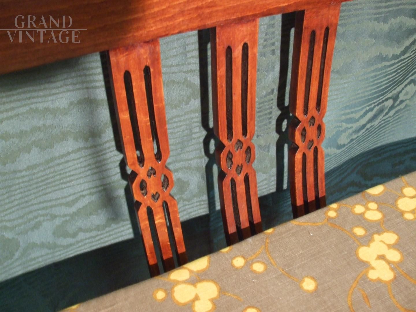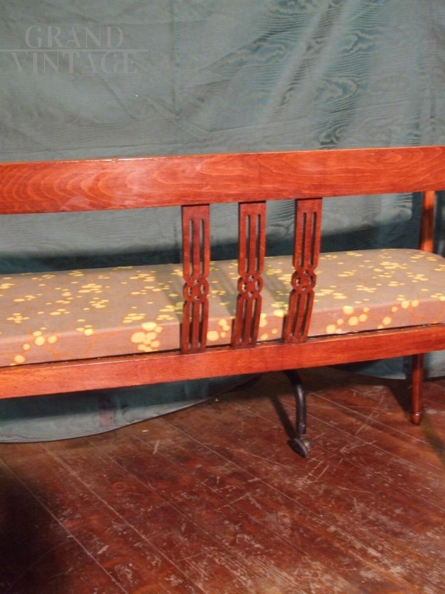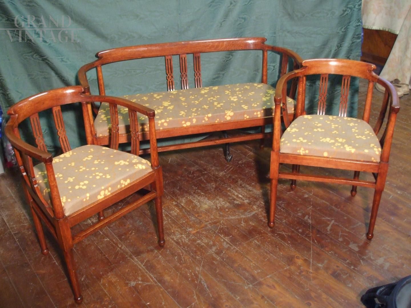 Salotto vintage anni '20 composto da divano e due poltroncine in legno di faggio, ritappezzato con stoffa italiana negli anni '50.