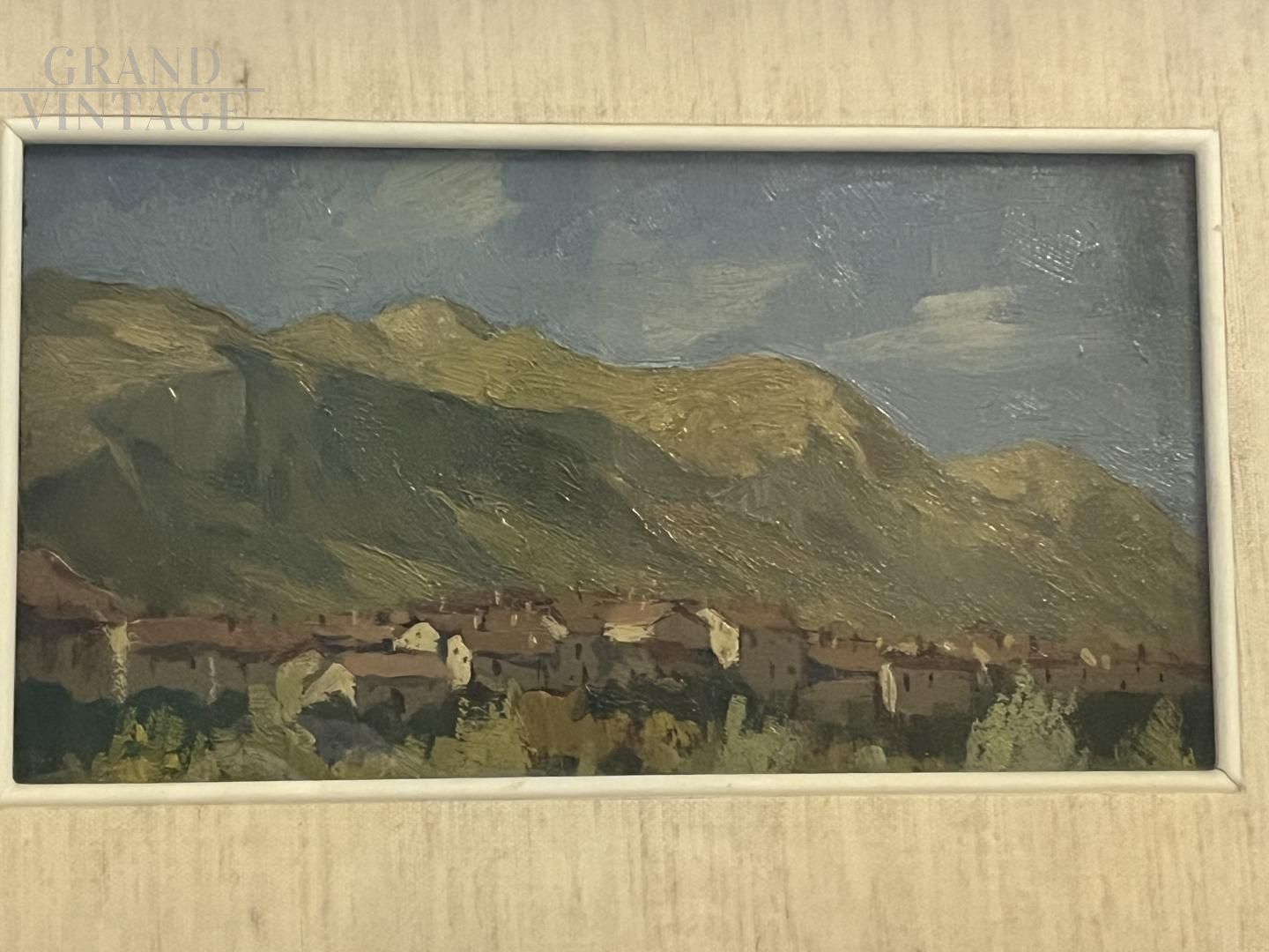 Dipinto realizzato ad olio su tavola dal pittore milanese Sandro Perini, raffigurante una veduta dei monti della Brianza. L’opera è datata e firmata dall’artista sul retro, si presenta in ottime condizioni di conservazione e non necessita di alcun intervento di restauro.