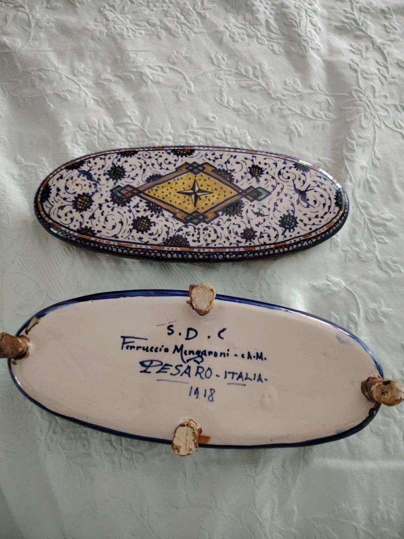 Scatolina cofanetto in maiolica di Pesaro firmata Ferruccio Mengaroni e datata 1918.