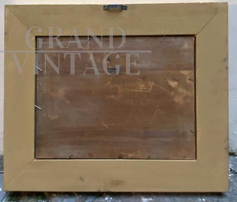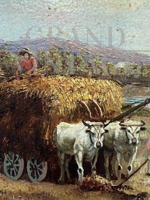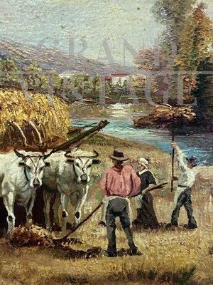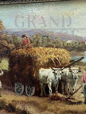Dipinto con scena campestre raffigurante raccolta del fieno, scuola di Posillipo. Sullo sfondo un paesaggio campestre. Il quadro ispira un sentimento di tranquillità e dolcezza.