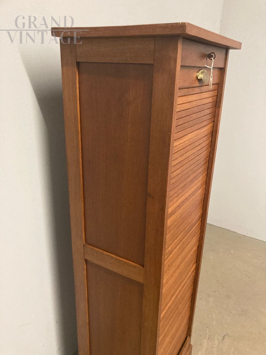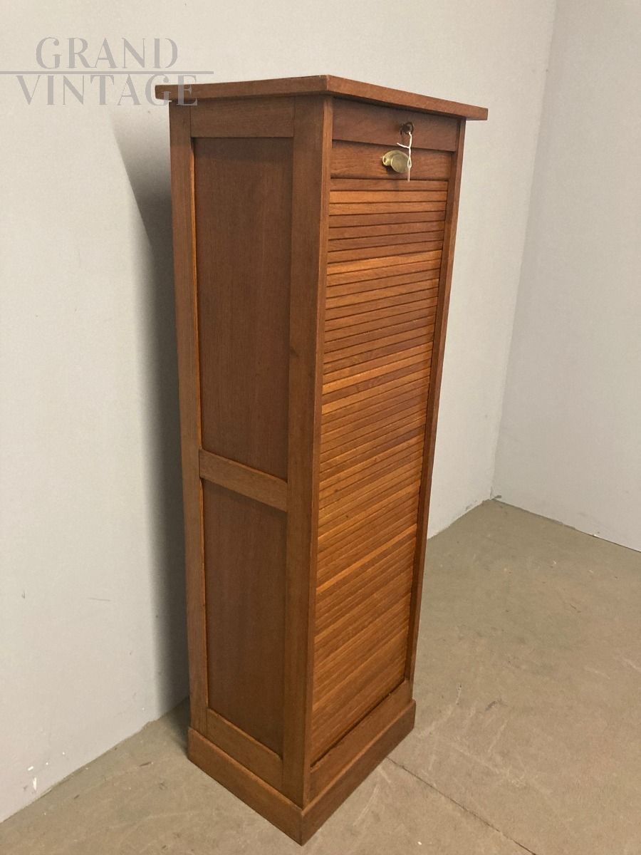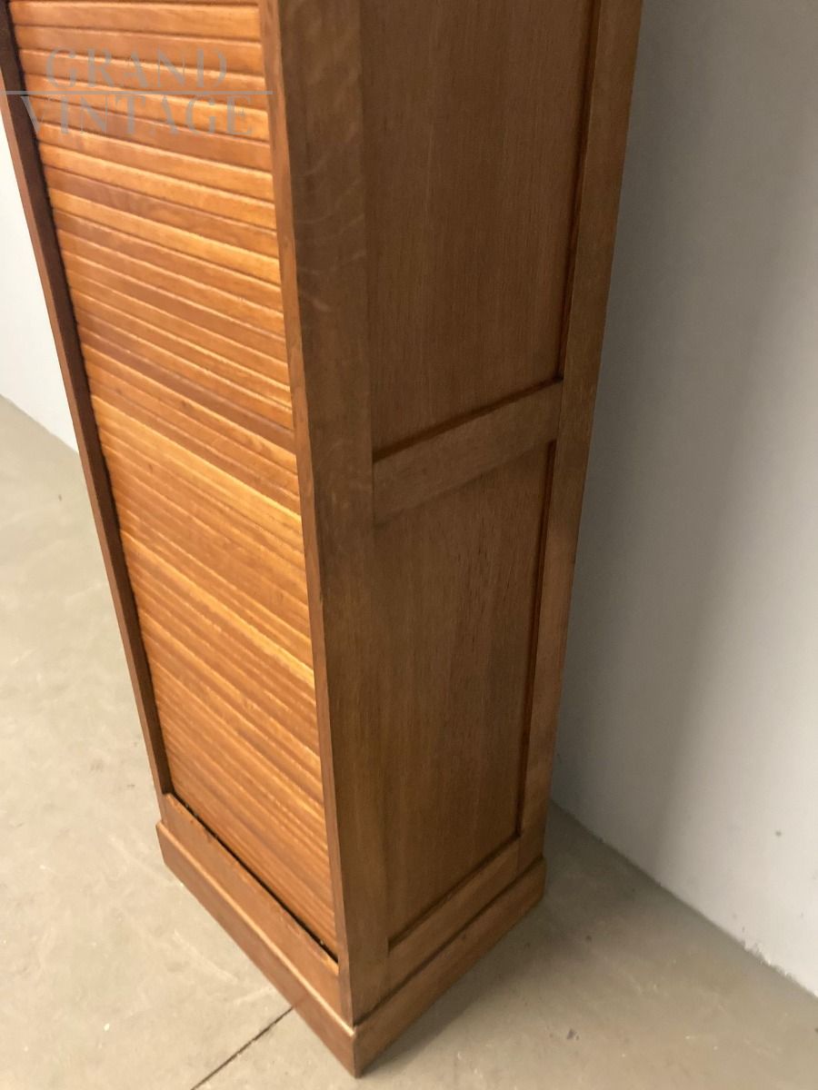 Classificatore vintage da ufficio a serrandina singola, modernariato anni '40, in rovere massello, perfettamente restaurata mantenendo il suo colore originale. Al suo interno, 8 ripiani removibili.