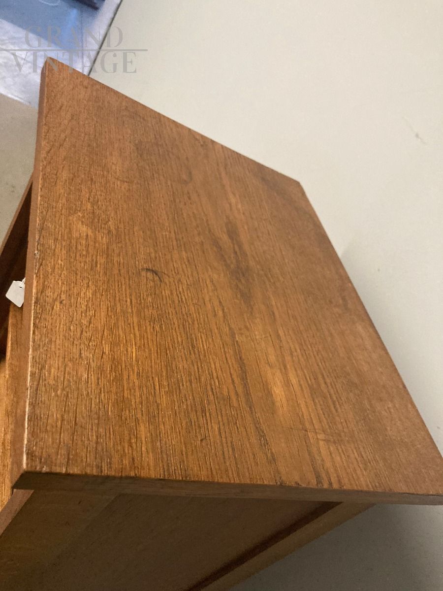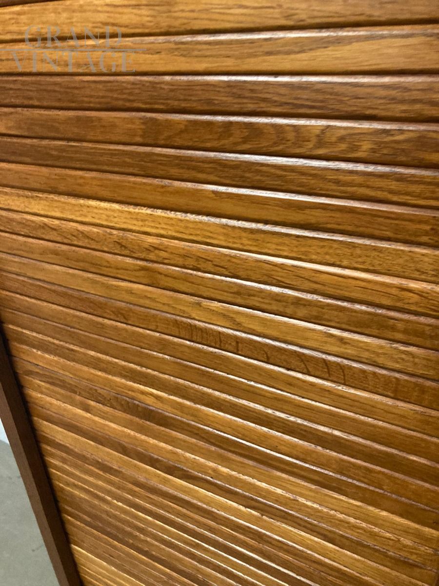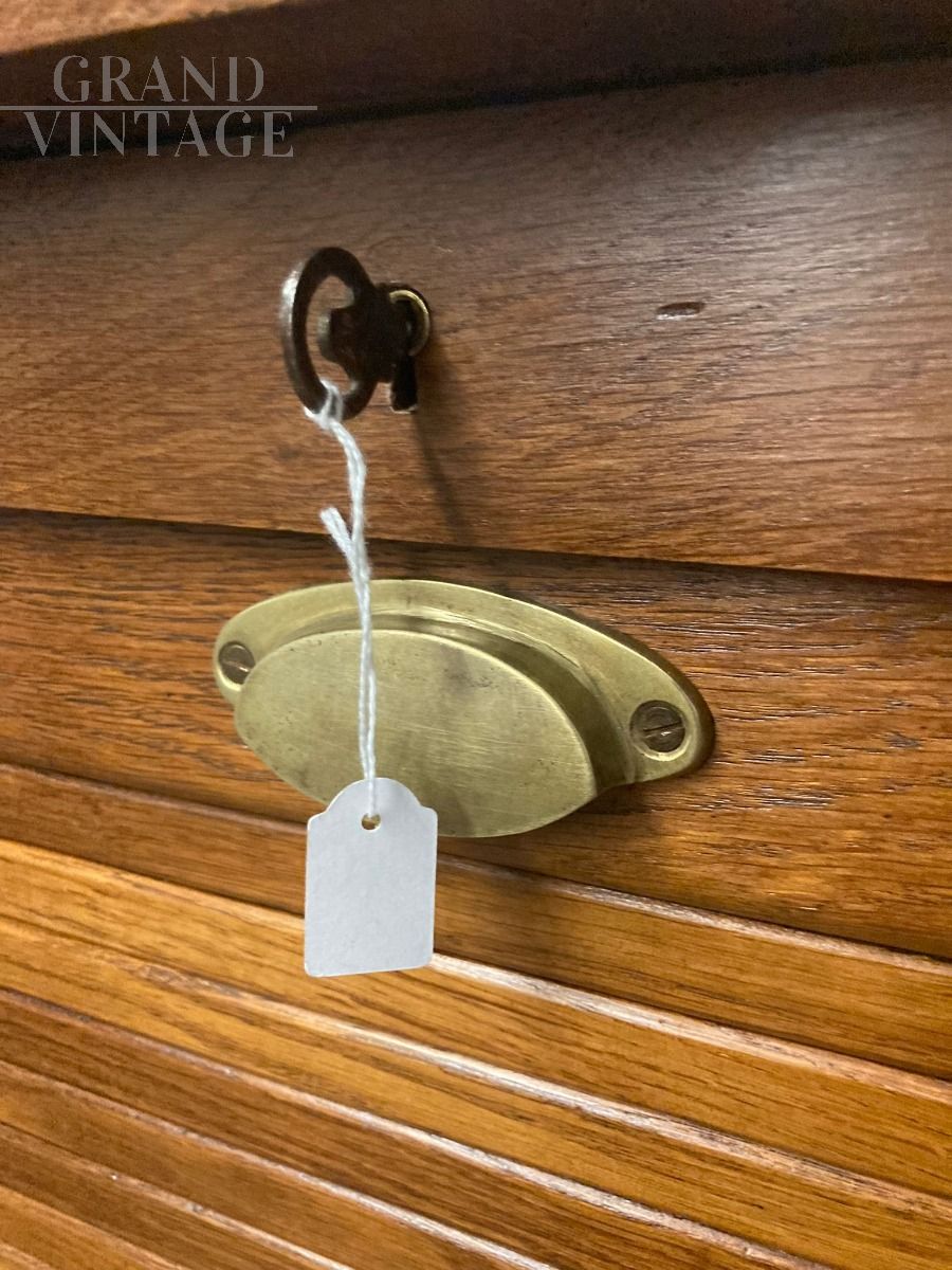 Classificatore vintage da ufficio a serrandina singola, modernariato anni '40, in rovere massello, perfettamente restaurata mantenendo il suo colore originale. Al suo interno, 8 ripiani removibili.