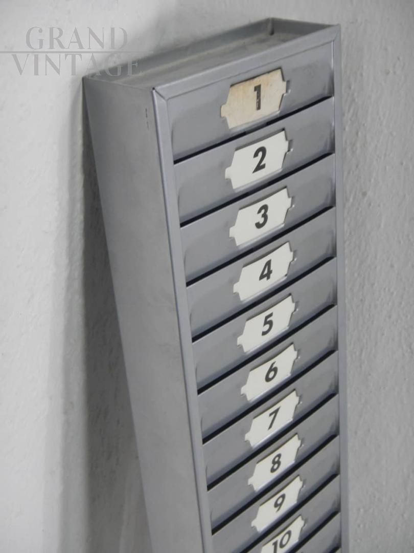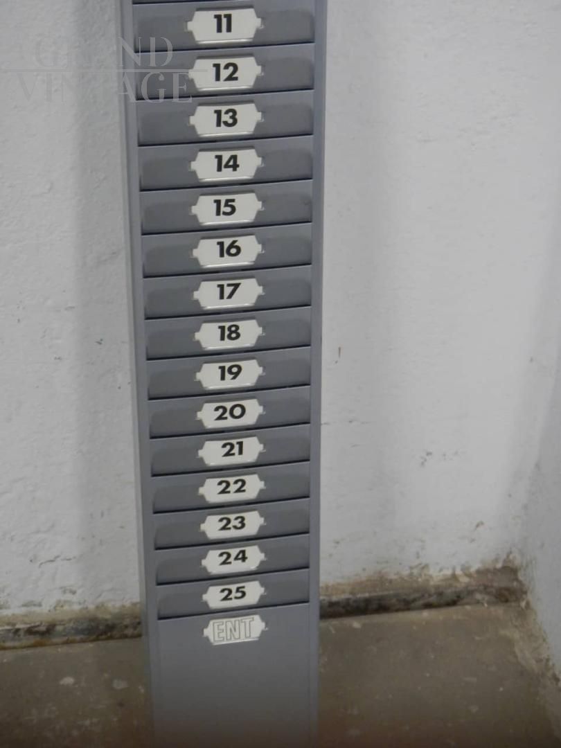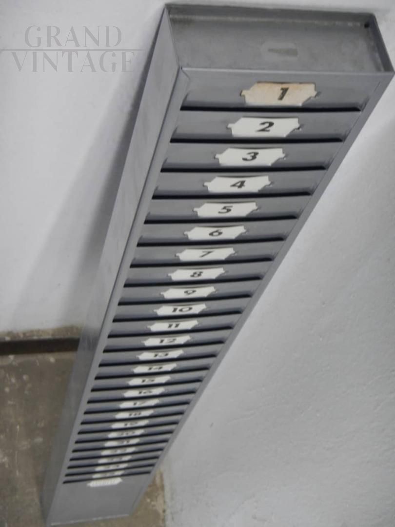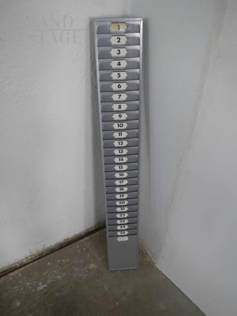 Schedario piccolo classificatore da officina o da ufficio per piccolidocumenti, cartellini badge o cartoncini per il conteggio delle entrate e uscite degli operai. In metallo grigio con gancio per appenderlo, dispone di 25 caselle con numeri in carta bianca. Il numero 1 presenta dei difetti.