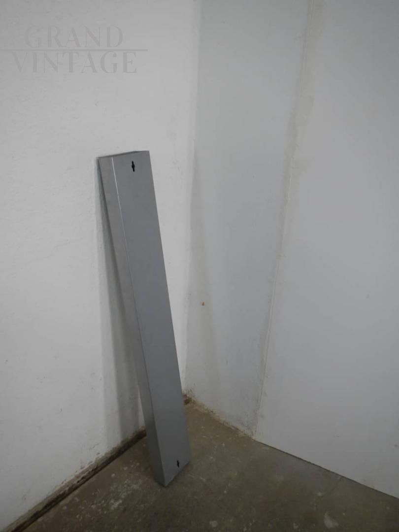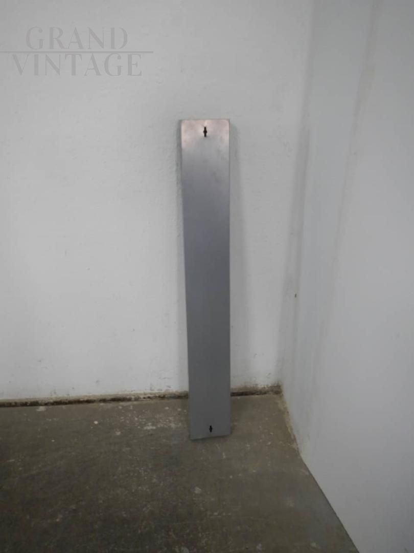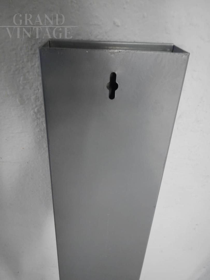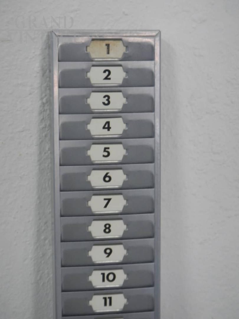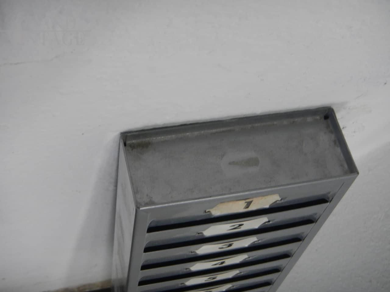 Schedario piccolo classificatore da officina o da ufficio per piccolidocumenti, cartellini badge o cartoncini per il conteggio delle entrate e uscite degli operai. In metallo grigio con gancio per appenderlo, dispone di 25 caselle con numeri in carta bianca. Il numero 1 presenta dei difetti.