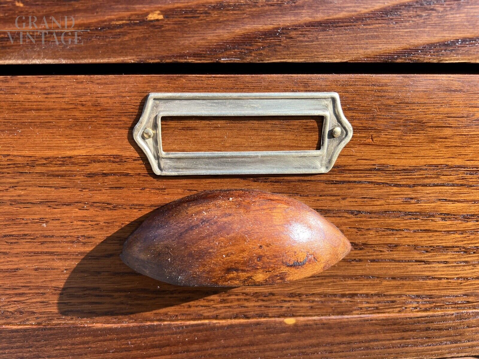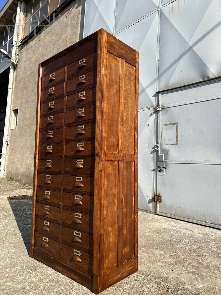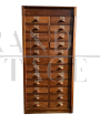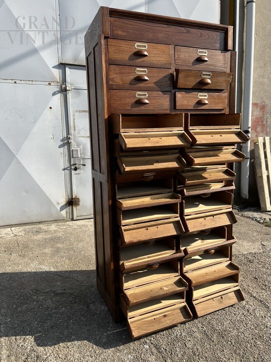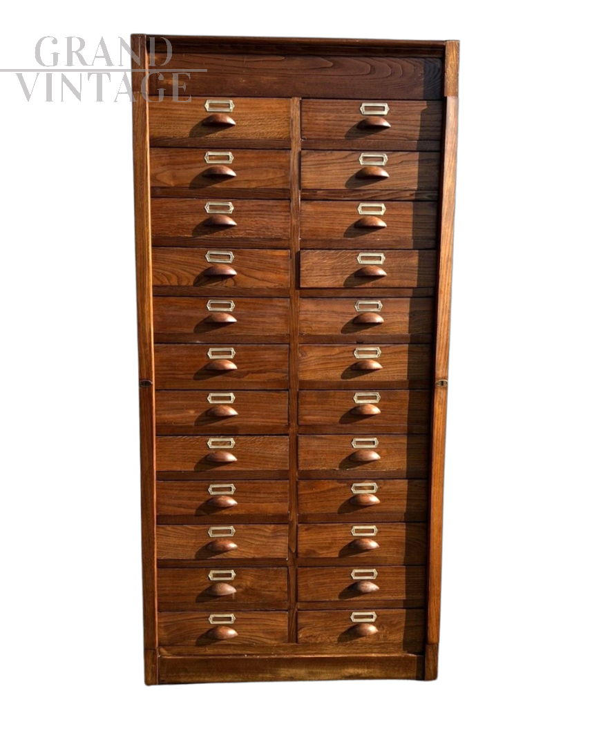 Bellissimo schedario da ufficio vintage a cassetti in legno di quercia, dotato di 24 cassetti con fronte apribile, proveniente da uno studio notarile di Verona. In ottime condizioni, da notare le bellissime venature del legno e le dimensioni: Larghezza 89,5 cm, Profondità 46,5 cm, altezza 187 cm.