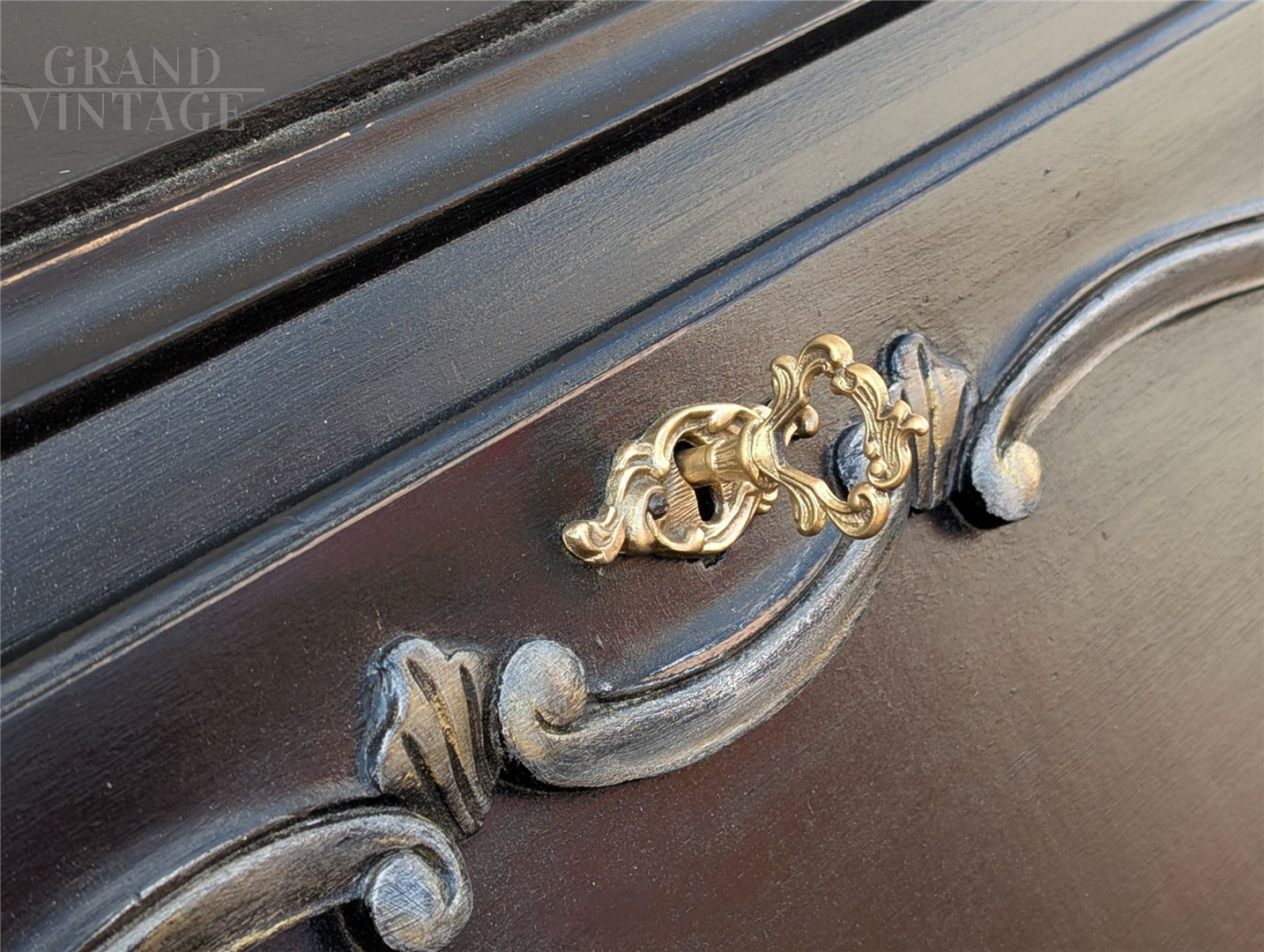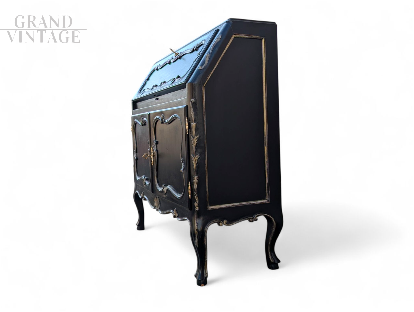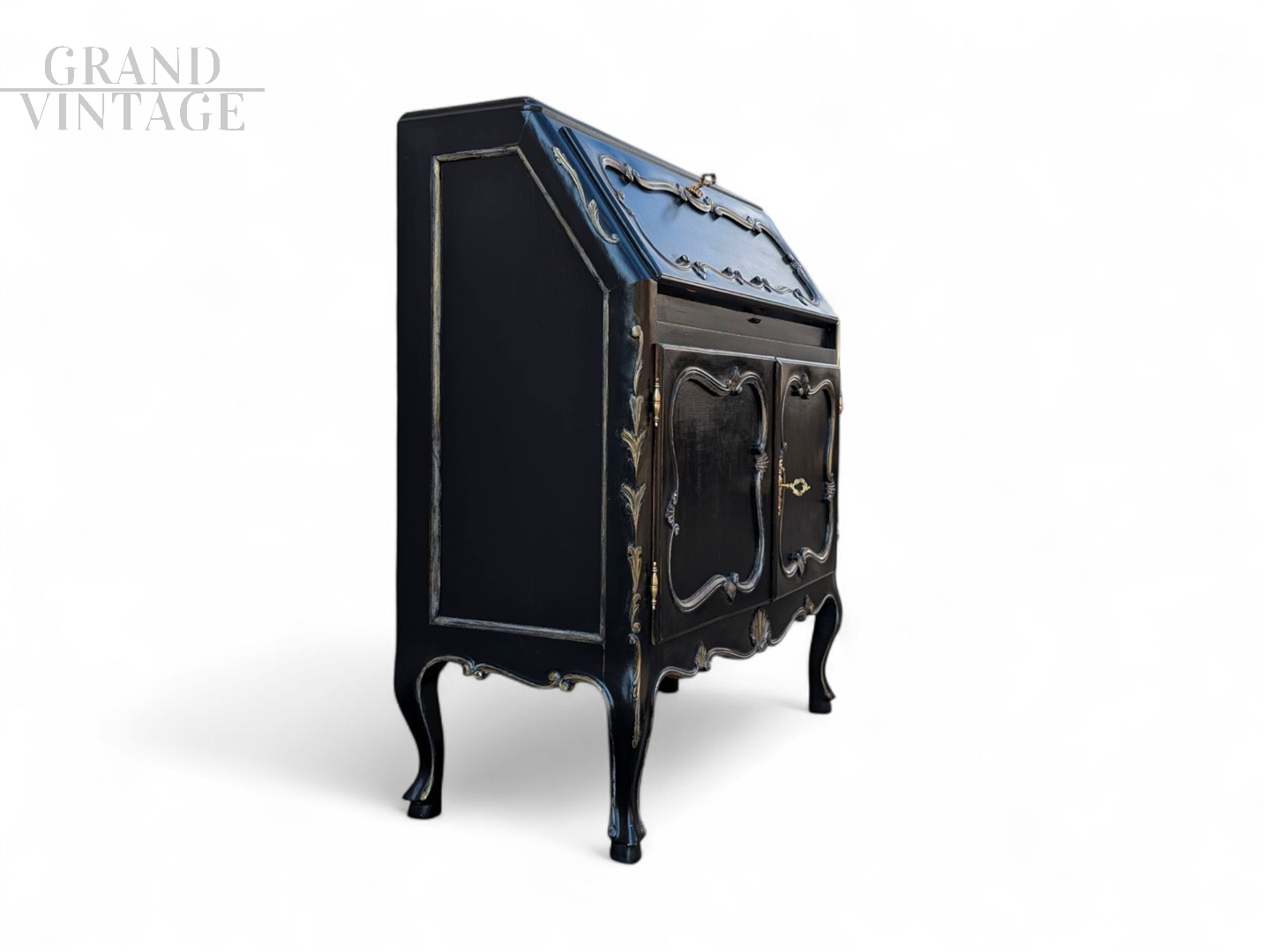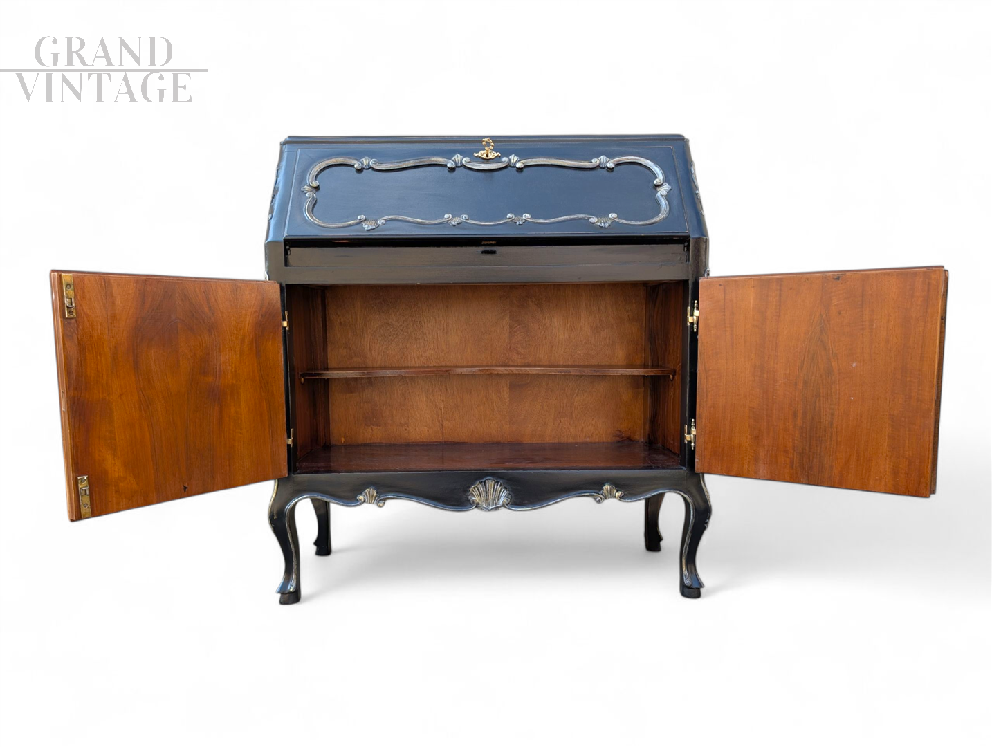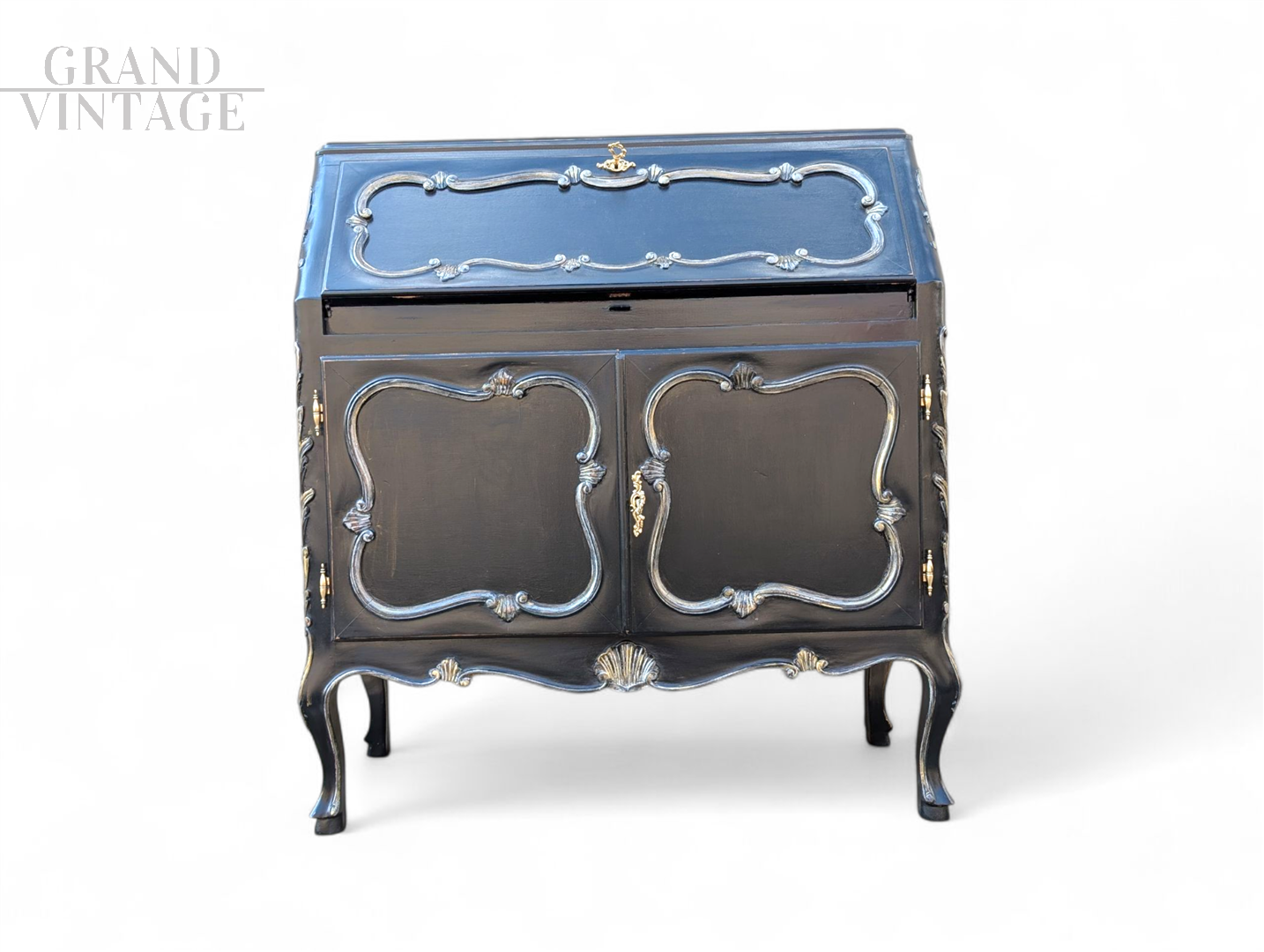 Elegante scrittoio realizzato in legno massello di noce, finemente lavorato in stile barocco francese. La struttura, solida e riccamente decorata, presenta linee sinuose e dettagli scolpiti a mano, evidenti nei rilievi che adornano ante e fianchi. La finitura è stata realizzata in un raffinato nero satinato, con patinature argentate che ne esaltano le forme e i particolari ornamentali. La ribalta superiore si apre svelando un pratico vano con quattro cassetti interni e uno spazio centrale a giorno, perfetto per organizzare documenti e piccoli oggetti. Nella parte inferiore, due ante a battente custodiscono un ampio vano con ripiano, ideale per riporre libri o materiali da ufficio.