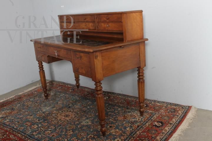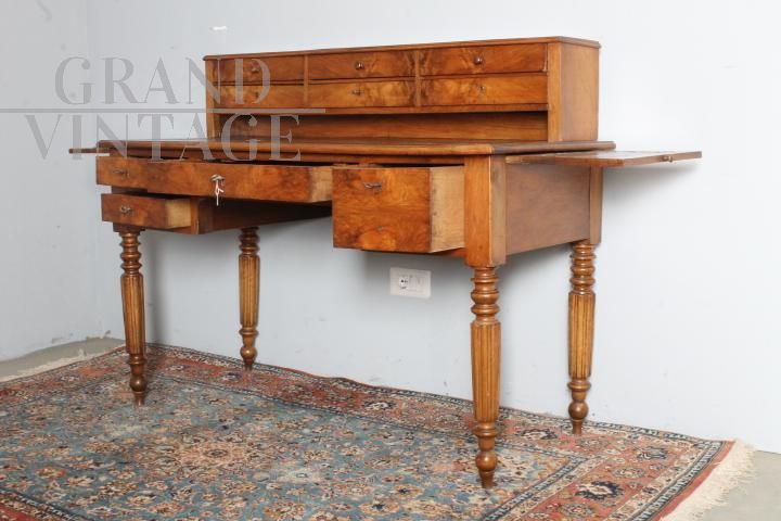 Antica scrivania scrittoio da parete di metà '800, epoca Luigi Filippo, realizzato in noce e radica di noce con cassetti, cassettini sul piano con pelle antica e tiretti. Bellissima la qualità realizzativa, con gambe scanalate e cassetti in radica a doppio livello. Mobile restaurato e rifinito anche sul retro, adatto per essere posizionato a centro stanza.