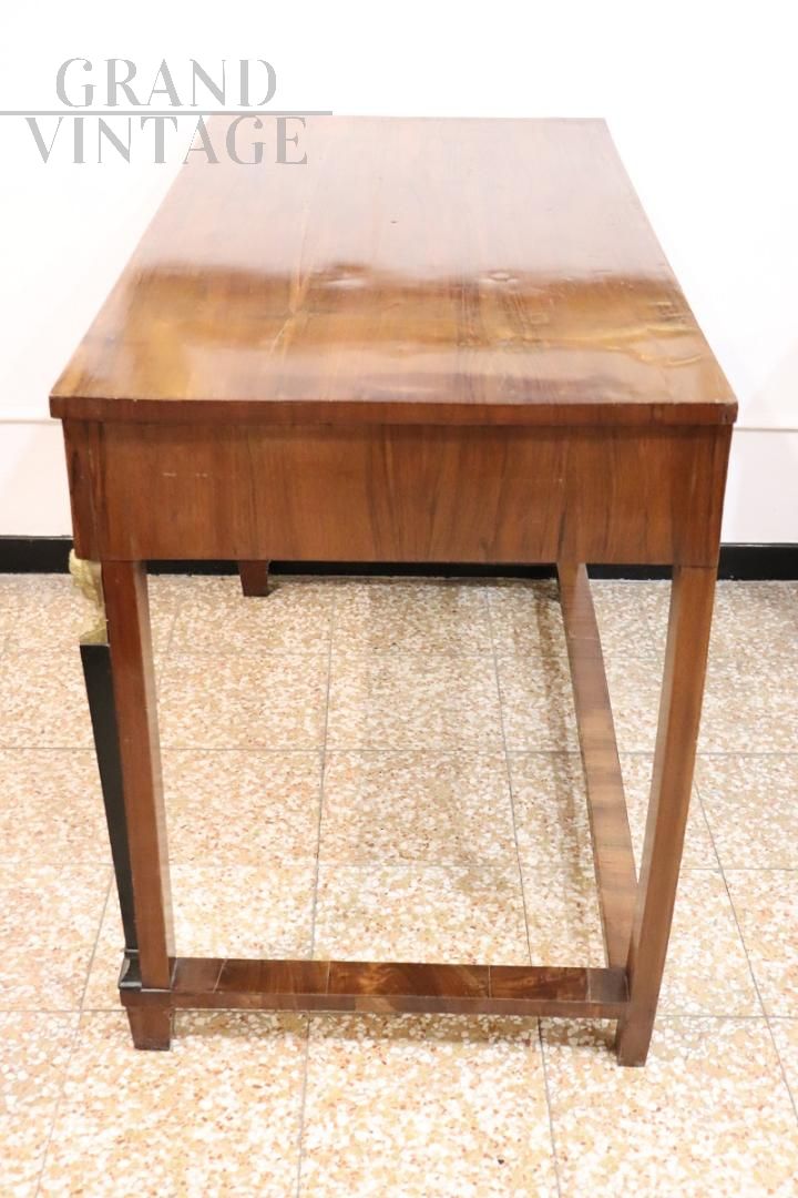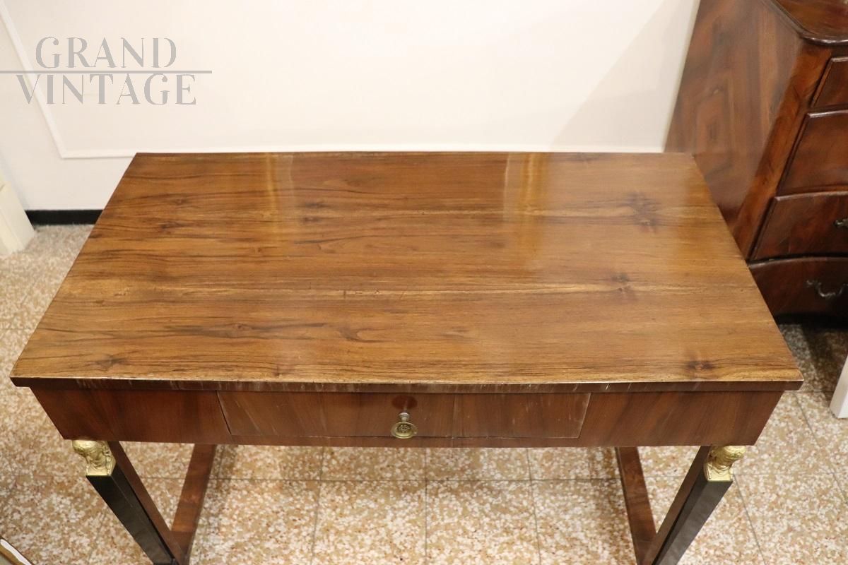 Scrivania antica italiana risalente ai primi anni del XIX secolo, durante il sontuoso periodo Impero. Questa scrivania, realizzata in noce pregiato, è caratterizzata da una raffinata linearità. Sul fronte, due lesene nere con un capitello a cariatide in bronzo finemente dorato creano un accento visivo che cattura l'attenzione e aggiunge un tocco di lusso. Dal punto di vista pratico, è presente un cassetto per riporre piccoli oggetti e una superficie ampia abbastanza per essere perfetta per svolgere lavoro da ufficio in casa. Si noti che questa scrivania è stata progettata per essere collocata contro una parete; il retro è in legno grezzo. spazio disponibile dal pavimento per le vostre gambe è di 60 cm. Prezzo trattabile.