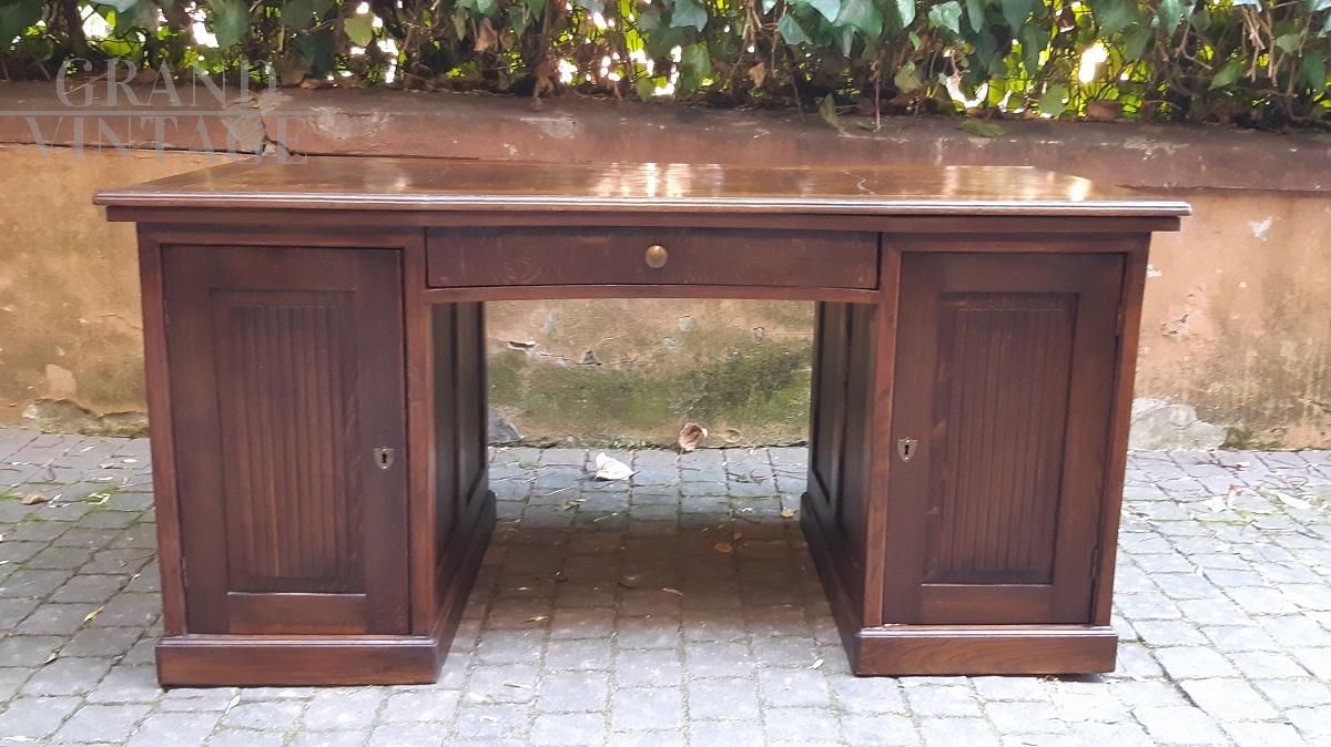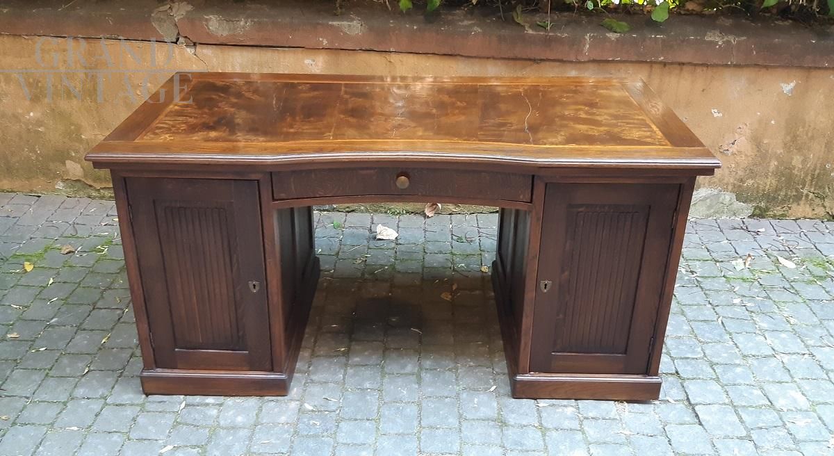 Scrivania lombarda antica da centro dell'800 in legno di rovere con piano in radica di gattice e vani capienti ai lati, di cui uno con cassetti estraibili. Curiosa scrivania dal disegno articolato, che va ad offrire, all'interno dello sportello di sinistra, un ampio spazio a ripiano, e 4 pratici cassetti all'interno dello sportello lato destro. Il piano filettato e radicato le dona importanza e le modanature a canne d'organo sulle pannellature la caratterizzano, mentre l'accogliente postazione a mezzaluna rientrante la distingue dalla moltitudine.