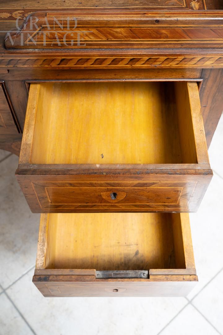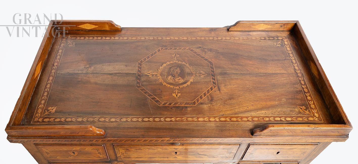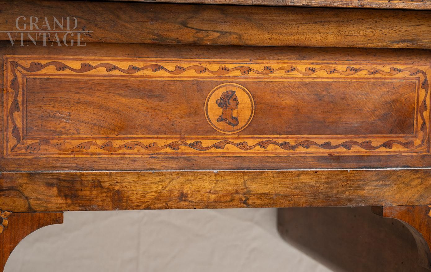 Scrivania antica da centro stanza Luigi XVI napoletana in massello di noce appartenente alla metà del XVIII secolo. Il piano è circondato da una bella ringhiera interamente intarsiata a motivo geometrico ed ha al centro un intarsio raffigurante figura mitologica. Il fronte è caratterizzato da cinque cassetti messi in risalto da intarsi geometrici e presenta uno scrittoio sopra al cassetto centrale. Il fronte opposto a quello frontale presenta lo stesso impianto con la particolarità di avere al posto dell'intarsio geometrico delle figure mitologiche. I quattro piedi hanno la forma classica ad obelisco tipico del periodo Luigi XVI. Provenienza: Napoli XVIII secolo.