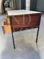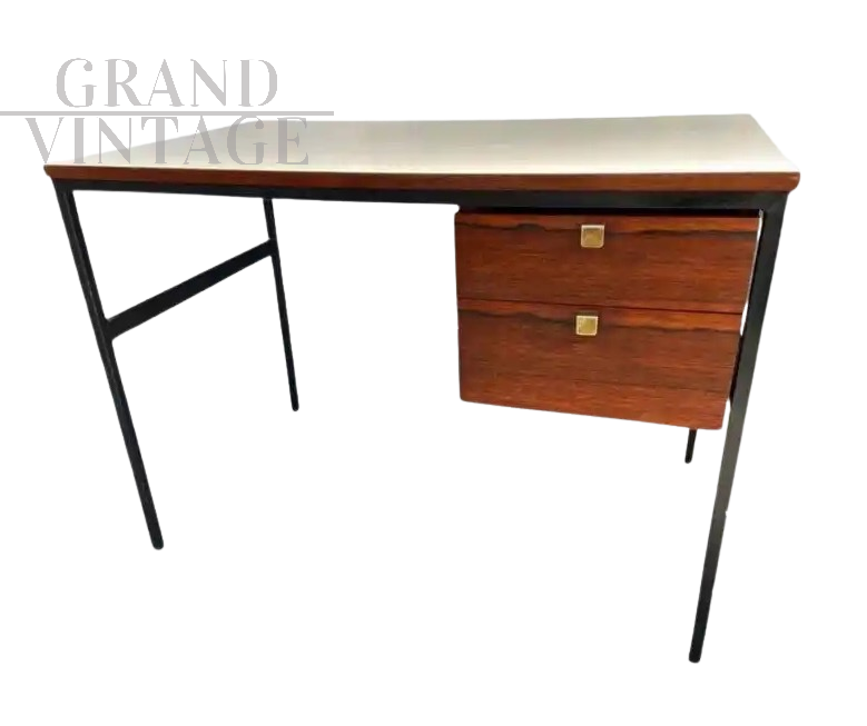 Scrivania design di Pierre Paulin per Minvielle in pregiato palissandro con piano resistente in melamina bianca, modernariato francese del 1955.