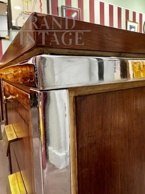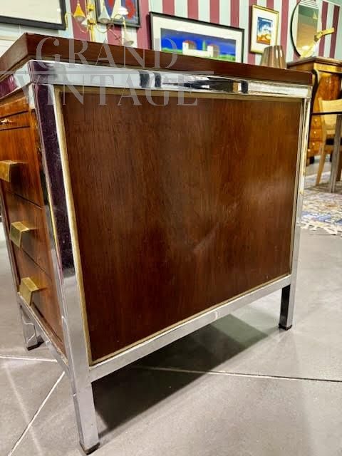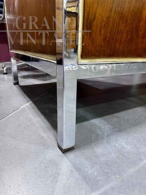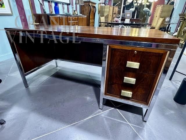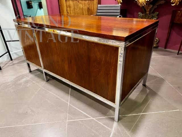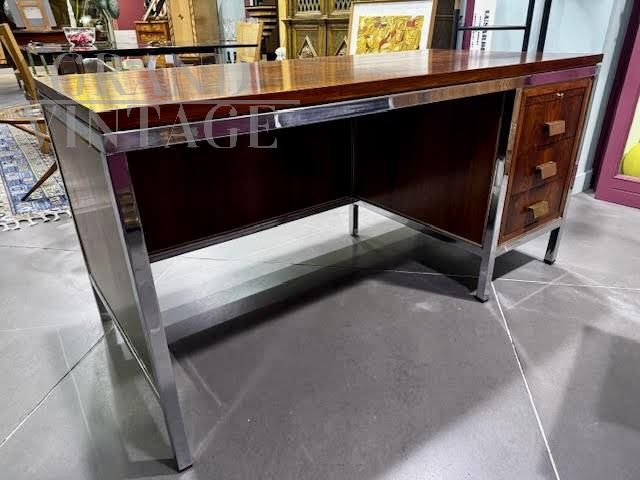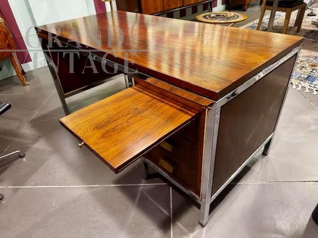 Scrivania in acciaio cromato e palissandro nello stile di Ettore Sottsass, della fine degli anni '60. La scrivania è dotata di un tiretto e tre cassetti sul lato destro. Risulta restaurata, robusta e in ottimo stato di conservazione.