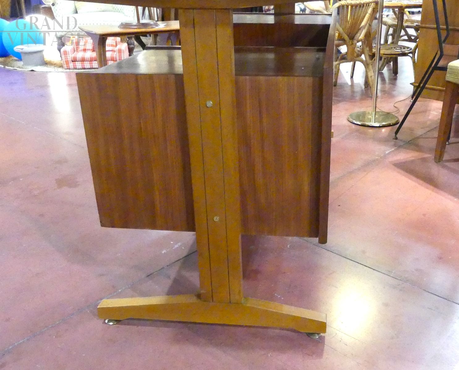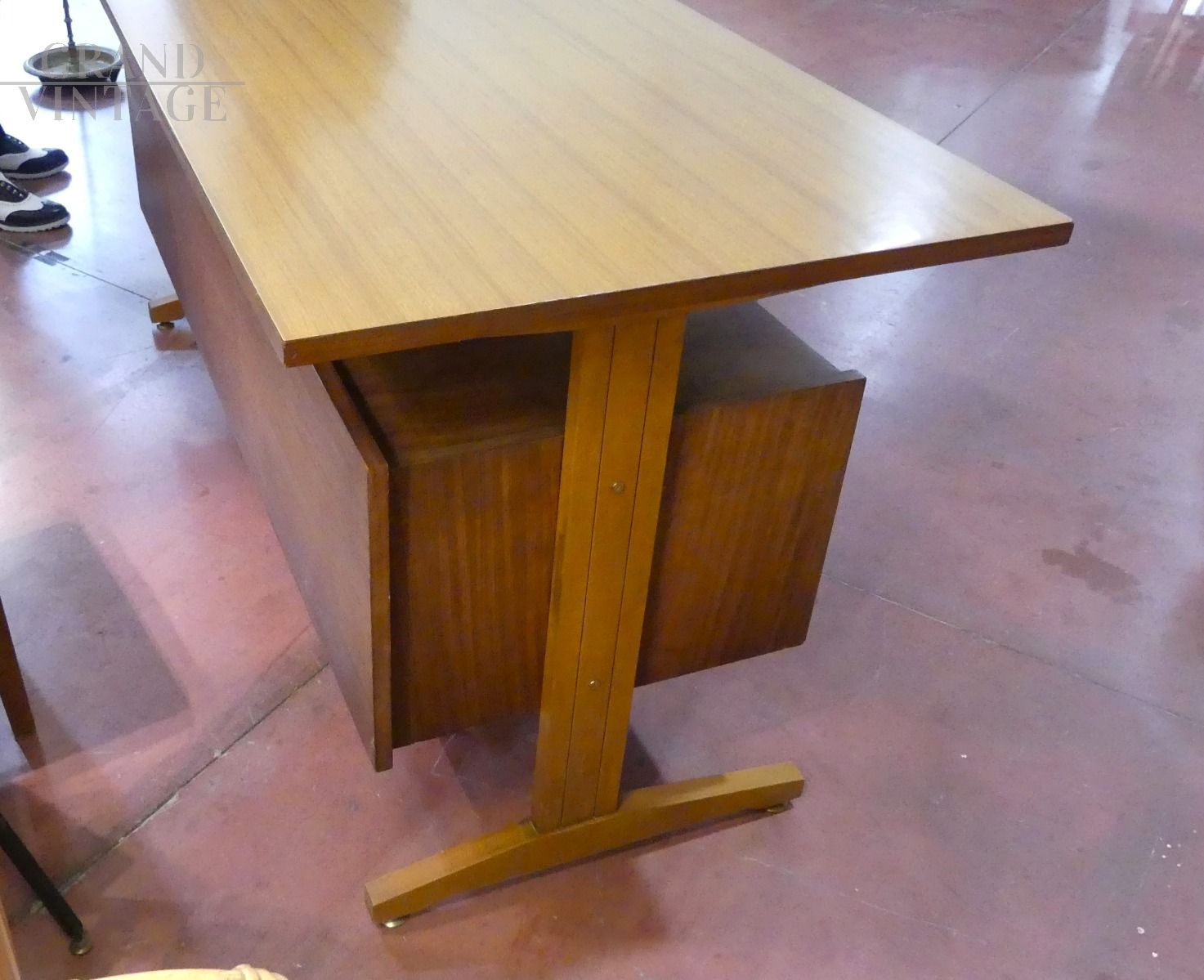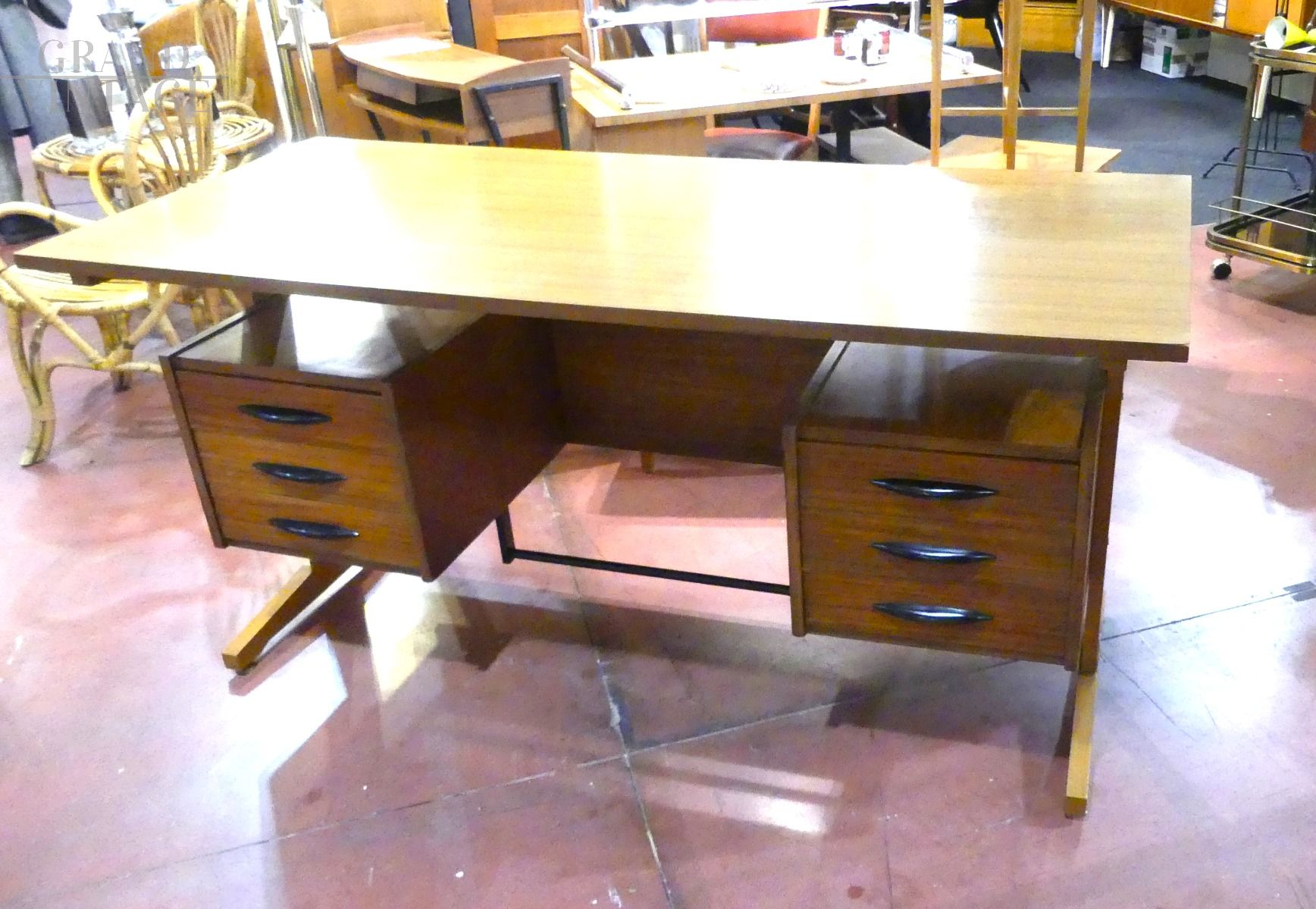 Scrivania vintage da centro in legno di teak, con doppia cassettiera ai lati, poggiapiedi in ferro e piedini in ottone regolabili.