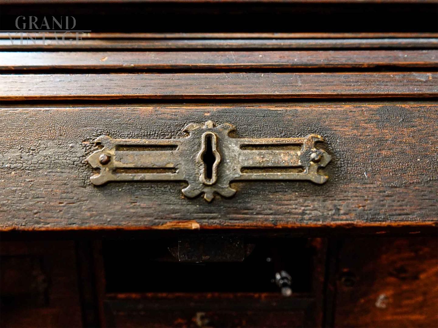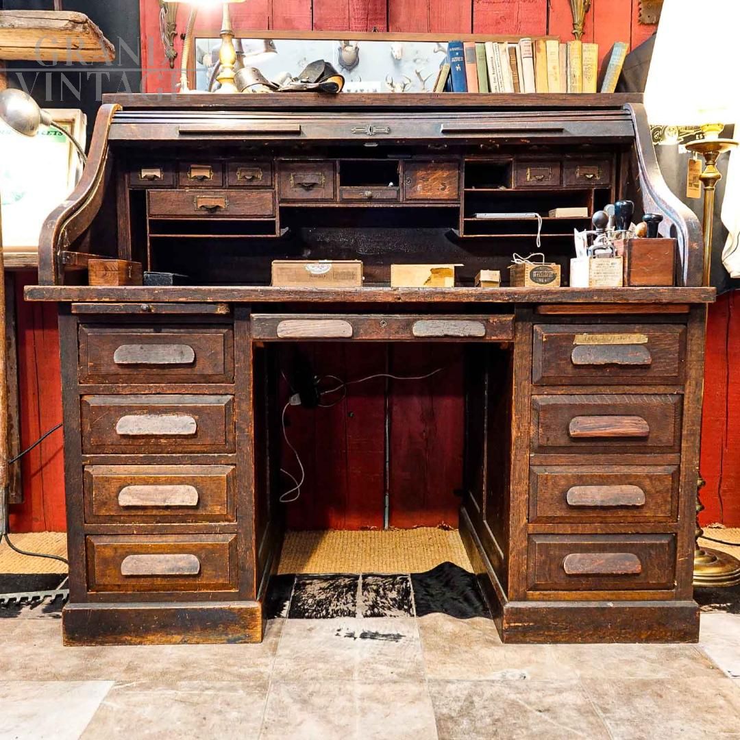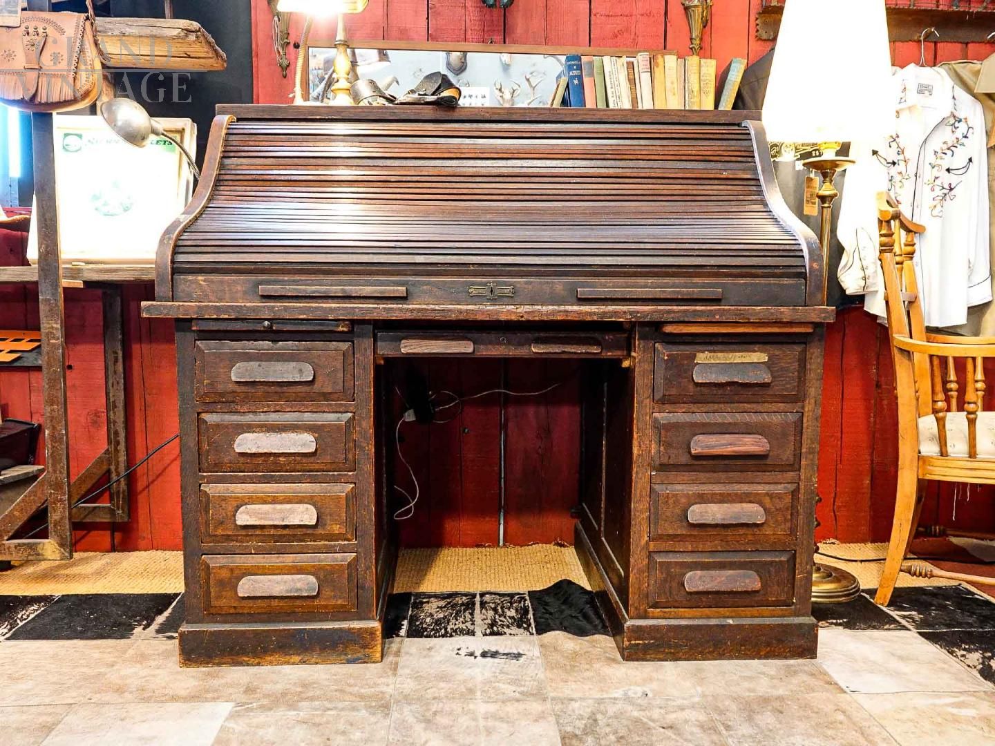 Massiccia e ricca di fascino d’altri tempi, questa scrivania vintage Western americana con chiusura a rullo sprigiona carattere con ogni suo dettaglio. Dotato di numerosi cassetti e vani, è perfetta per custodire e organizzare con stile.